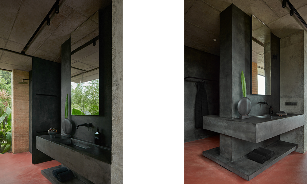 Nefrit Villa (nefrit = jade, villa oscura) es un reflejo de la energía yang. En la villa Nefrit puedes sentir la conexión con la tierra y la selva. Aquí, también, el concepto de color elegido es una reacción a estas energías y el color rojo terracota del piso de concreto transmite la sombra del suelo local al interior de la casa.