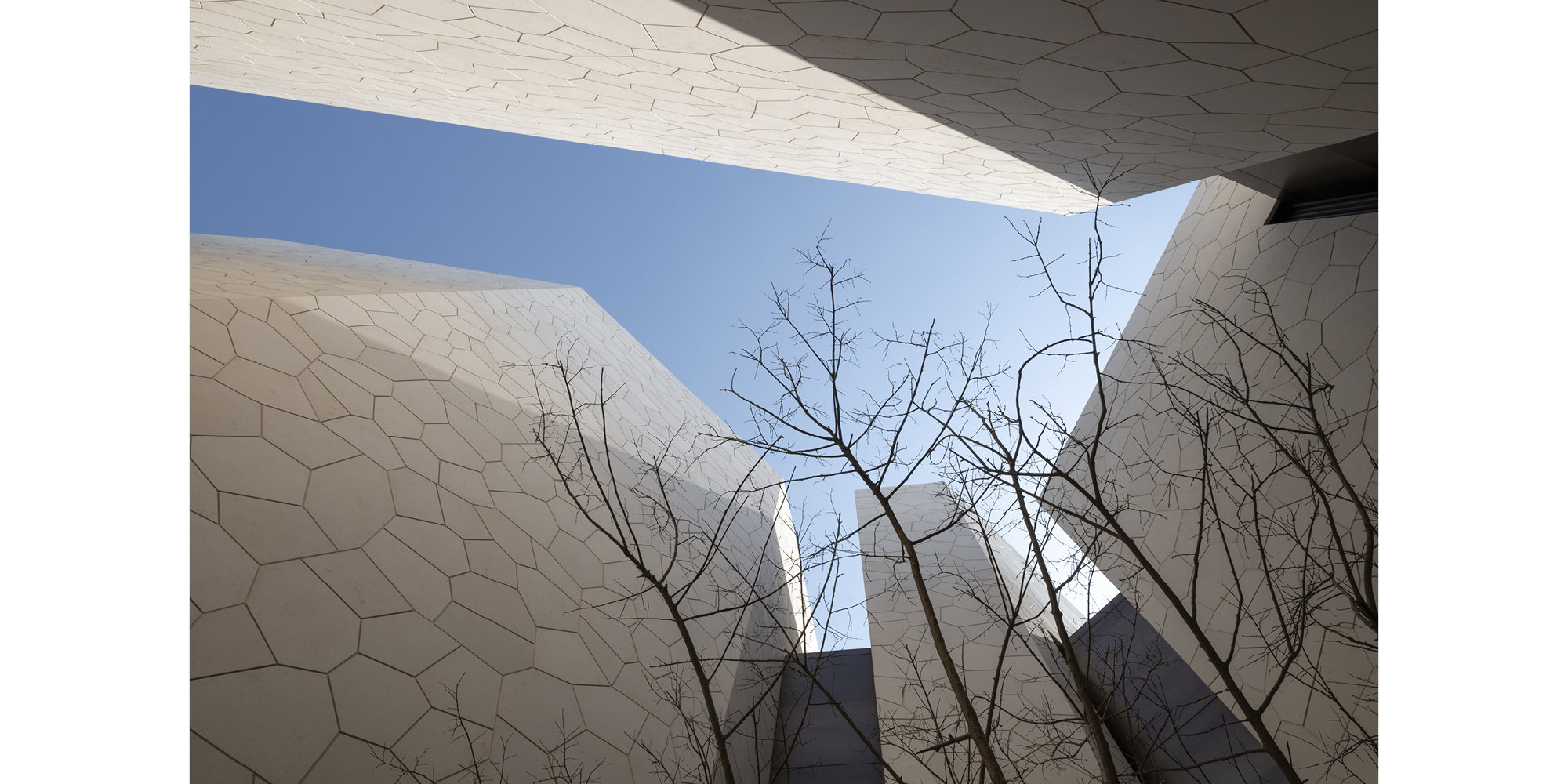 - La fachada está hecha de un sistema compuesto de piedra saudí ligero y está diseñada para ser deconstruida y reensamblada de manera eficiente, o reconfigurada por completo, para cumplir con diferentes requisitos en una ubicación futura. Ha sido diseñado y fabricado para dar la apariencia de permanencia.