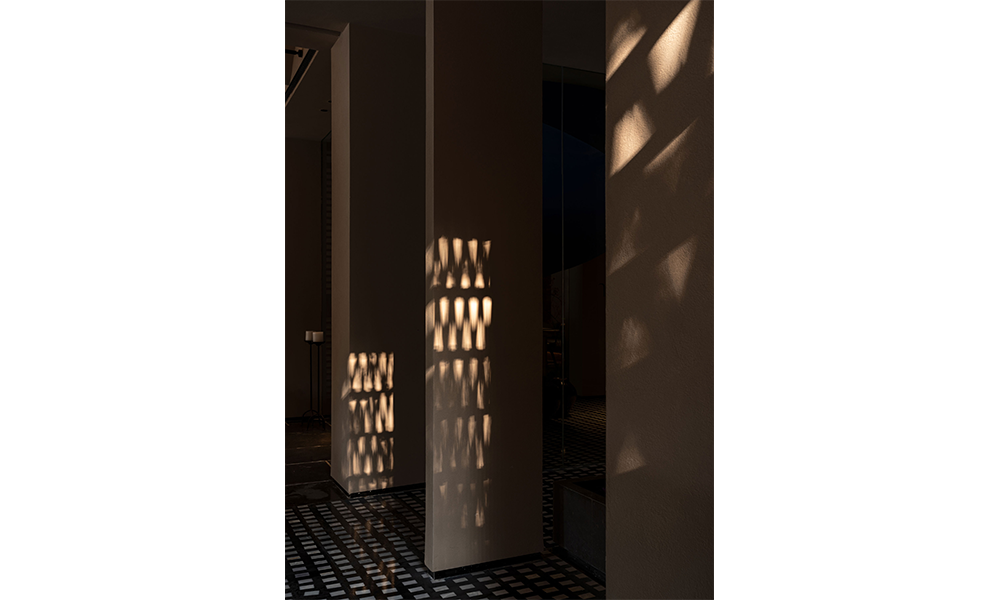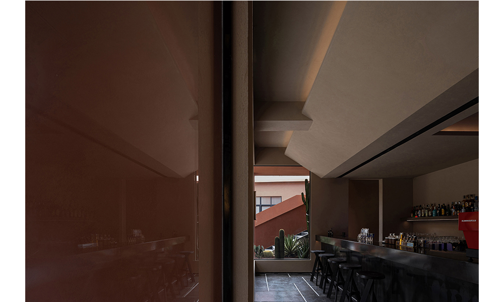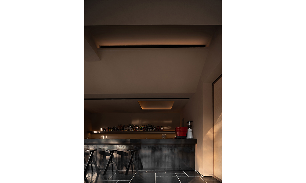 El bar se encuentra en silencio a un lado del área pública, separado por una pequeña puerta, y es axialmente simétrico con el área de recepción. Dispuestos lineales y proyectores están incrustados en los biseles y superficies huecas en el techo, agregando un toque moderno aquí.