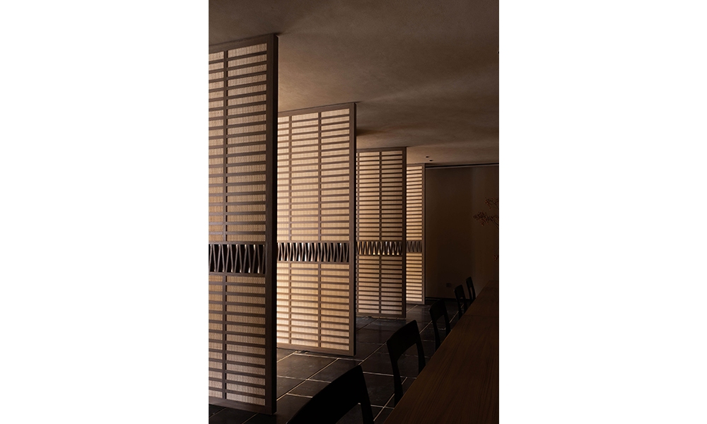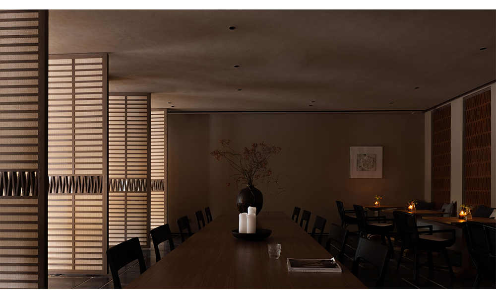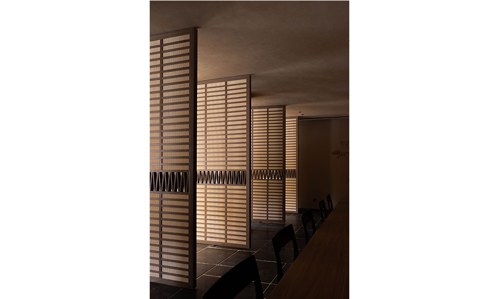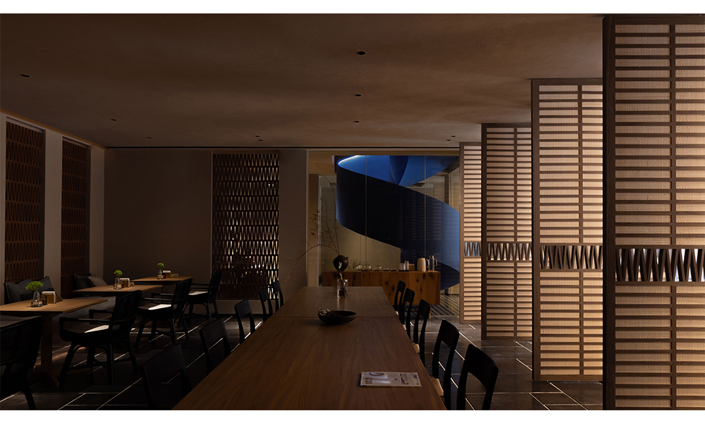 Detrás del sofá de la sala de estar se encuentra el comedor del complejo, que también se puede utilizar como sala de reuniones o espacio para fiestas. El espacio se abre a través de la rotación de la puerta de madera de ratán. De acuerdo con las necesidades de la multitud, las mesas y sillas personalizadas en el interior tienen una variedad de opciones de permutación y combinación.
