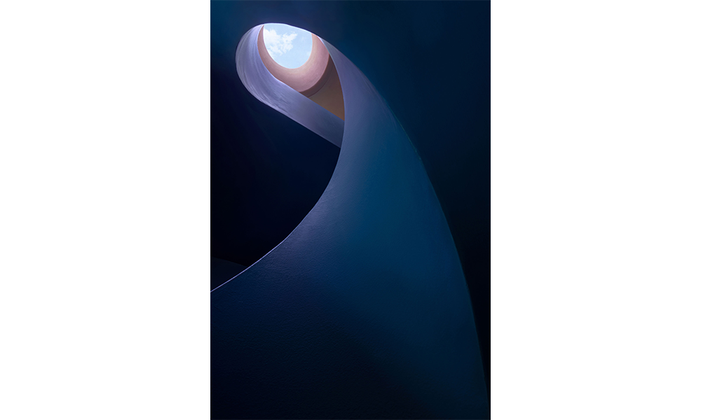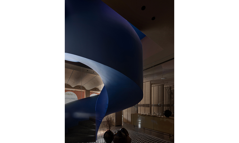 La zona residencial está separada del espacio común por una puerta de cristal para garantizar la privacidad de los huéspedes. Las habitaciones se distribuyen en las plantas superior e inferior, conectadas por una escalera de caracol azul Klein. Se coloca una ventana redonda en el techo de la escalera para traer el tragaluz. Las escaleras son como peces nadando en las profundidades del mar, exudando una maravillosa vitalidad y textura bajo la luz del sol que entra por la ventana.