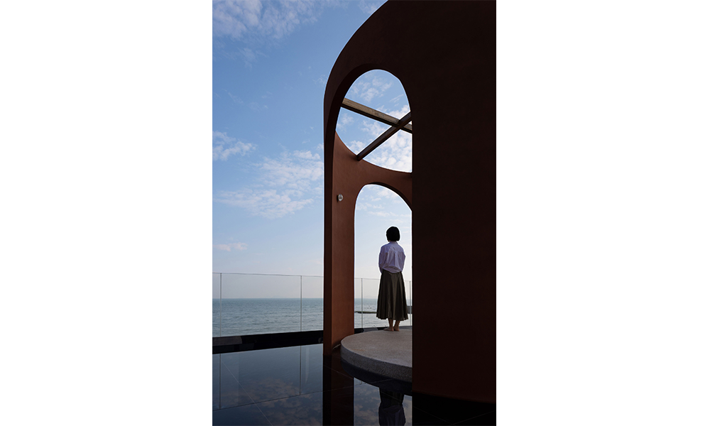 Diseñaron una instalación de agua en la terraza para hacer eco del mar adyacente. El pequeño auditorio se encuentra en el camino de losas de la instalación de la fuente. El agua en el centro de la pizarra gorgotea lentamente, fluyendo hacia el cielo del amanecer.