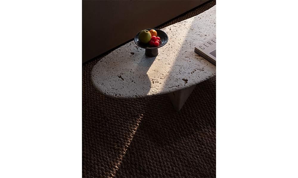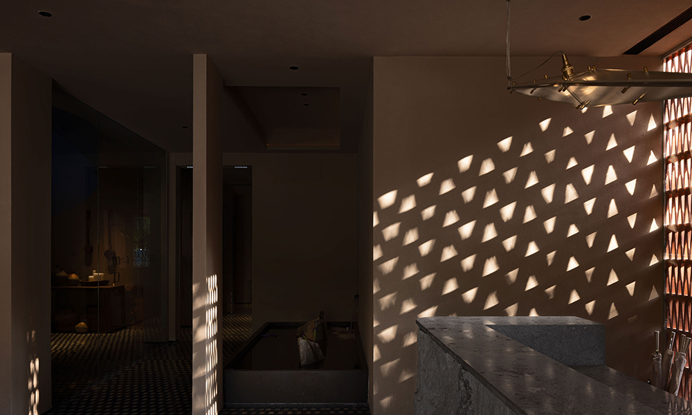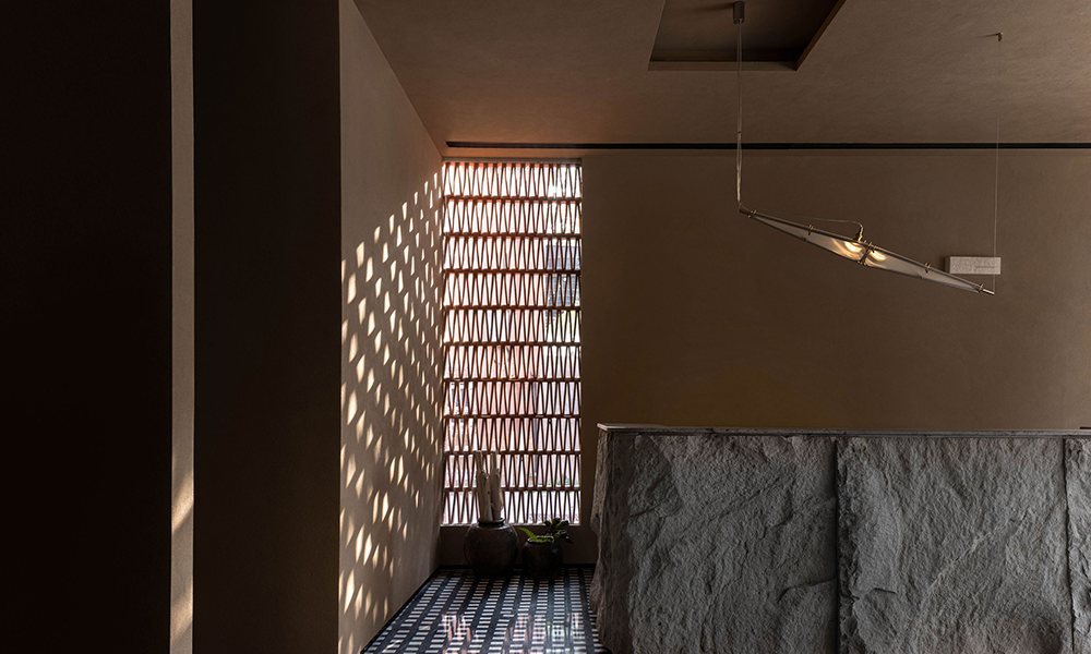 Entra por la puerta y acércate a la zona de recepción. La mesa es una sola pieza de piedra sin cortar y sin pulir, lo que le da un aspecto tosco. La pared de vidrio al lado de la mesa está intercalada con ladrillos de rejilla entrelazados y opuestos, proyectando un punto de luz triangular al sol, tan hermoso como la Vía Láctea.