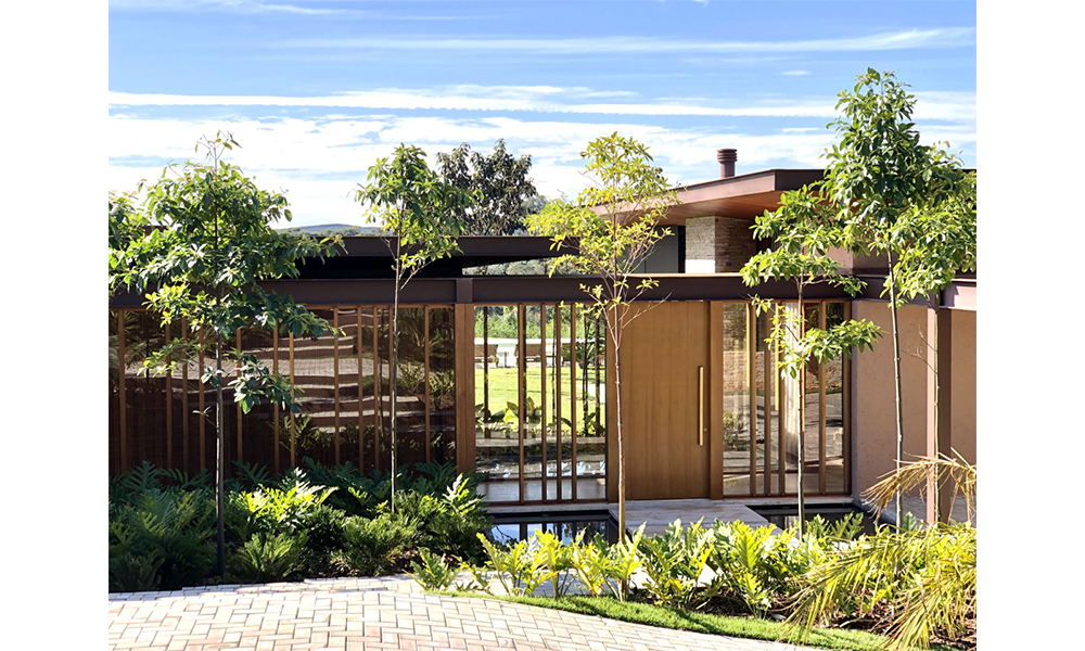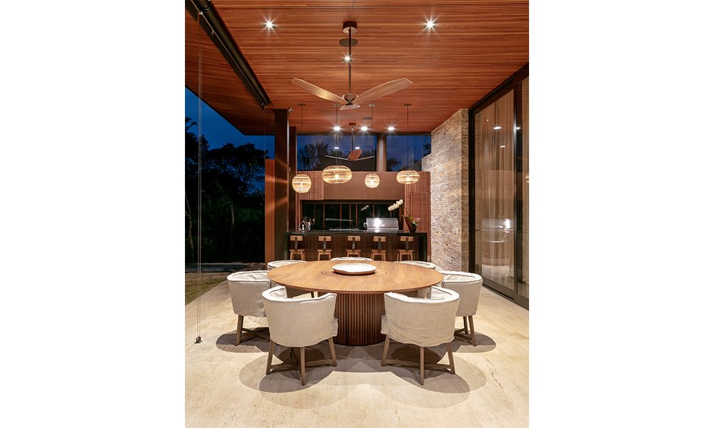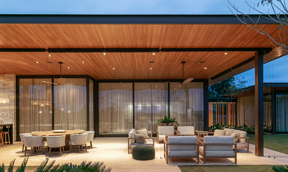 Los materiales naturales, como la madera y las piedras, combinados con la estructura de vidrio y metal, dan el aspecto de una casa moderna que, además, está muy bien integrada en el campo. En la entrada, el espejo de agua da la bienvenida a los visitantes y los sigue a lo largo del vestíbulo de entrada que conecta las áreas sociales y privadas. Este pasillo tiene esta particular pared de vidrio con detalles de estructura de madera que crea una conexión visual con el interior de la casa pero también brinda privacidad a las personas dentro de la casa.