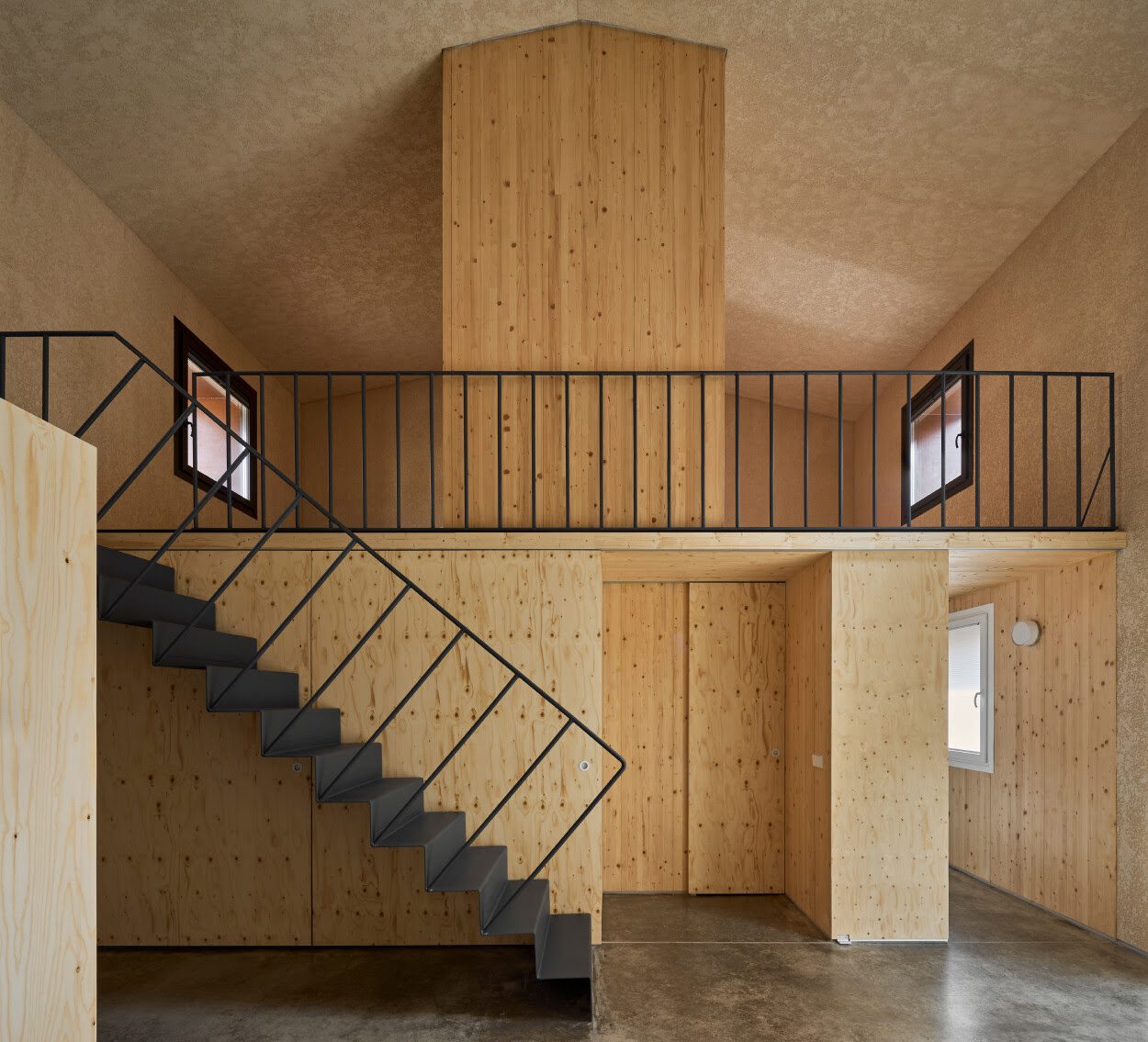 Esta caja, parcialmente adosada a los muros existentes, ocupa aproximadamente la mitad del volumen disponible y establece un diálogo entre lo antiguo y lo nuevo, lo áspero y lo cálido, lo sólido y lo ligero. Su disposición permite que el espacio respire, generando relaciones espaciales complejas entre la envolvente preservada y el núcleo contemporáneo. Las estancias se organizan mediante grandes puertas correderas y abatibles realizadas en la misma madera que la caja, promoviendo flexibilidad visual y funcional.