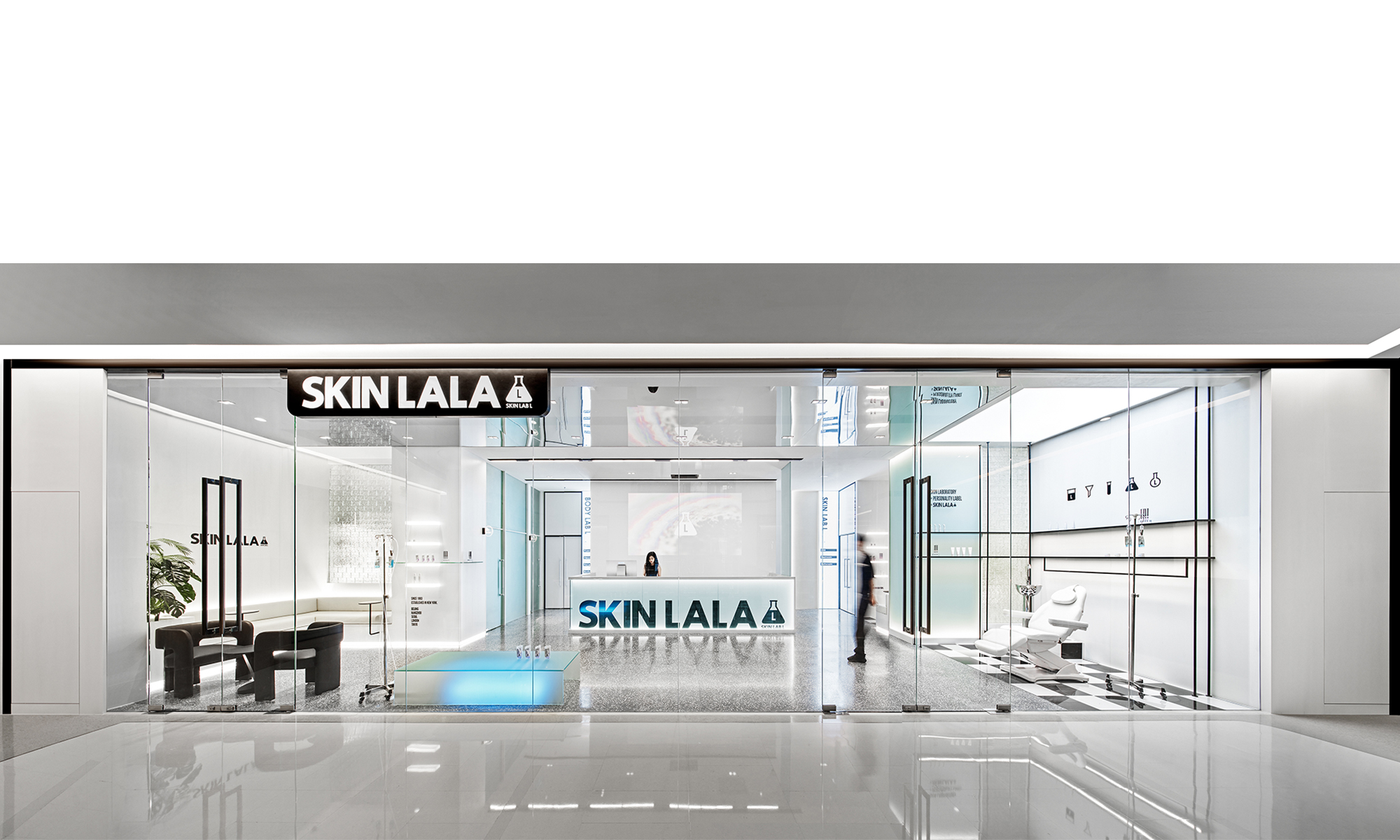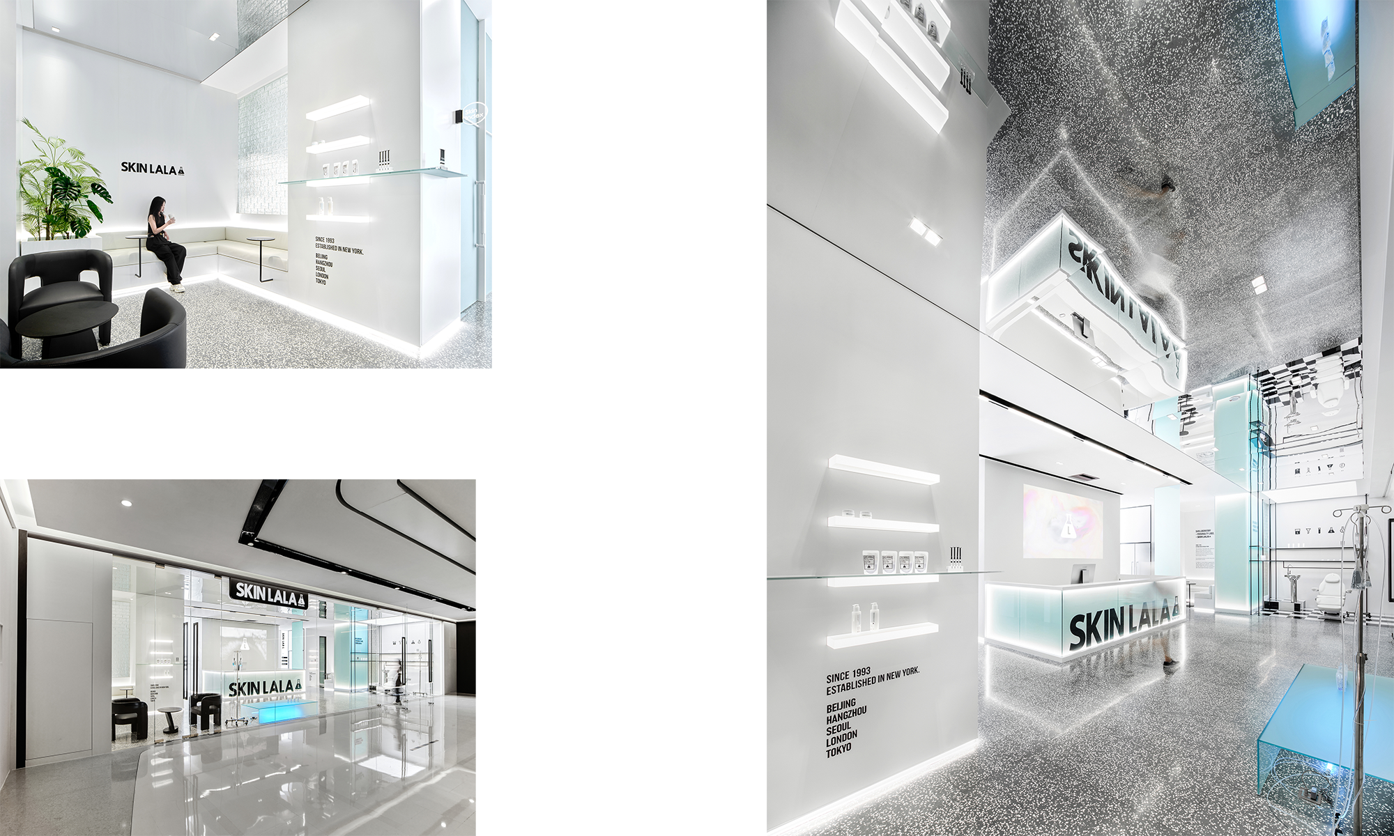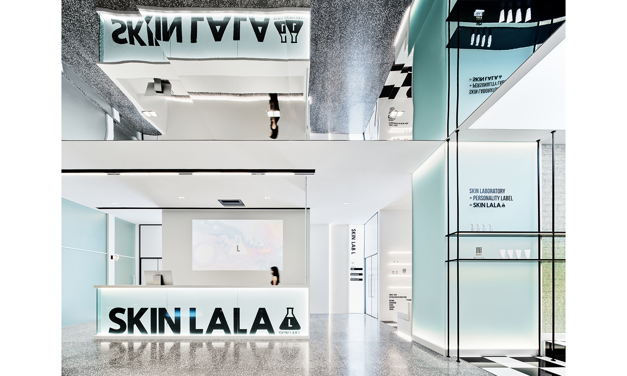 El agua nutre a los seres humanos y lava la suciedad para que aparezca la belleza. Los cinco estados del agua se extraen para que coincidan con la paleta concisa en blanco y negro de la identidad visual de la marca, aplicando materiales como paneles lacados, paneles de espejo, vidrio de arena de jade, ladrillos de vidrio y vidrio templado al espacio. Mezclado con azul hielo, la relación rígida de blanco y negro se suaviza para crear una sensación de espacio claro y puro.