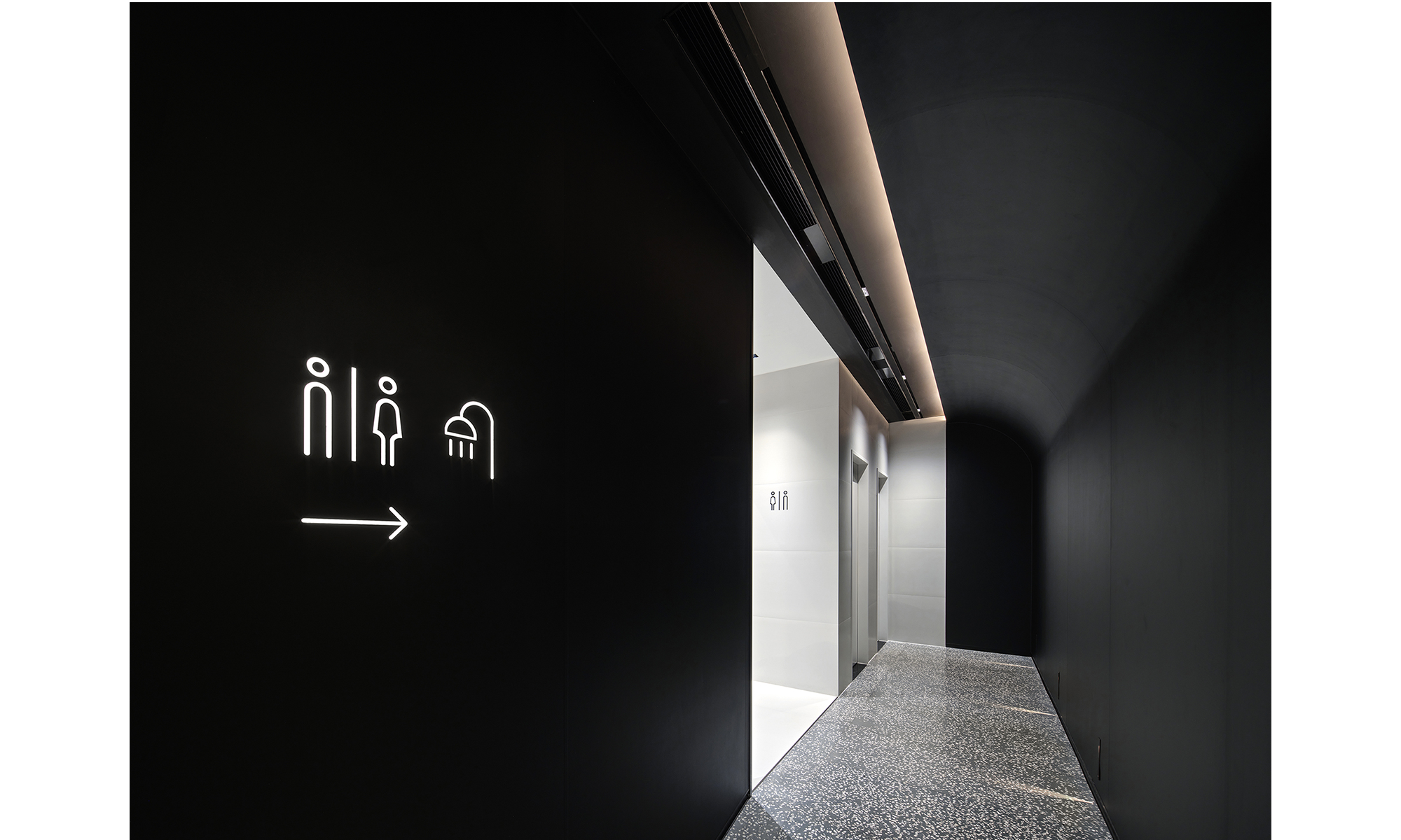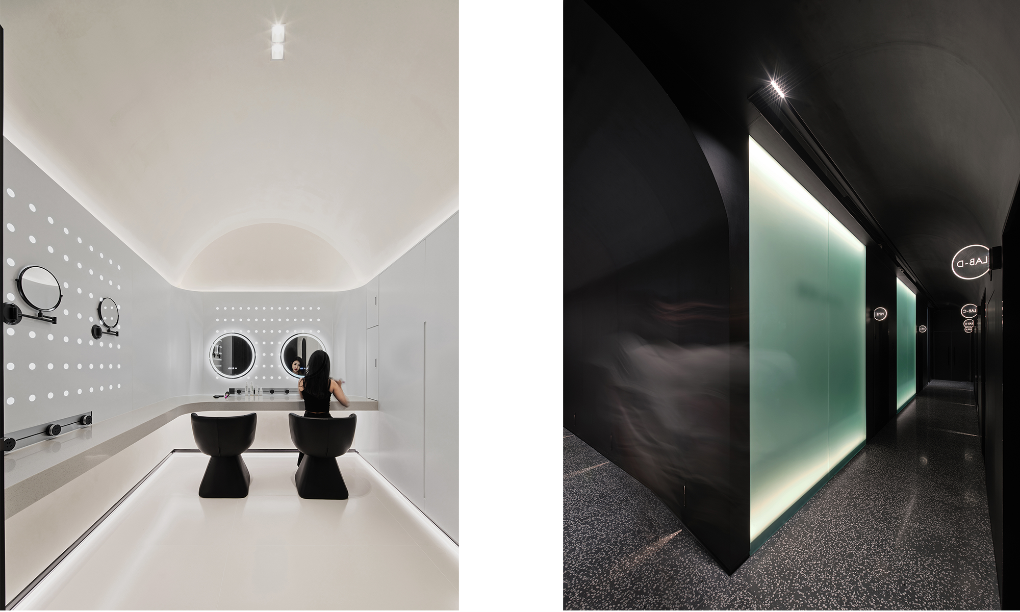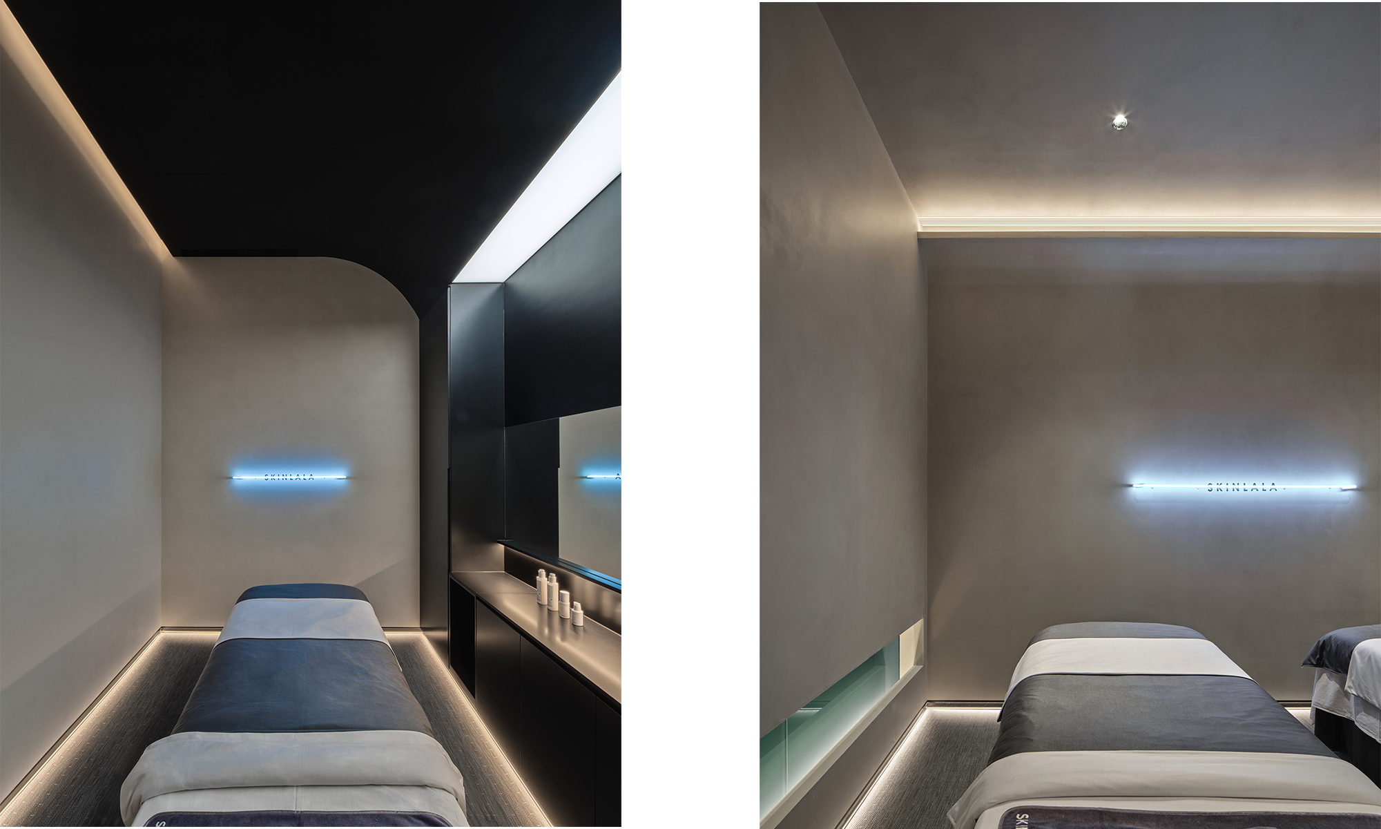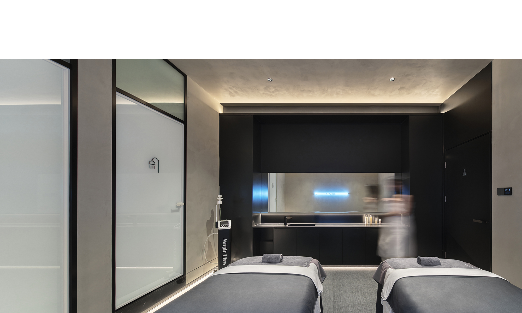 Se requiere una iluminación más cómoda y relajante para la oxigenación facial, el Pilates facial, el cuidado de la cabeza y el spa corporal. Cuando los clientes ingresen al área de invitados desde el vestíbulo principal, se quedarán en silencio en un instante cuando ingresen al tranquilo espacio negro. El área de cuidado de la cabeza tiene un techo estrellado azul brillante, complementado con proyecciones en la pared, creando una sensación de teatro cuando se corre el telón negro. La iluminación es extremadamente restringida en este espacio, donde se utilizan candilejas para guiar el camino. Todo el equipo está oculto en la ranura de acero inoxidable negro en la parte superior, y la parte superior curva y el cristal de arena de jade rompen la monotonía en el pasillo estrecho y largo.