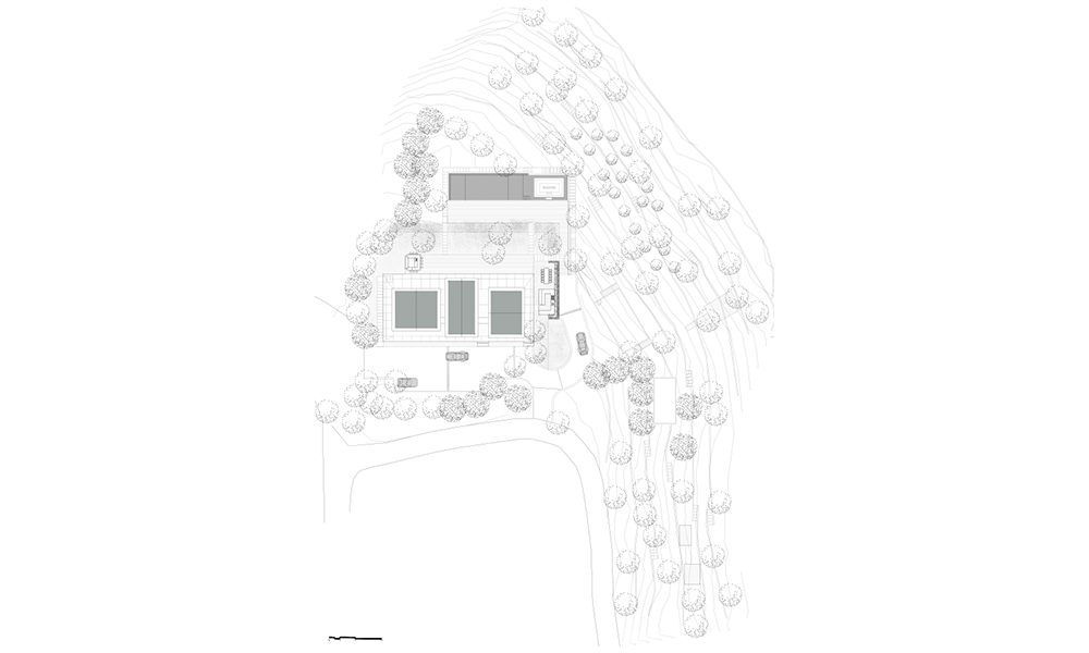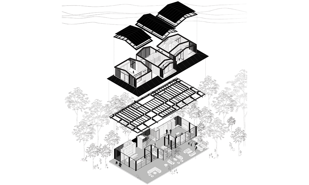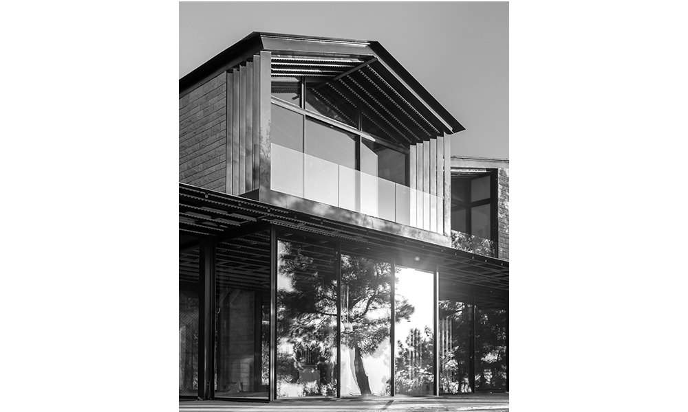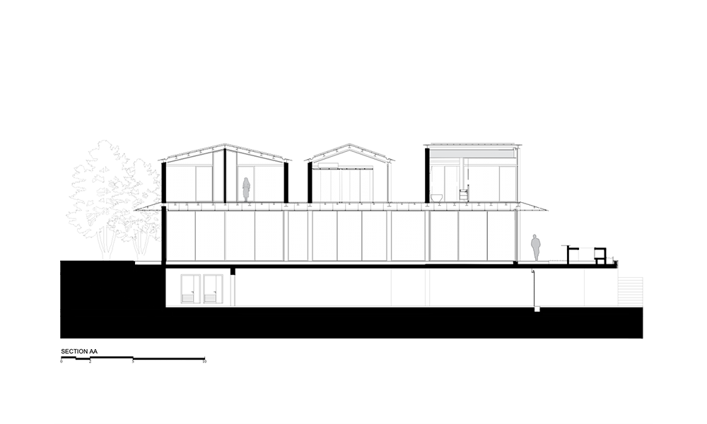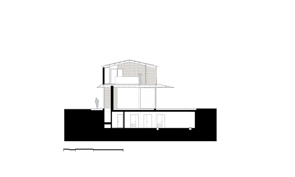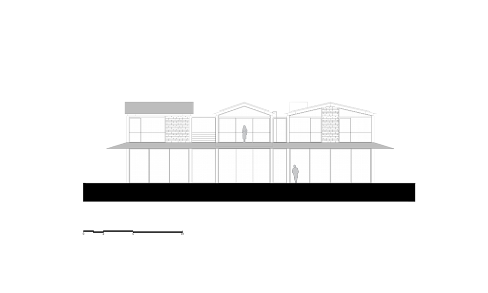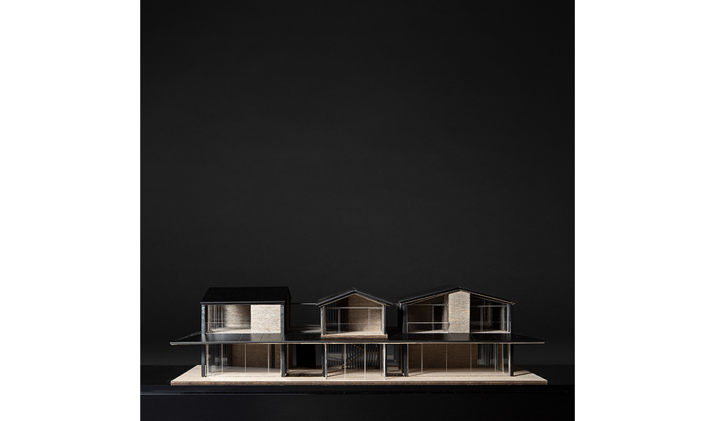 En este proceso, una combinación de una estructura mínima de acero expuesta y mampostería de piedra natural compone un extraño híbrido que apila tres pequeños pabellones sobre un piso de vidrio con un techo en voladizo y evita el uso de concreto.