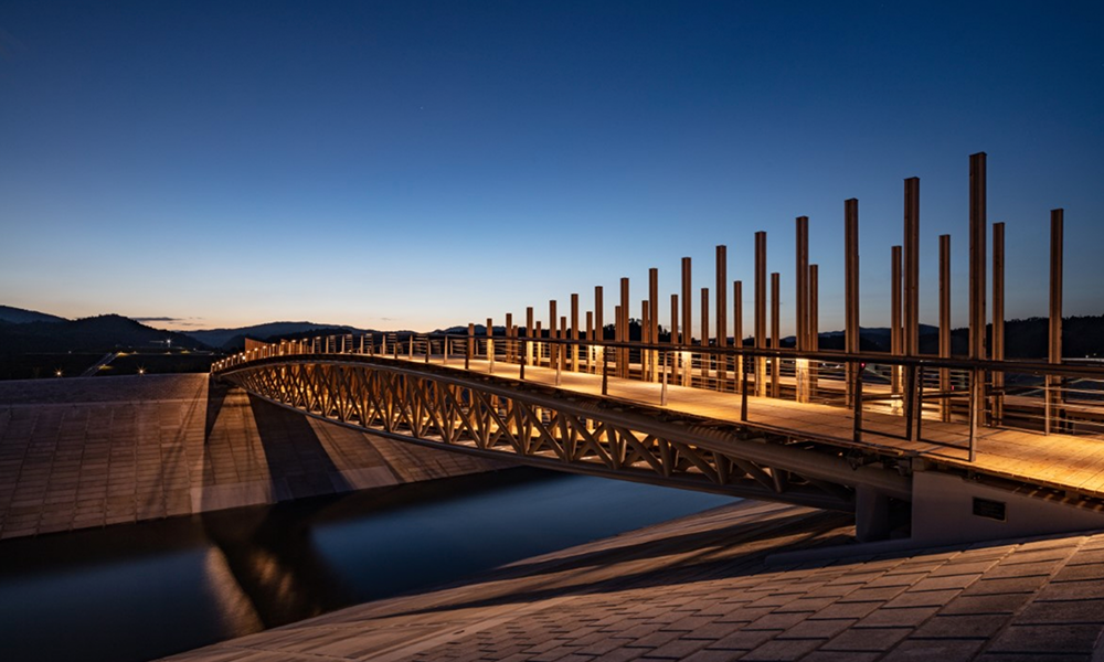 Las piezas de madera combinadas con la estructura de acero evitan la deformación estructural y crean un ambiente cálido y natural apto para un «puente peatonal de la ciudad del océano». La madera y el acero también están conectados aquí, creando una interdependencia estructural.