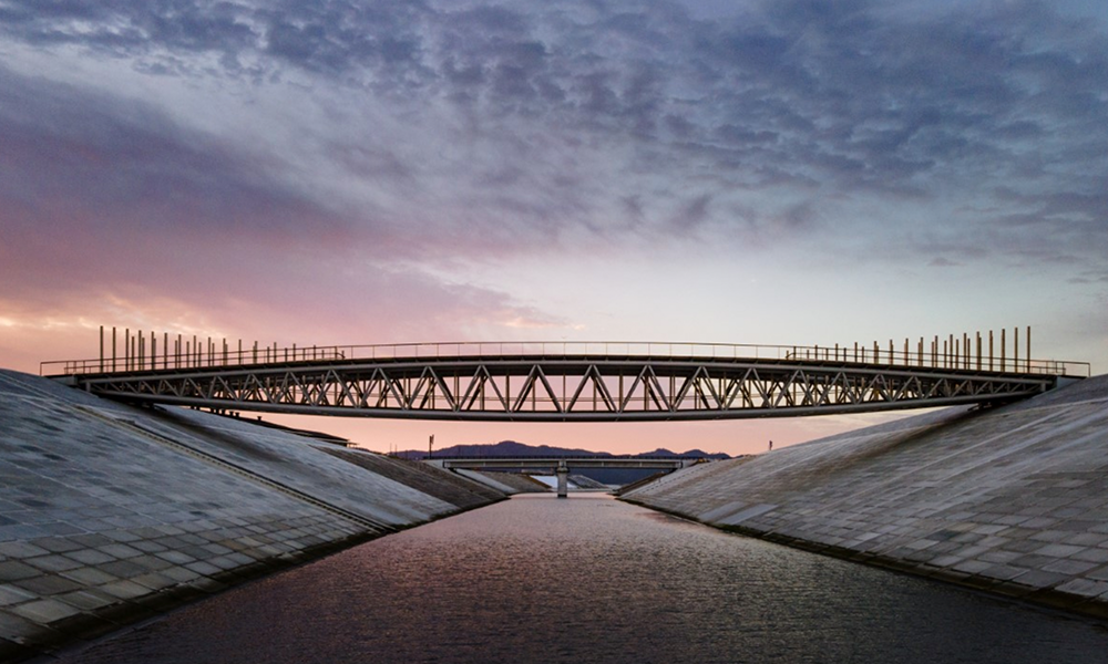 Además, el arco de Nakabashi está reflejado, creando una estructura de armadura lenticular (con forma de lente), que se extiende a lo largo de los 80 m del puente. Mientras que la cuerda superior se arquea hacia arriba y crea un sendero con vista hacia el océano, la cuerda inferior reflejada de la armadura se sumerge cerca de la superficie del agua del río. Los dos arcos están intrincadamente interconectados, conectando las dos vistas y experiencias del puente.
