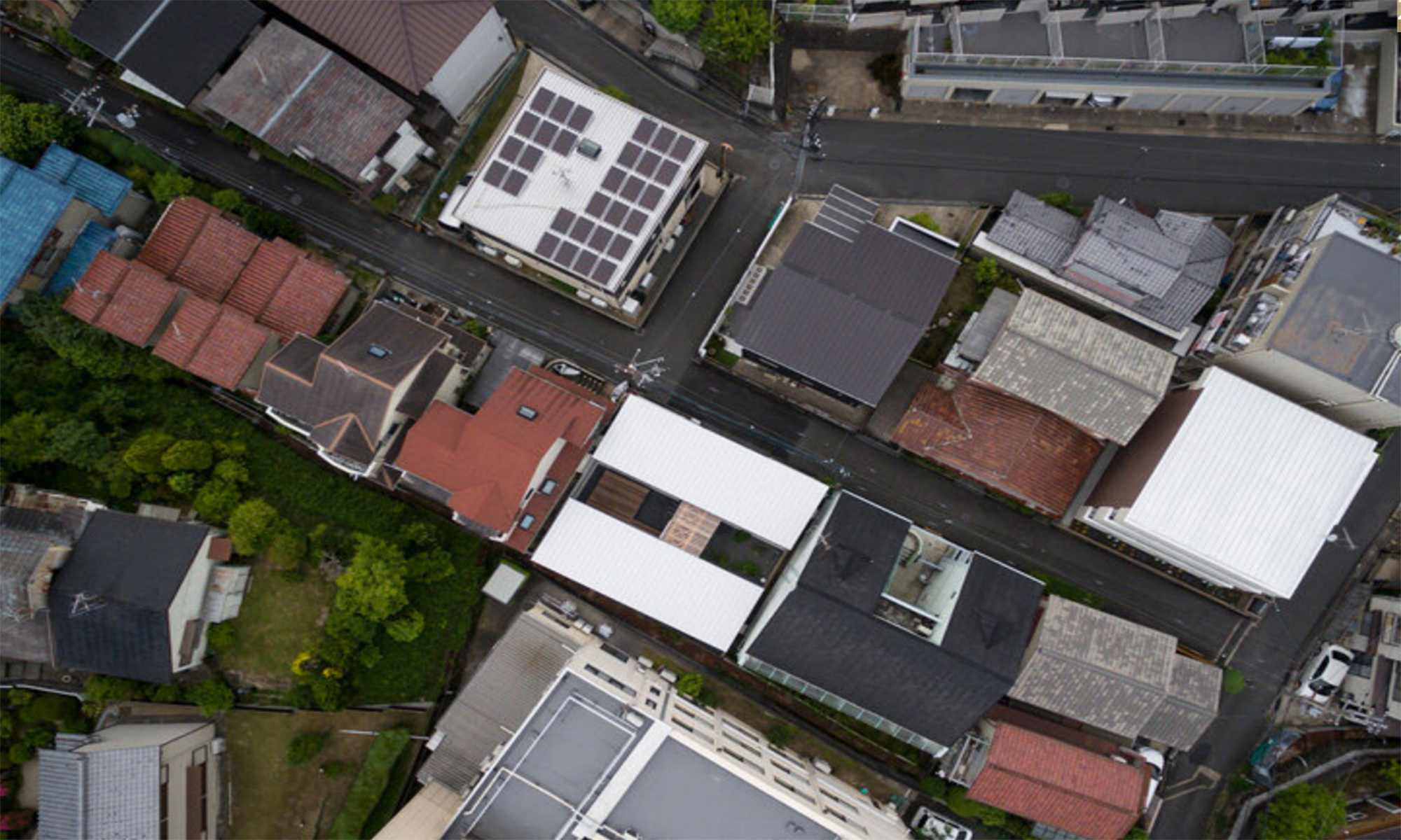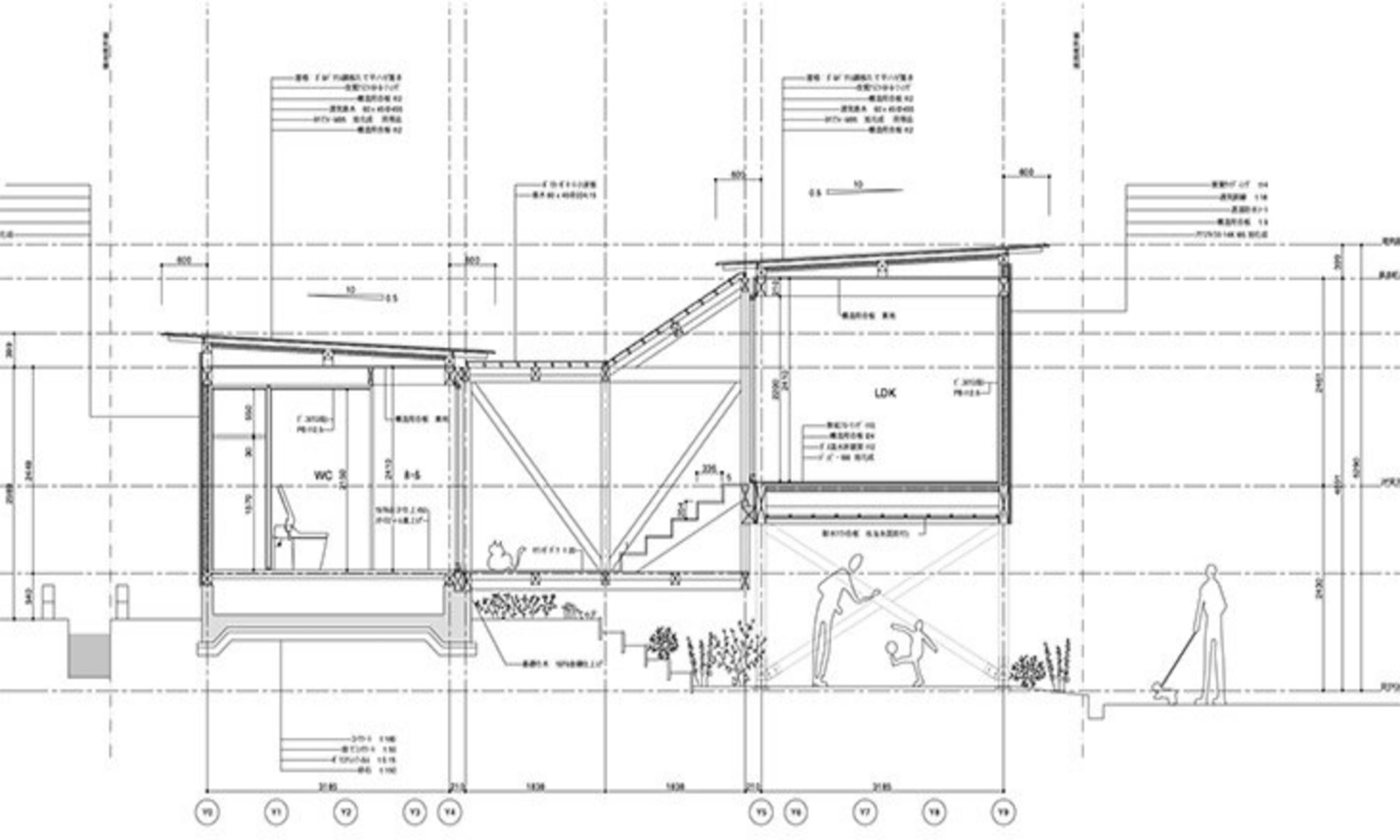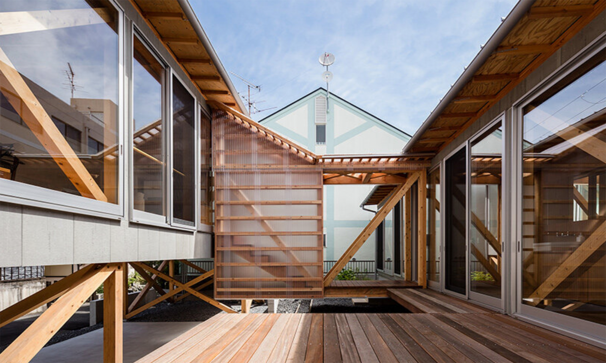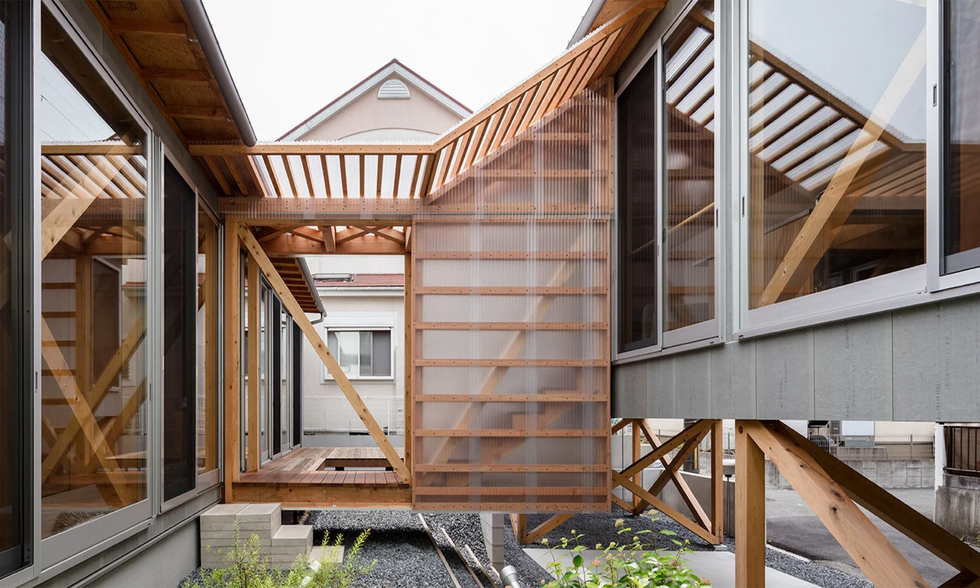 El estudio de arquitectura KKAA YTAA, con sede en Japón, eleva un bloque de la Casa sobre una estructura de madera ligera. Es la forma elegida para sortear las condiciones de un terreno en pendiente, el cual está sujeto a drenaje de agua. Elevar el bloque un metro del suelo sirve para reducir los costos de construcción y evitar daños por humedad causados ​​por el agua subterránea. Esta diferencia de altura permite aún más que la luz y el viento escapen por debajo del piso flotante, mientras que se comparten destellos del jardín secreto con el vecindario.