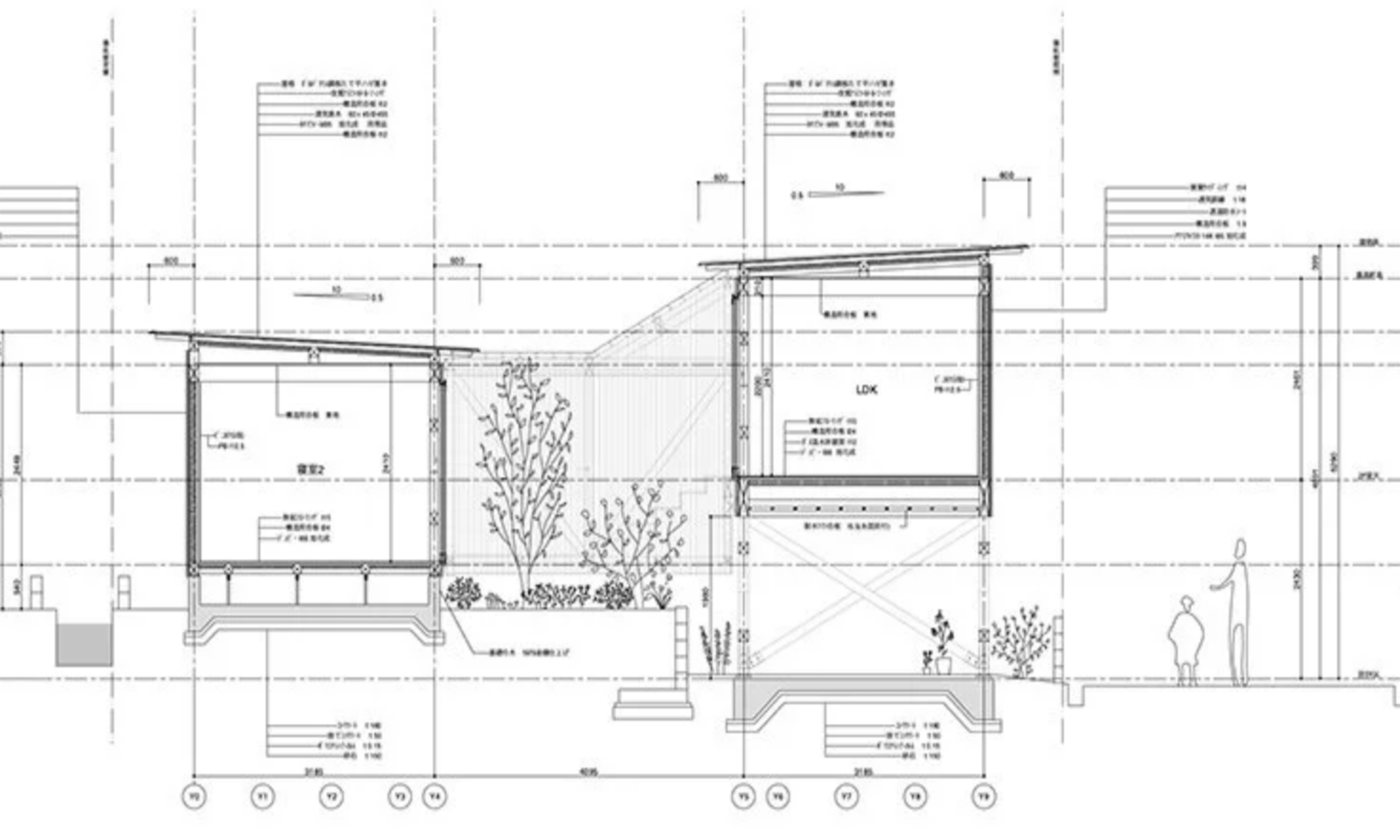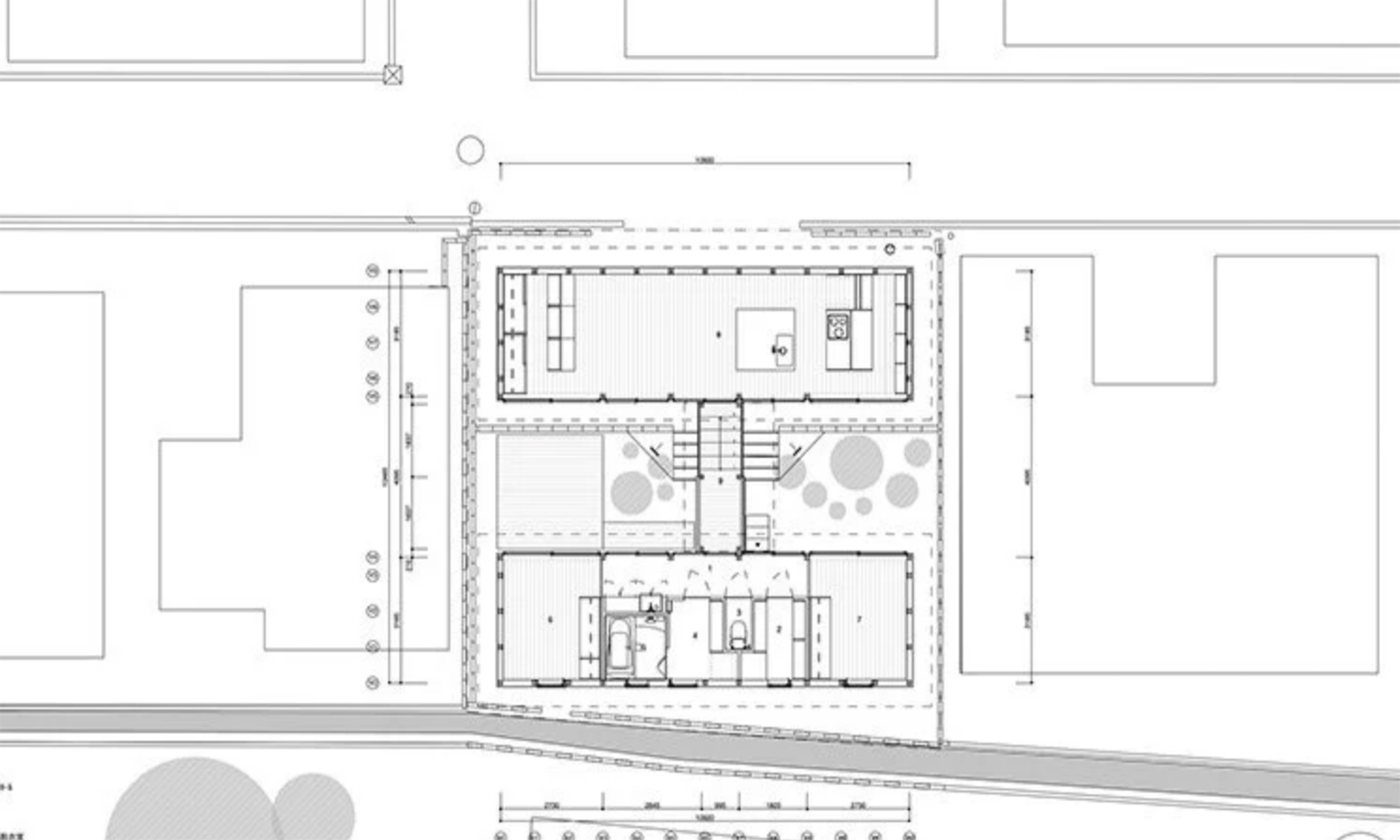 El equipo de KKAA YTAA escribe: ‘Se instalarán dos puentes en el margen después de la construcción. Simplemente encerrando la circunferencia exterior, pretendíamos que fuera tanto exterior como interior. Al abrir y cerrar las paredes, estos dos edificios se conectan como varios lugares, como un espacio externo donde el cielo y el viento pueden escapar, un espacio interno como un pasaje y un espacio semi-exterior como una terraza que conecta con la naturaleza y el medio ambiente. plataforma. En la vida cotidiana, el límite con el margen se desdibujará y, finalmente, la vida de la familia comenzará a conectarse con la ciudad a través de este margen.