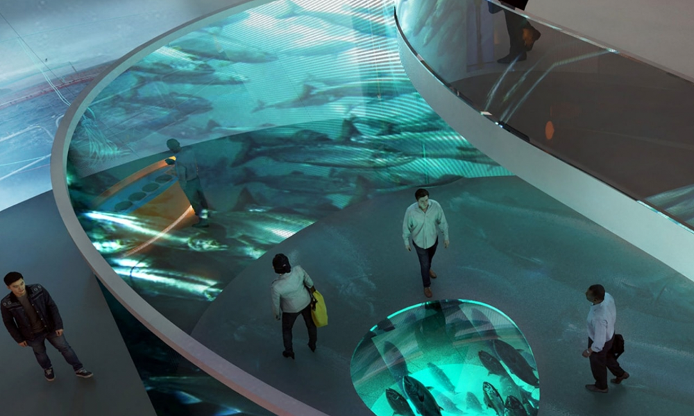 Un concepto para una experiencia de marca en alta mar de clase mundial para Eide Fjordbruk, Noruega. 650 metros cuadrados de área de exhibición interactiva que visualiza la atención global a la acuicultura. La arquitectura y el diseño icónicos de Kvorning Design reflejan una industria acuícola en proceso de cambio.