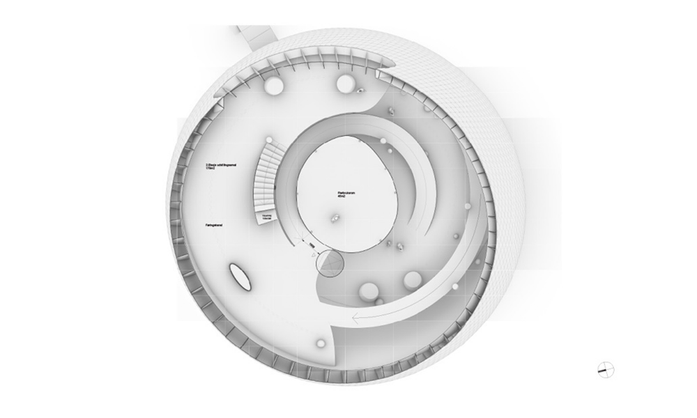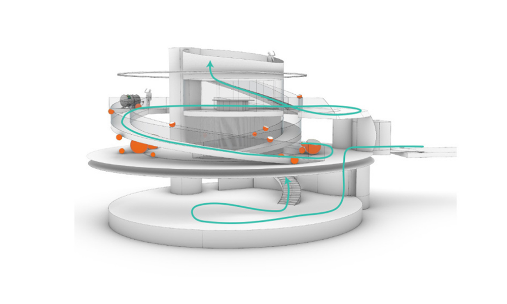 Las experiencias se desarrollan a lo largo de hermosos caminos formados por rampas y escaleras, que serpentean a través de Salmon Eye. En varios lugares a lo largo del recorrido, los visitantes pueden interactuar con proyecciones en las paredes y en grandes pantallas interactivas en forma de huevas. El ascensor ofrece una oportunidad alternativa para moverse entre niveles y hacia la azotea.