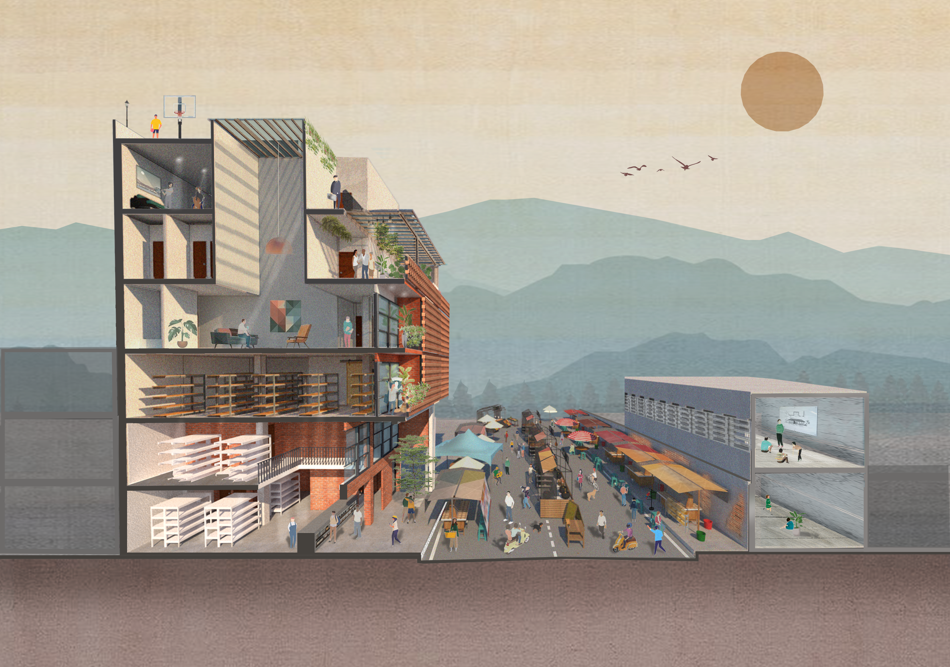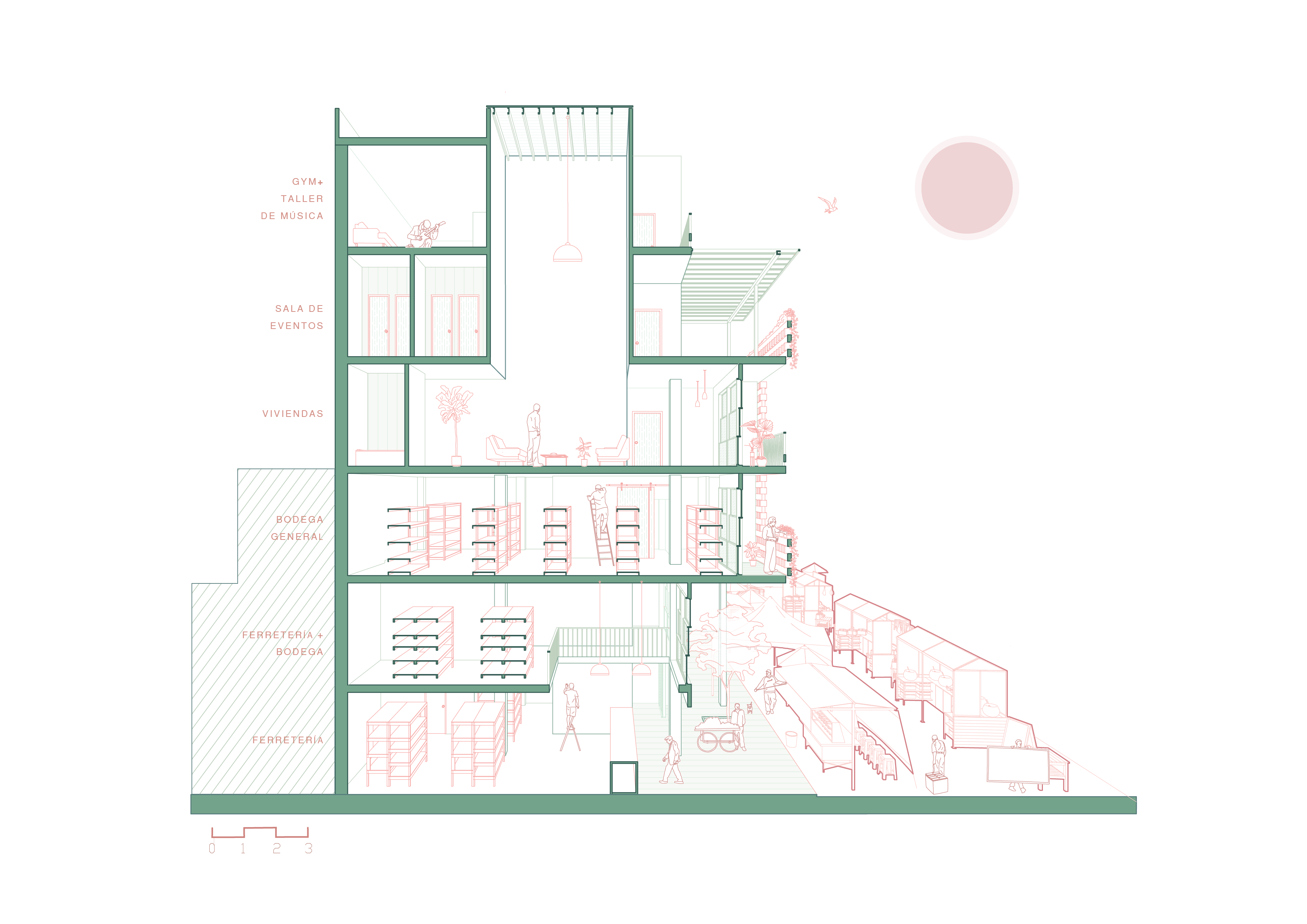 La Proveedora reflexiona y plantea estrategias de compacidad y diversificacion; revalorizando la tecnica y mano de obra local. Una intencion de leer el contexto y contener un multi-programa que responda sensiblemente con materiales artesanales, escalas urbanas sostenibles y formas de vida dinamicas. Un espacio para proveer y guarecerse dentro del enérgico desarrollo de la ciudad.