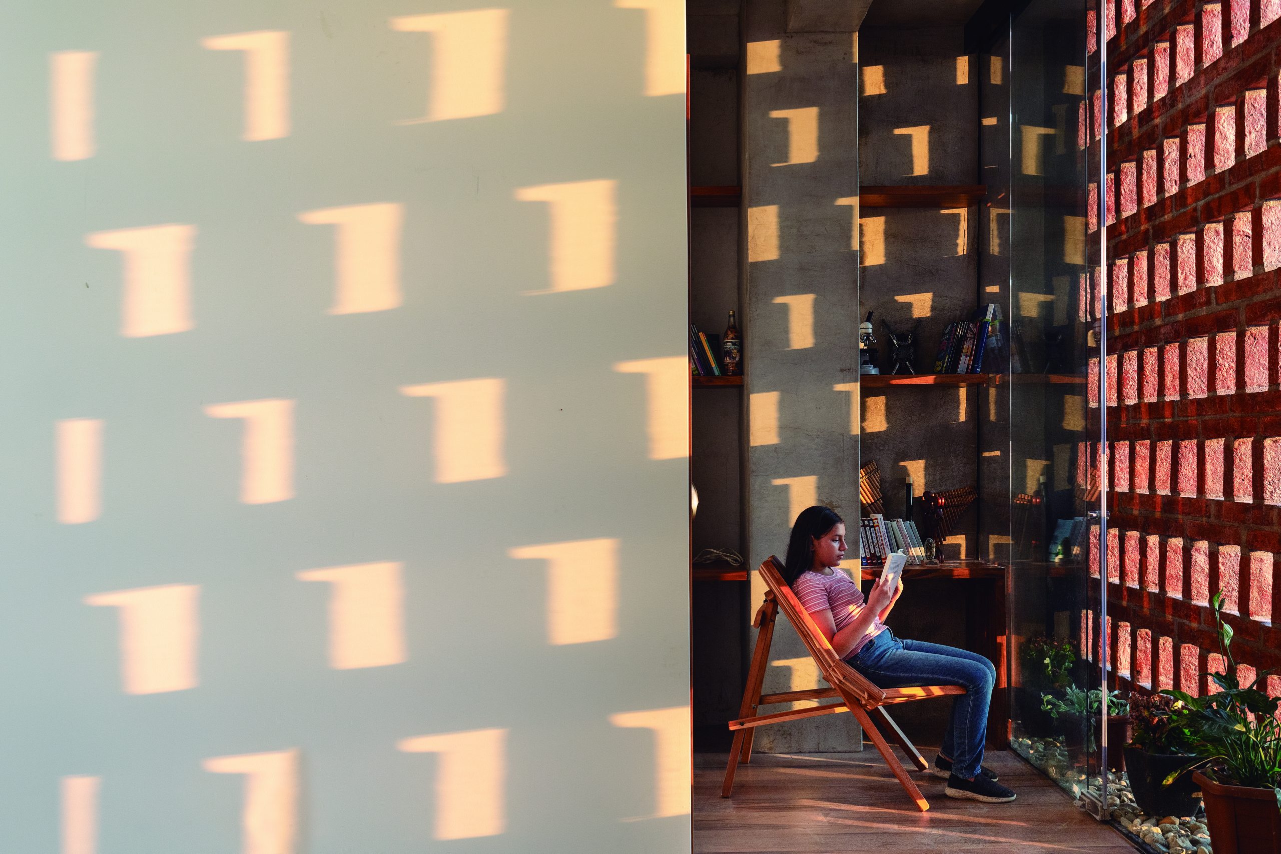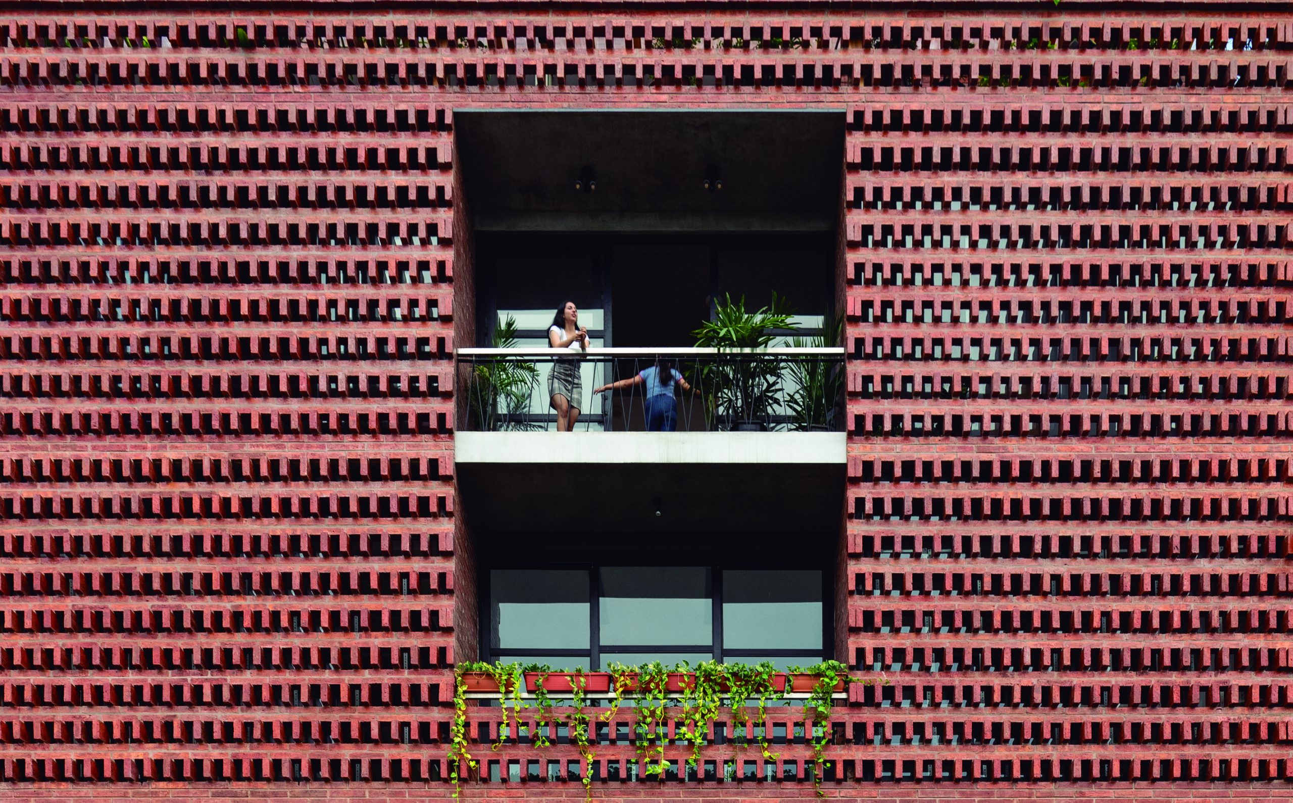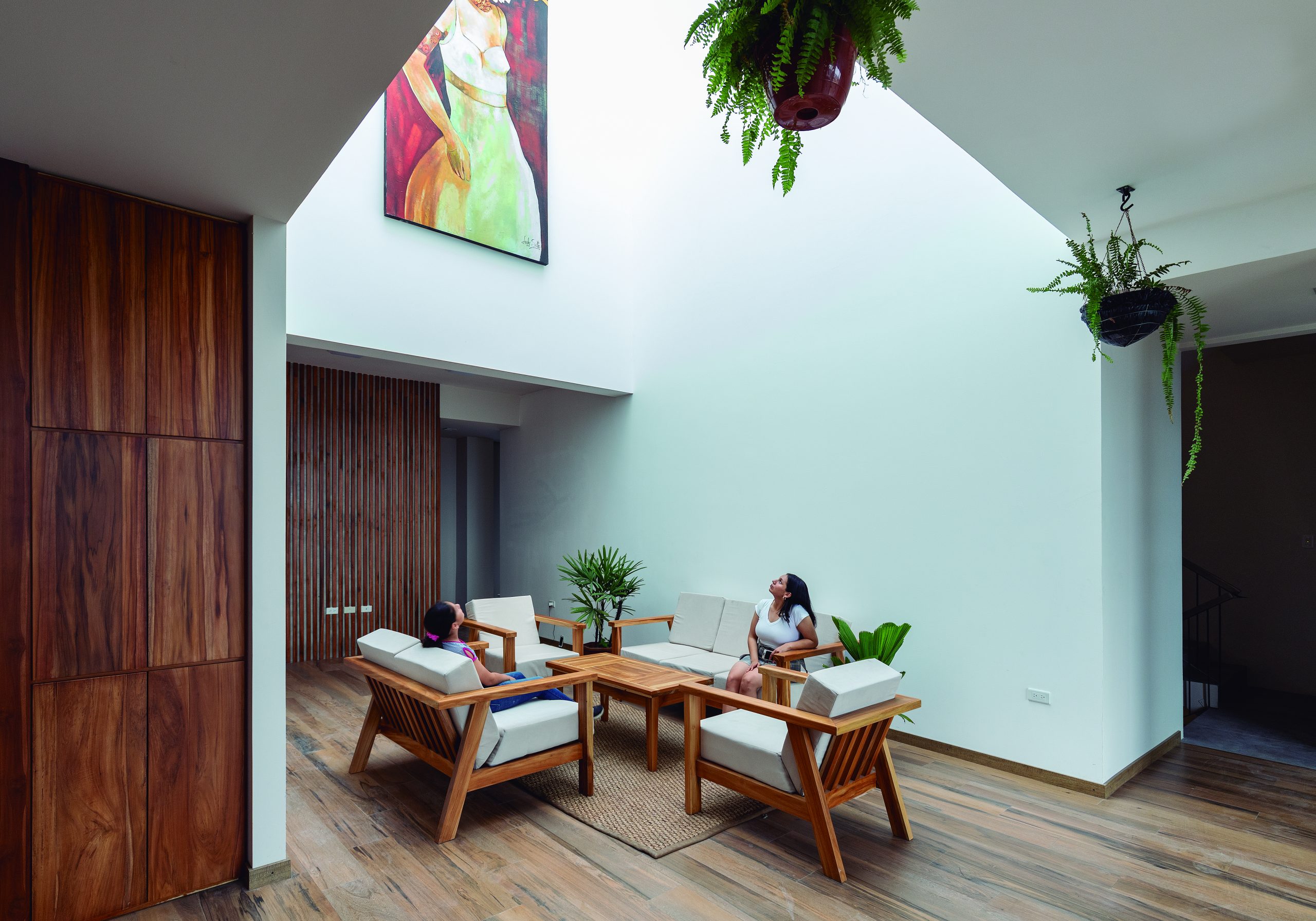 Los balcones y las terrazas se desarrollan en el 3er y 4to piso, unificados por una doble envolvente permeable en su totalidad, formada de vegetacion, ventanales de vidrio y ladrillo artesanal visto; otorgando iluminación tamizada, ventilación natural purificada. Dicha ventilacion se complementa con el pulmon del proyecto; un lucernario y desfogue de aire a triple altura de 4m x 4m, que conecta el cielo con el area social de la vivienda.