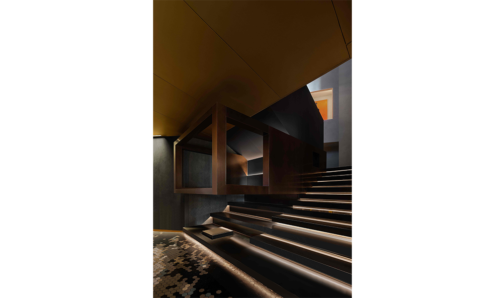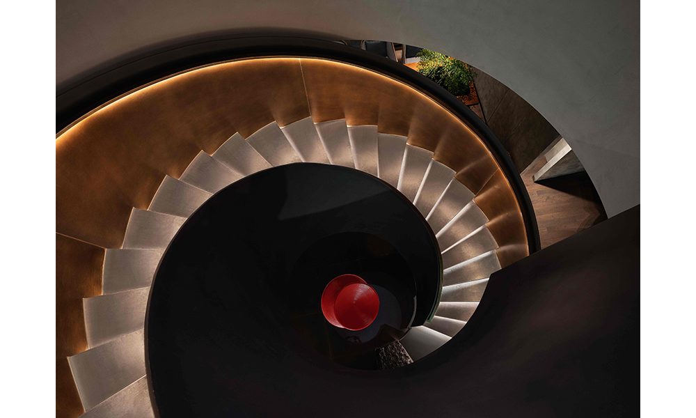 La escalera está pintada con una especie de color cobre con textura y adornada con obras de arte, pareciendo una escultura estética. Al igual que otros artículos en el restaurante, está lleno de textura, haciendo que el espacio se llene de tensión.