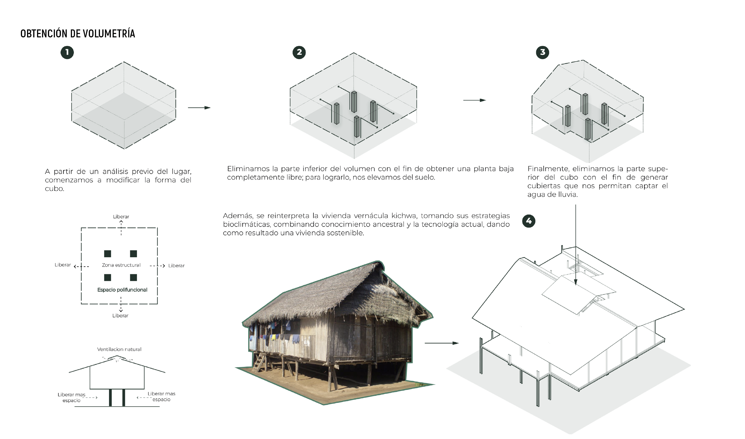 El diseño de la vivienda incorpora elementos distintivos de la arquitectura vernácula Kichwa, reinterpretándolos al combinar conocimientos ancestrales con tecnología contemporánea. La vivienda se eleva del suelo por razones climáticas y de seguridad, presenta una cubierta de gran altura y dimensión. Se han adoptado estrategias pasivas de diseño bioclimático, como la ventilación cruzada, la doble cubierta que genera un efecto chimenea para la extracción del aire caliente, y una orientación estratégica que maximiza la eficiencia térmica.