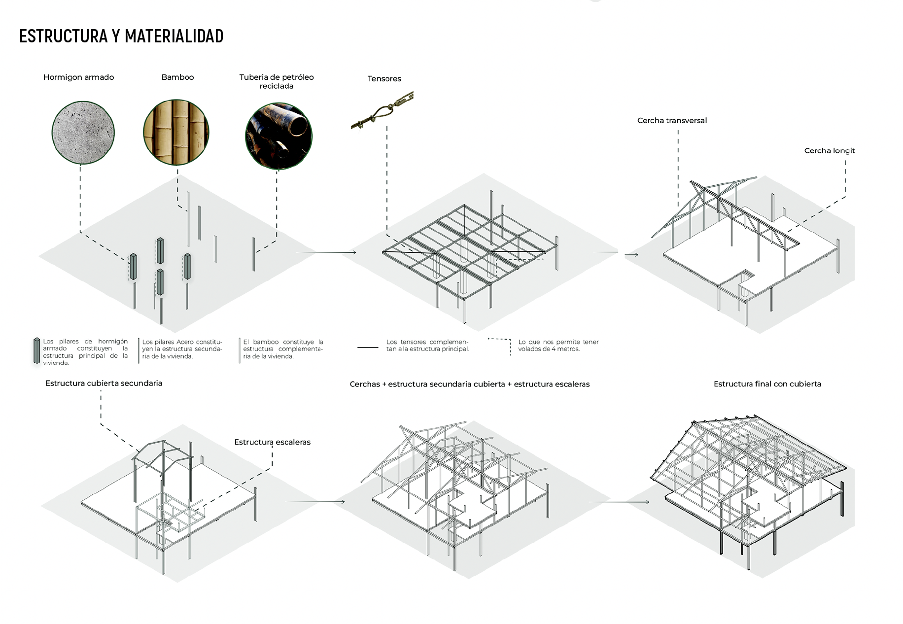 La estructura de la vivienda se divide en tres niveles, acorde a su materialidad. La estructura principal, de tipo voladizo, se sustenta en cuatro robustas columnas de hormigón armado, lo que permite una planta baja completamente libre. Sobre estas columnas se asienta una plataforma de tubería reciclada de petróleo, con tensores que permiten pronunciados volados. La losa deck que conforma el suelo de la vivienda se apoya en esta estructura, mientras que la estructura secundaria, confinada en tubería de petróleo, soporta la vivienda en sí. Para la estructura complementaria de la cubierta se utilizó bambú.