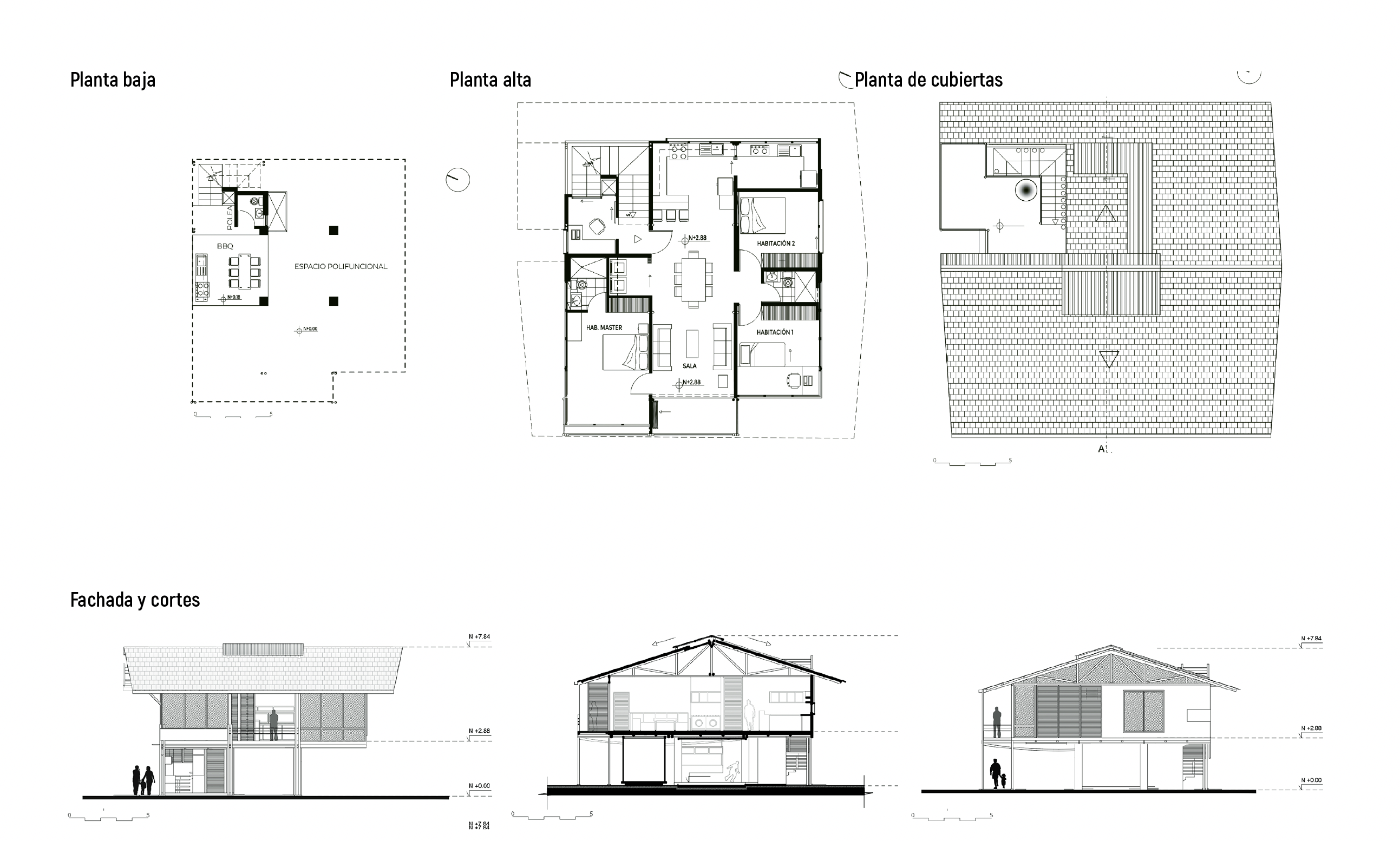 El área útil de la casa se distribuye en tres módulos. La planta baja,área pública, cuenta con un baño equipado con ducha exterior, un mesón de cocina y un área cubierta. En la segunda planta, al ingresar, se accede a un módulo central que alberga la zona social, un espacio completamente abierto que integra la cocina y el balcón. En el módulo lateral derecho se ubican dos habitaciones con baño compartido y una cocina auxiliar; mientras que el módulo lateral izquierdo incluye la habitación principal, el cuarto de máquinas y un estudio que se conecta con una plataforma en la tercera planta, diseñada como el punto más alto de la vivienda, se lo planteó totalmente abierto a manera de terraza para la utilización  del dron para el monitoreo del bosque de la reserva ya que se considera como un laboratorio vivo  , así como también  para la instalación de un tanque de agua reservorio que distribuye por gravedad el agua reciclada de la lluvia para la vivienda.