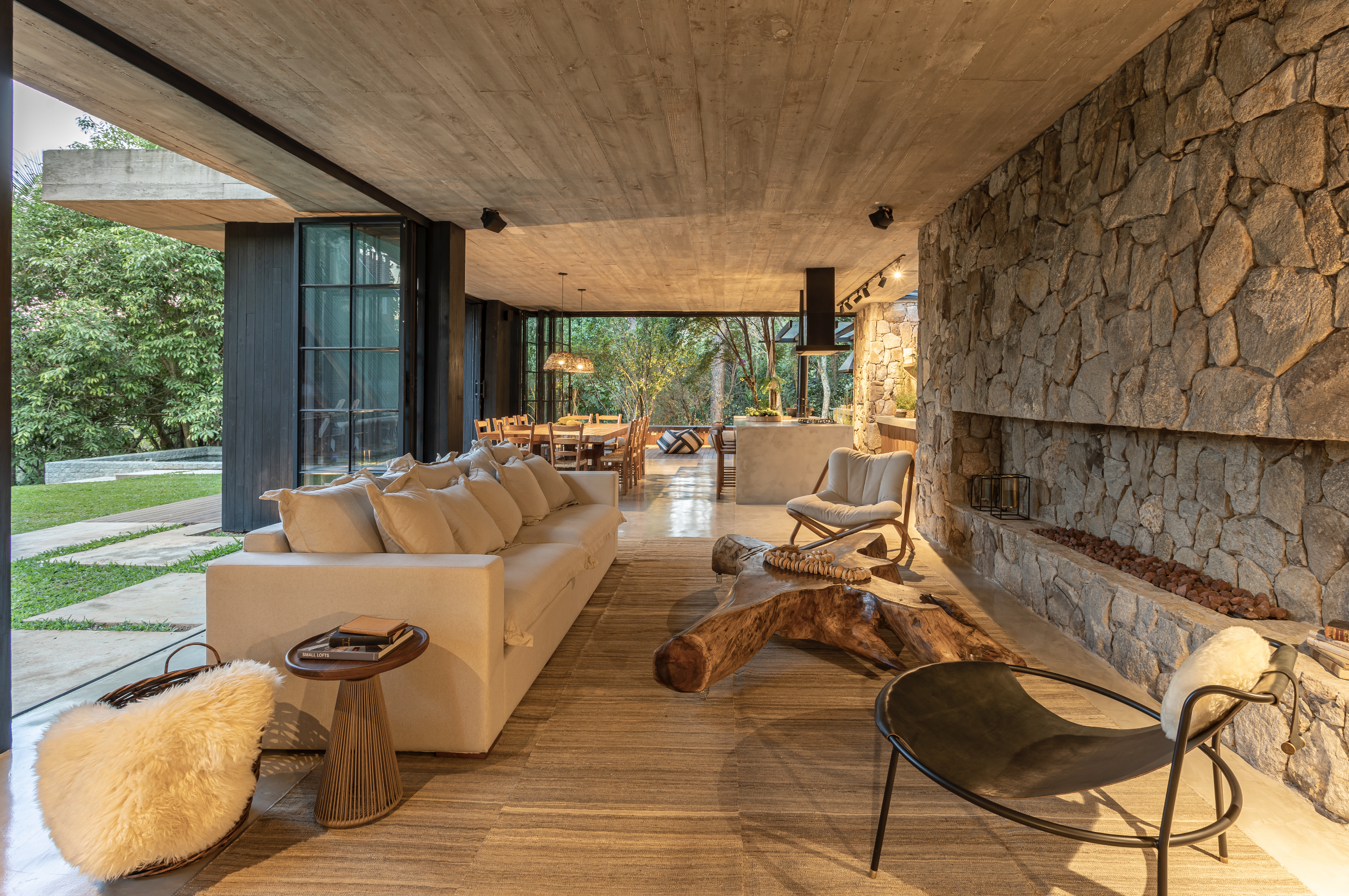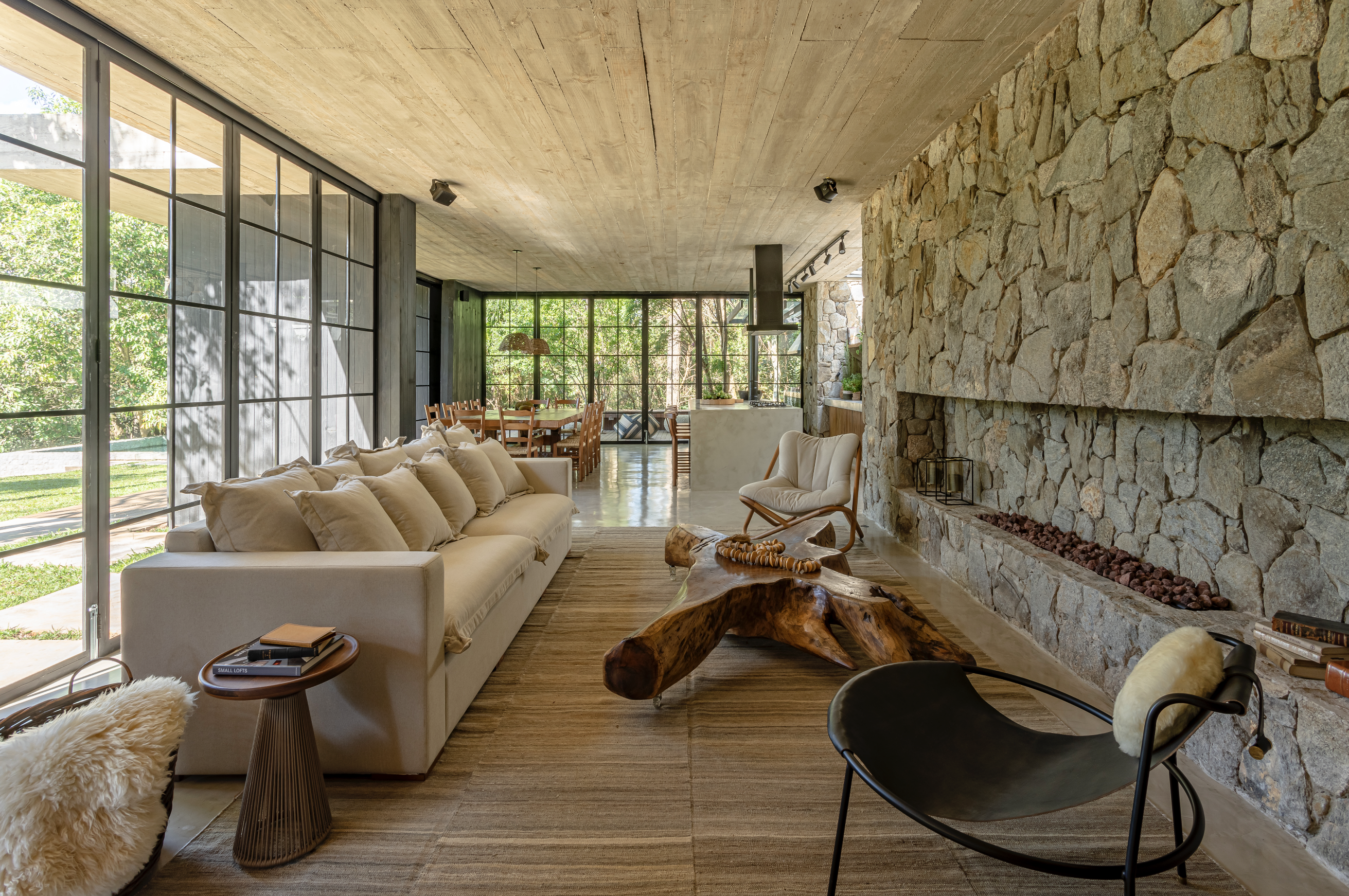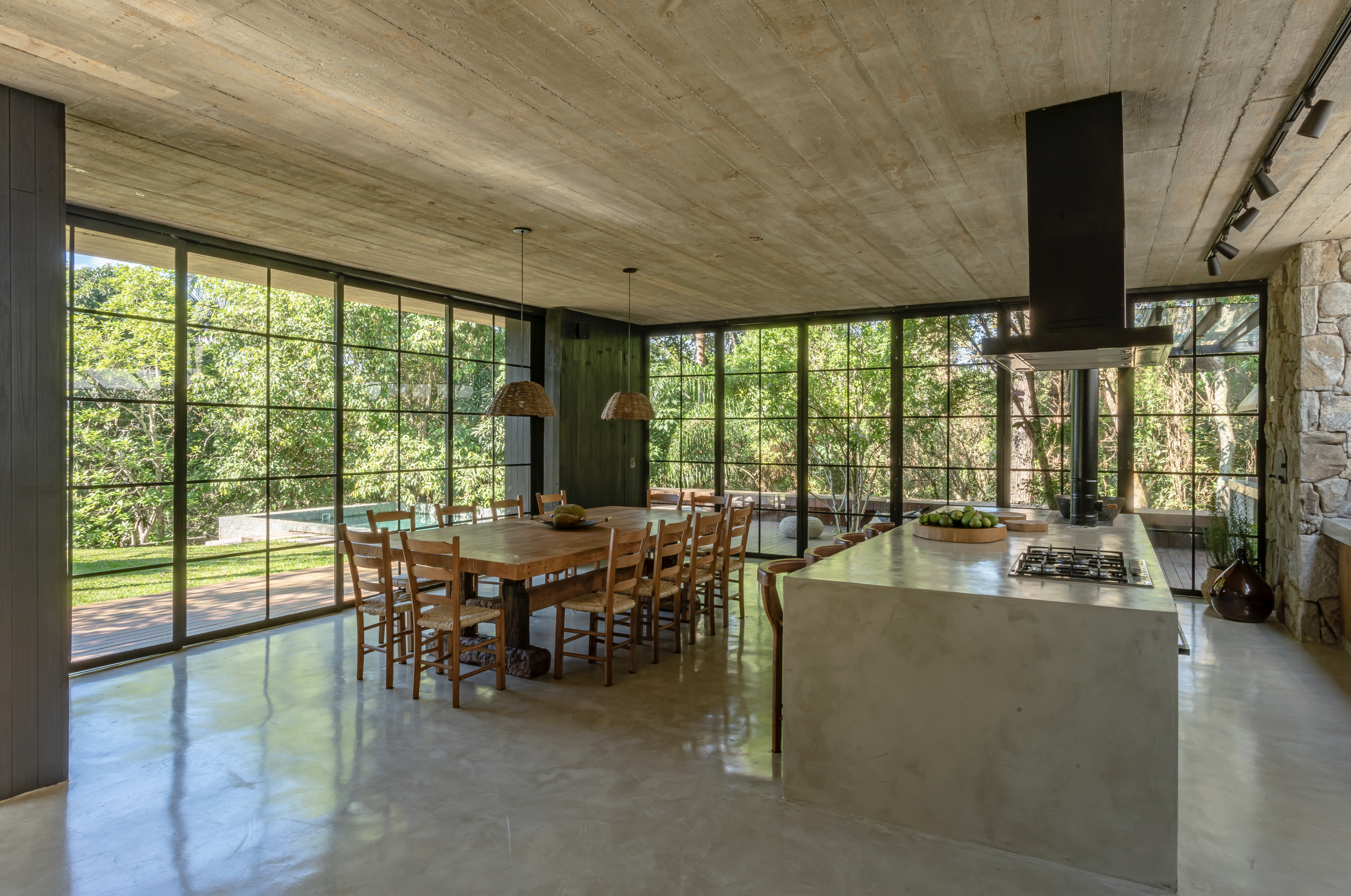 Materiales como piedra, hormigón, madera e inspiración de las casas de campo de Uruguay ayudaron en el diseño. Todos los materiales utilizados son naturales, nada industrializados. Piso de cemento quemado, techo de hormigón visto, paredes revestidas de piedra, pilares revestidos de madera carbonizada shou sugi ban, madera de demolición en los estantes, deck de cumarú, marcos de hierro pintados de negro y paredes blancas con yeso rústico.