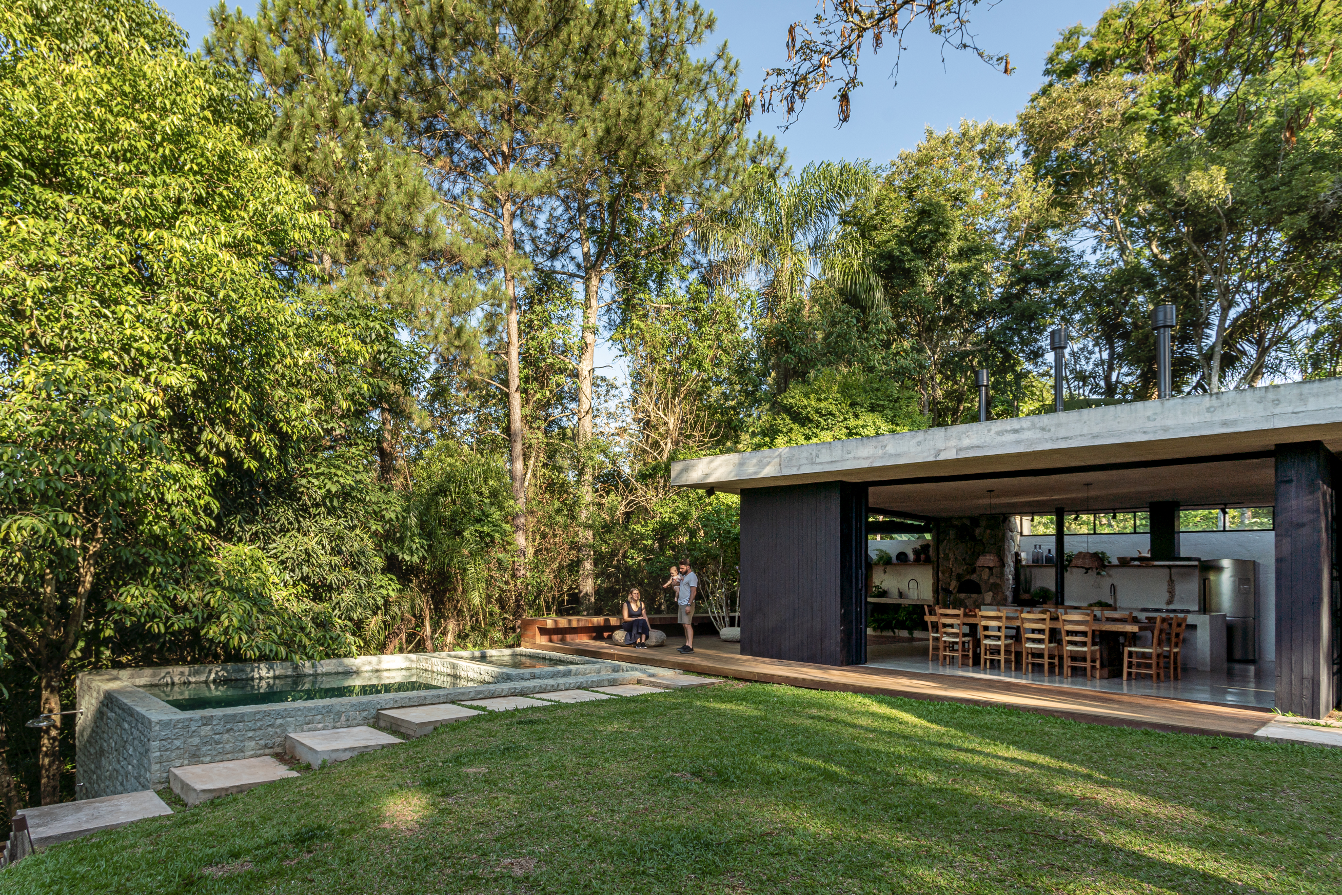 Construida para una pareja joven que buscaba un refugio en el campo cerca de la capital, los clientes, que son del campo y vivían en São Paulo, tuvieron su primer hijo cuando la casa estuvo lista. Menos lujo y más comodidad fue la premisa para llegar al hogar que la familia soñaba. Otro pedido, según los arquitectos, fue que la obra, de cierta manera, se camuflara en el bosque entre los muchos elementos naturales.