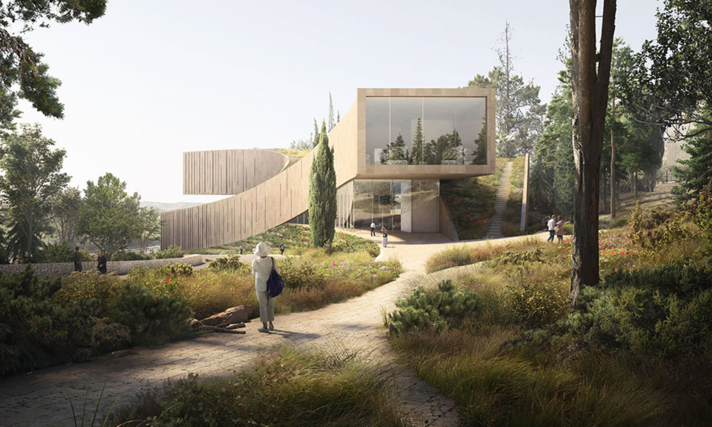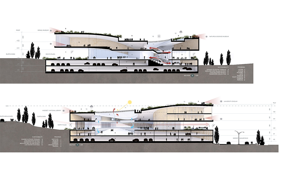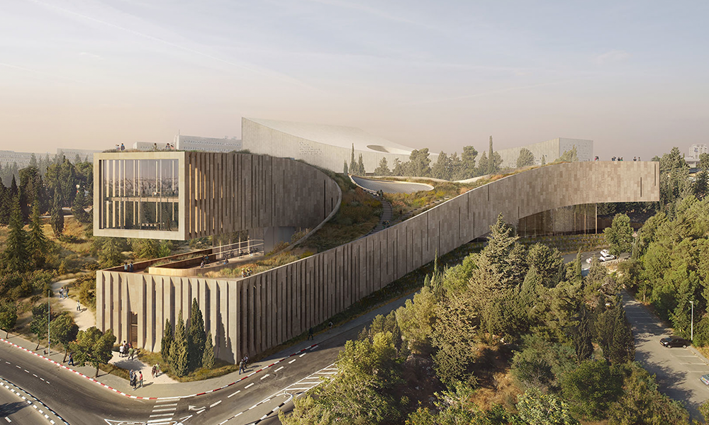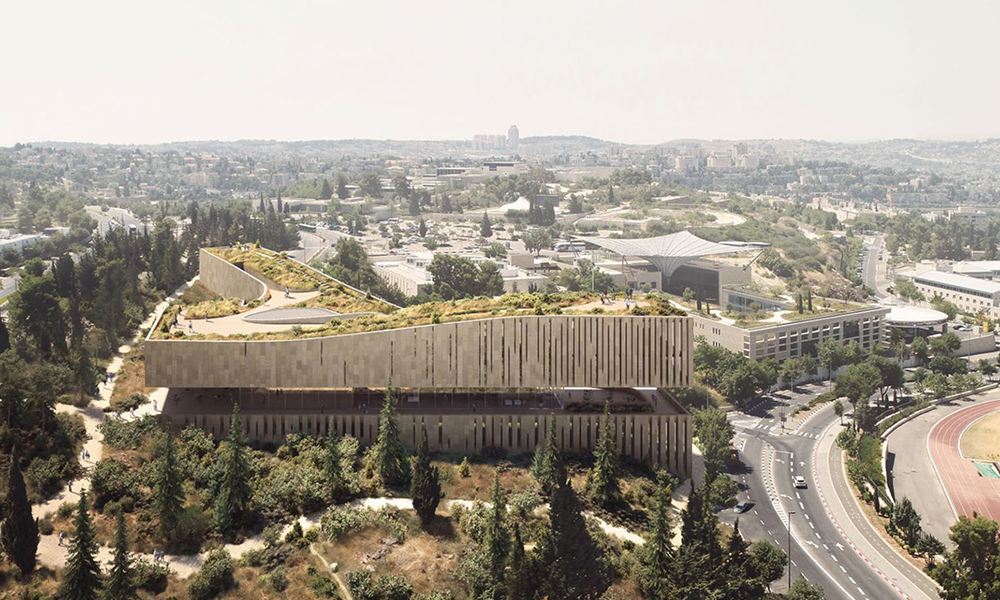 En planta, reacciona a la curva de la calle Stephan Weiz mientras se transforma en tres dimensiones a las formas rectilíneas de los Jardines Botánicos de Jerusalén y la Biblioteca Nacional más allá. El valor de su diseño innovador radica en su elevación y la creación de un parque público que conecta los terrenos circundantes. El techo ajardinado se convierte en una extensión natural del parque circundante, lleno de plantas autóctonas y techos verdes de varios niveles. Desde la distancia, el diseño parece una gran escultura en el centro del parque, ondulando en todas direcciones.