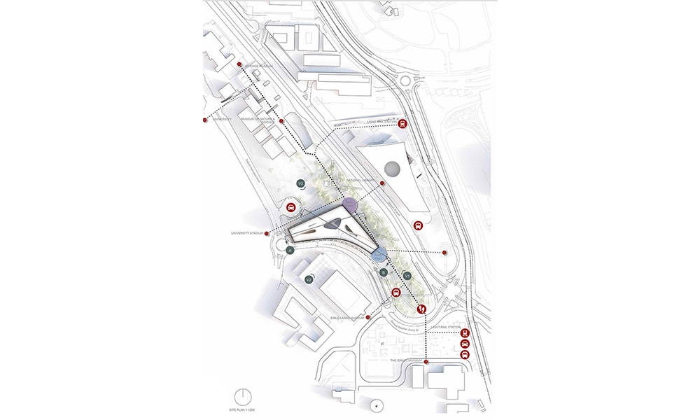 El diseño ofrece dos puntos de acceso principales: la plaza norte y la plaza sur. Desde cada plaza, la forma permite a los visitantes ascender desde el suelo a dos miradores que ofrecen vistas cautivadoras del distrito circundante. La forma del edificio, como el lenguaje mismo, se convierte en una función importante para conectar a un grupo diverso de visitantes y ciudadanos por igual.