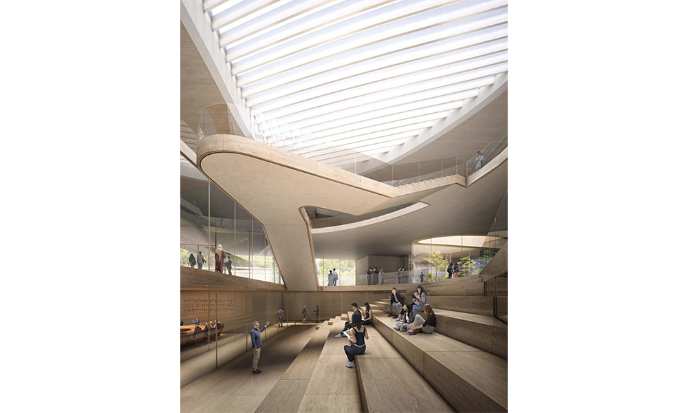 Ubicado entre el Museo de Israel, la Corte Suprema de Israel, el futuro sitio de la Biblioteca Nacional, la Knesset y la Universidad Hebrea, el diseño ofrece una fluidez de perspectivas y conexiones entre la Academia y su rico entorno.