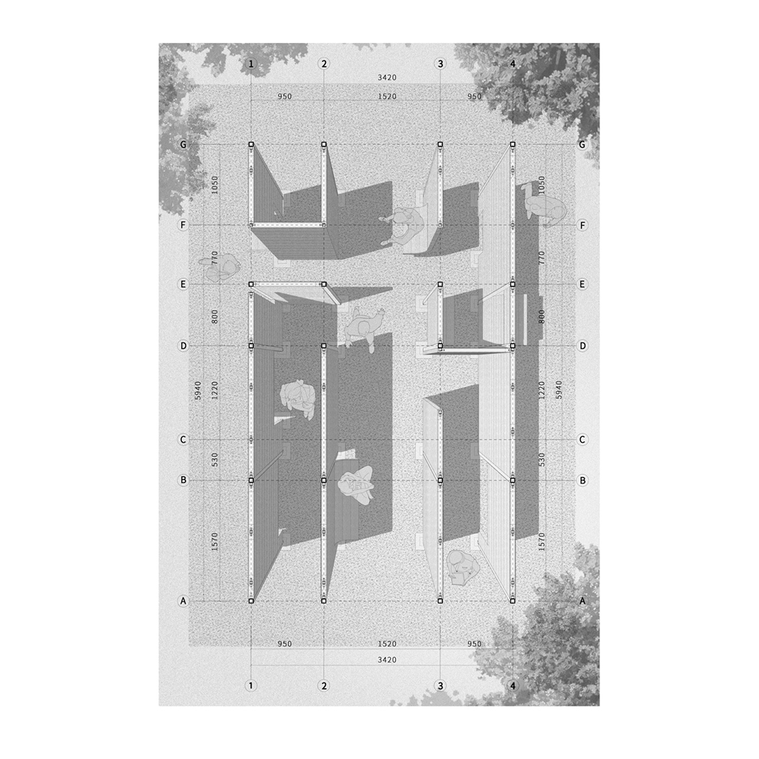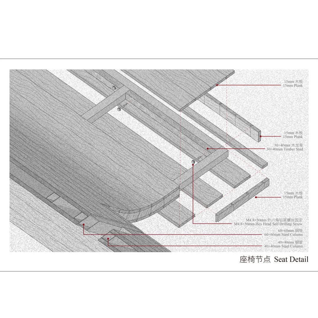 Basado en investigaciones teóricas previas, Wooden Pavilion #2 es un prototipo que combina teoría y práctica: basado en una escala humana, cada sección del pabellón se utiliza para establecer diferentes espacios para guiar a las personas y sus patrones de interacción. En términos del proceso de diseño específico, la estrategia de formación del Pabellón de Madera #2 comienza desde la escala humana y luego combina la proxémica, la conductología y la ergonomía para establecer aún más el camino y el comportamiento específicos de los visitantes en el espacio. Por lo tanto, las personas realizan diversas actividades sociales en las distintas secciones del pabellón, mientras disfrutan del armonioso entorno natural del río en el oeste y el ambiente humanístico del pueblo en el este.