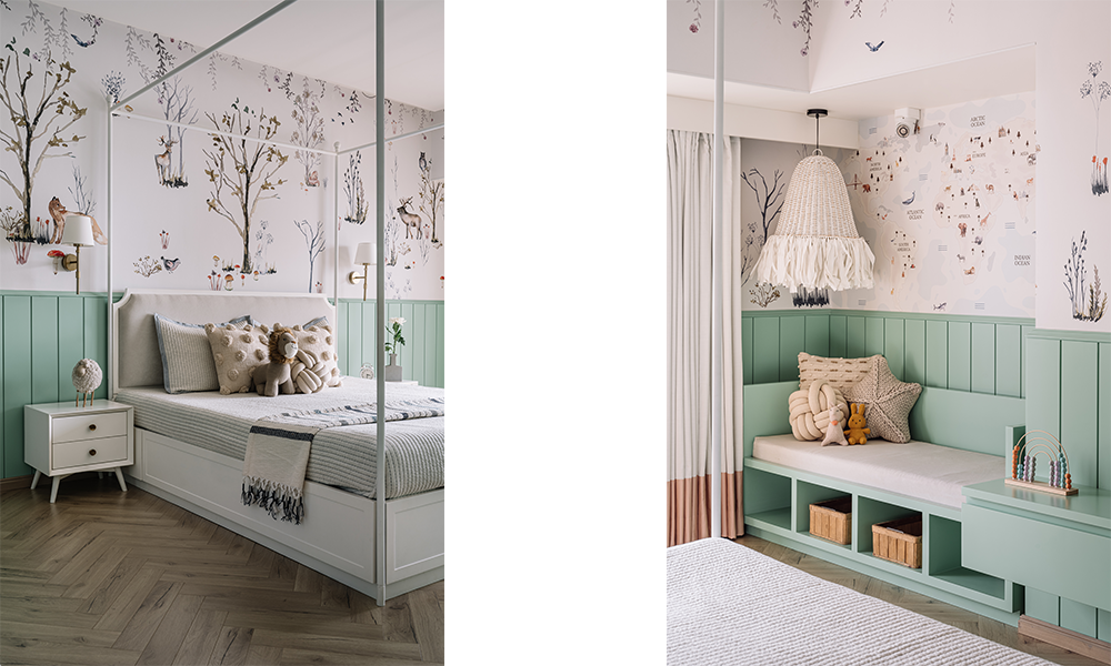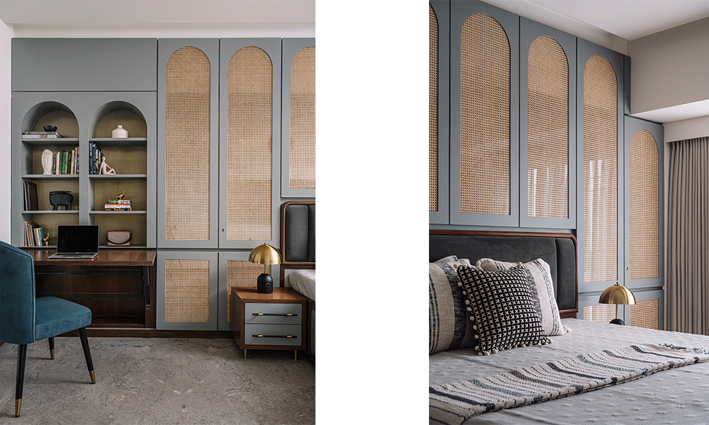 Diseñado como un refugio moderno, el dormitorio principal rezuma elegancia y lujo discreto. Los arcos se convierten en el lenguaje visual del espacio, realzados por materiales como la caña y láminas de latón perforado. Espacialmente, una cama colocada en el centro en madera de color nogal se sienta frente a un panel de pared con contraventanas arqueadas en un gris frío, equipado con caña intercalada entre el vidrio. Abordando las instrucciones del cliente, el respaldo de la cama oculta gabinetes para almacenamiento a lo largo de la habitación. En un extremo de la sala se encuentra un estudio, con una elegante mesa plegable de madera frente a una exhibición abierta de recuerdos, respaldada por láminas de latón perforadas que tienen luz de fondo y opulencia de canal.