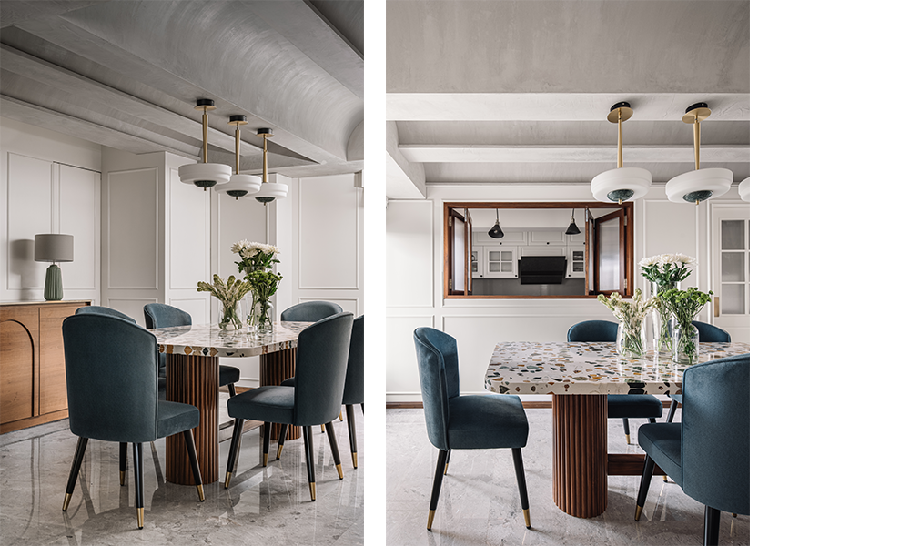 Un ingenioso juego de camuflaje se manifiesta en este espacio, ocultando ópticamente todos los servicios. Las vigas se tratan y transforman en un techo abovedado artístico y se acaban con un enlucido de cal gris. Los muros con detalle de molduras monocromáticas, ocultan las puertas de varios servicios, creando así un ambiente cohesionado y continuo. Una clásica ventana plegable corrediza de madera conecta el comedor con la cocina, ofreciendo privacidad flexible. En el otro lado de la abertura hay una cocina modular clásica en blanco y gris con un mostrador blanco sin costuras y una ranura que se combina con una serie de gabinetes de almacenamiento superiores con diferentes porosidades, lejos de la monotonía de un espacio de cocina habitual.