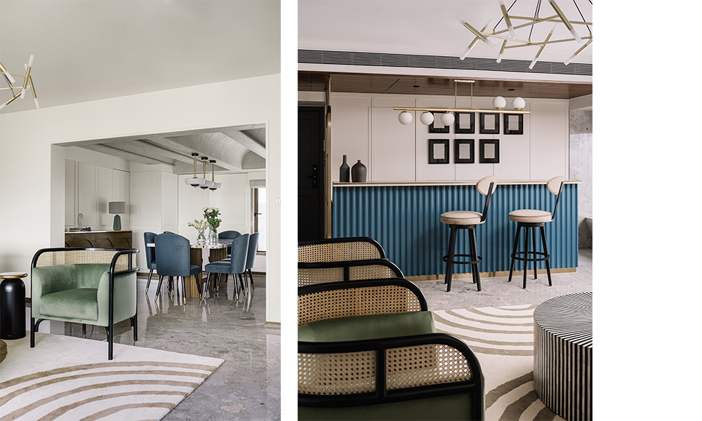El espacio habitable se convierte en un comedor a través de una abertura enmarcada. Siguiendo una estética análoga, el espacio está diseñado con una mesa de comedor personalizada hecha con una tapa de terrazo Kalinga sobre dos tallos de madera acanalados. La pieza esteta se combina con sillas de comedor azules con elegantes patas de metal con punta de latón. Un trío de luces suspendidas enfoca la ubicación, creando así un aura ambiental.
