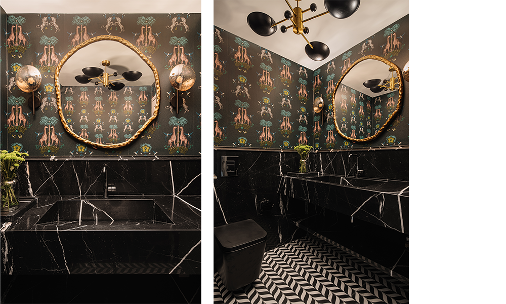 Dando forma al amor de los residentes por hospedar y entretener en la creación de espacios, los diseñadores crean un mostrador a lo largo de la sala de estar que actúa como una barra y un escritorio de trabajo improvisado, completo con un par de sillas altas. El mueble destaca en un estriado azul Egeo destacando el revestimiento de latón en el zócalo y el que recubre la parte superior. Las líneas verticales del acabado se yuxtaponen con un cálido techo de madera que alberga una lámpara minimalista que refleja los acentos metálicos. La coreografía del escenario construye la base para los marcos de arte monocromáticos. Con su grueso marco negro, equilibran el esquema de color al mismo tiempo que canalizan el movimiento del ojo hacia sí mismo y desde el tenue perfil de la puerta oculta al lado.