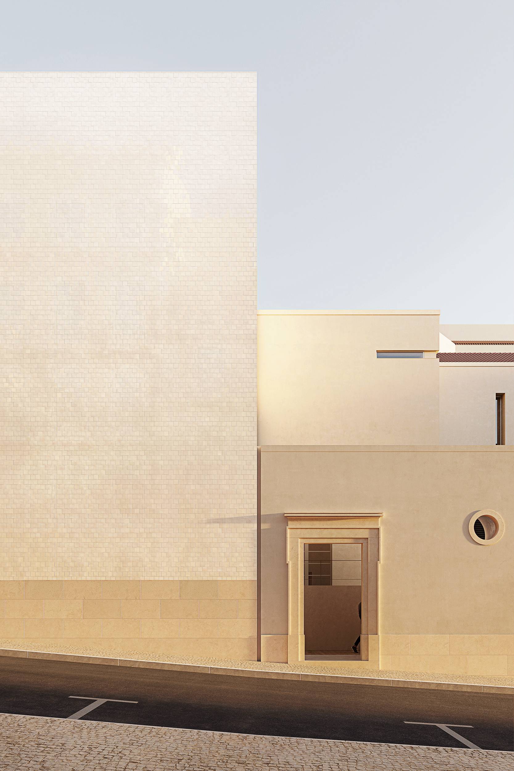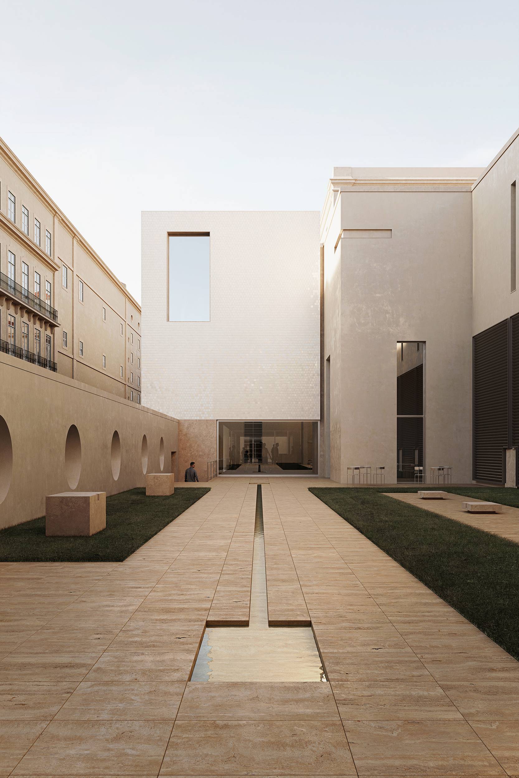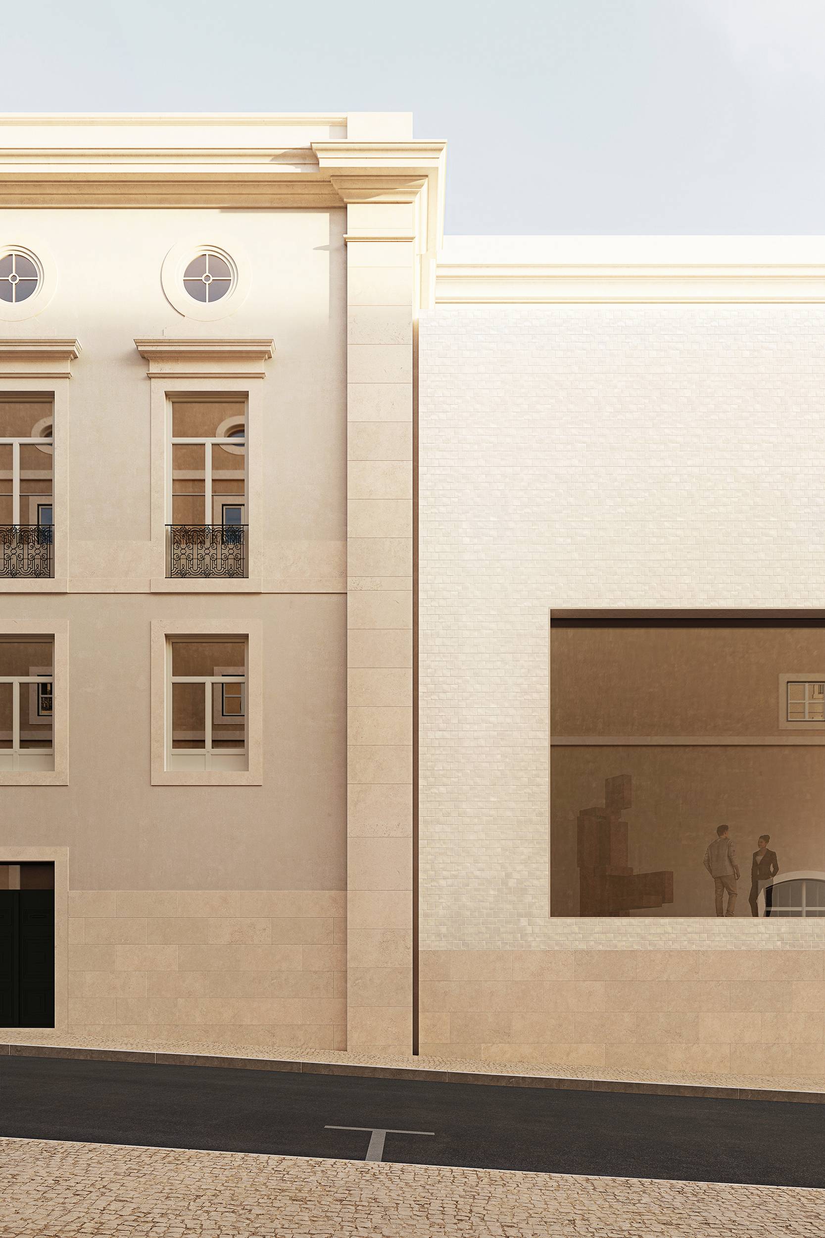 La estructura del nuevo volumen actúa como un mediador entre los edificios históricos, conectando espacios de exposición y áreas de circulación, y mejorando la experiencia del visitante. La base del edificio se reviste de piedra lioz, material emblemático de Lisboa, que le otorga una presencia respetuosa y enraizada en la tradición. En los niveles superiores, el uso de mosaico cerámico rústico aporta una textura moderna que enriquece el perfil visual del edificio. Este enfoque material refleja una armonía entre pasado y presente, permitiendo que el edificio se perciba como una extensión natural del barrio del Chiado.