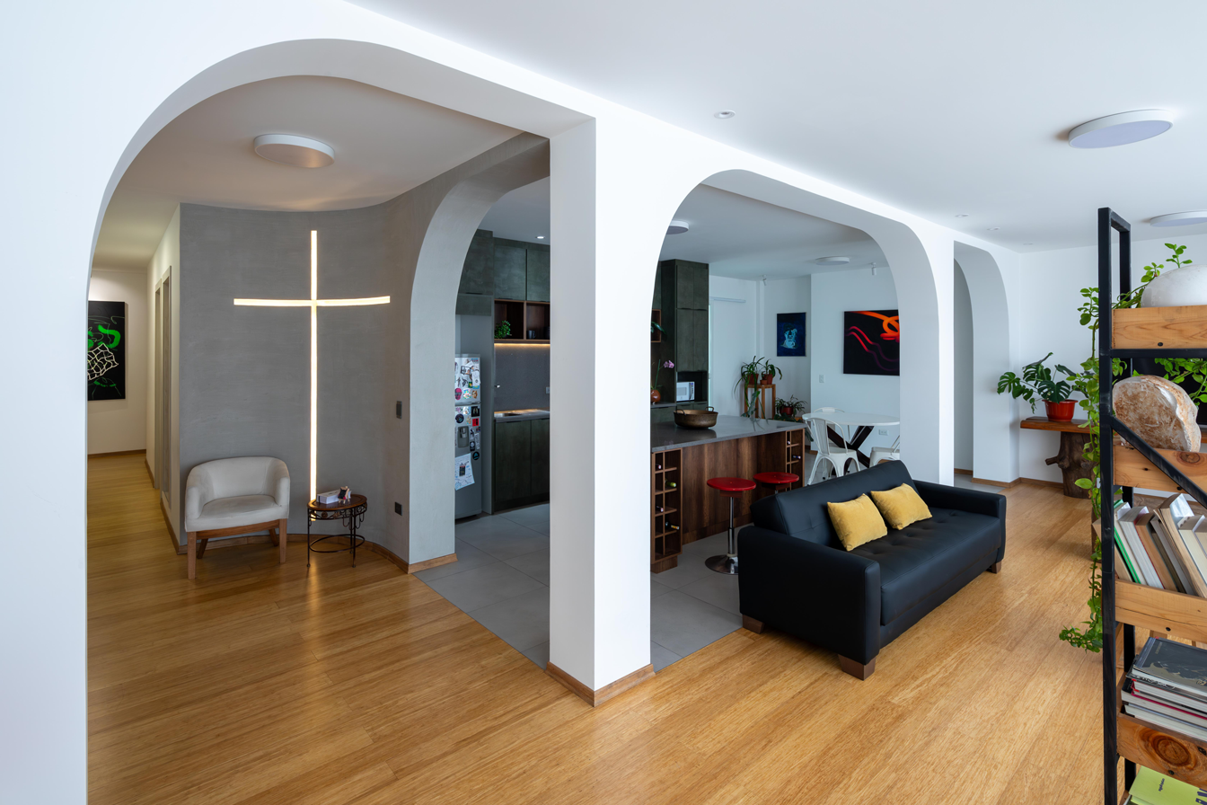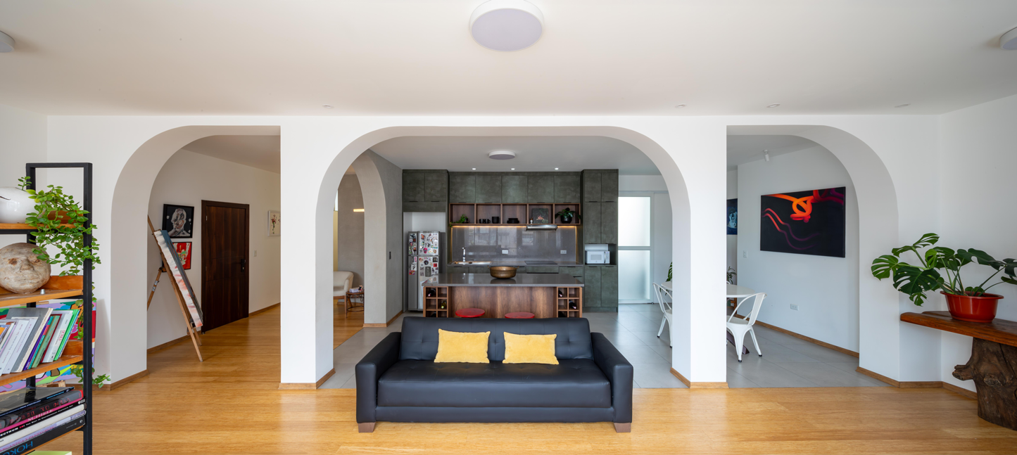 El apartamento forma parte de una edificación destinada para vivienda construido en los años ochenta, con estructura de hormigón armado y mampostería de ladrillo. Durante el proceso de diseño se determina la necesidad de unificar los espacios de estar de la vivienda: hall de ingreso, sala, comedor, cocina y estudio. Se derriban algunas paredes existentes y empieza a existir una fluidez espacial con el ingreso de luz natural. Sin embargo, surge la necesidad de generar una pausa para que los usuarios puedan disfrutar de cada uno de los espacios propuestos. Es por eso, que se propone generar una transición en forma de umbral, y que esta se marque claramente a través de un elemento que permita respetar la identidad de cada estancia y mantener sus diferencias.