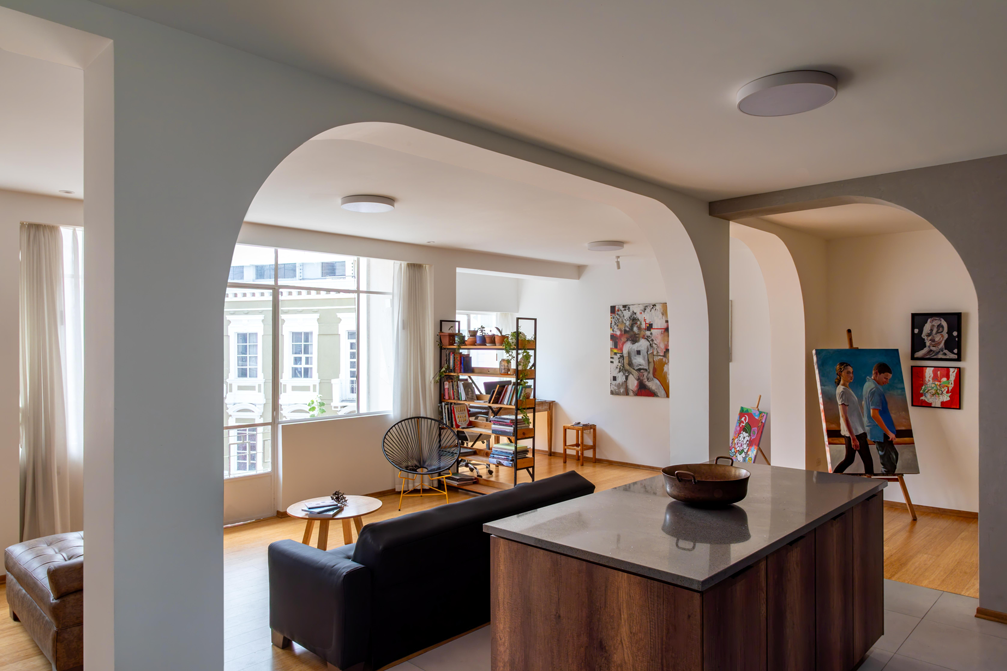 La ubicación del proyecto en el casco colonial del Centro Histórico de Quito permite una conexión profunda con la historia del lugar. Las visuales desde el balcón, nos deja apreciar la evolución arquitectónica de la ciudad: historicismo, eclecticismo y edificaciones del movimiento moderno y postmoderno.