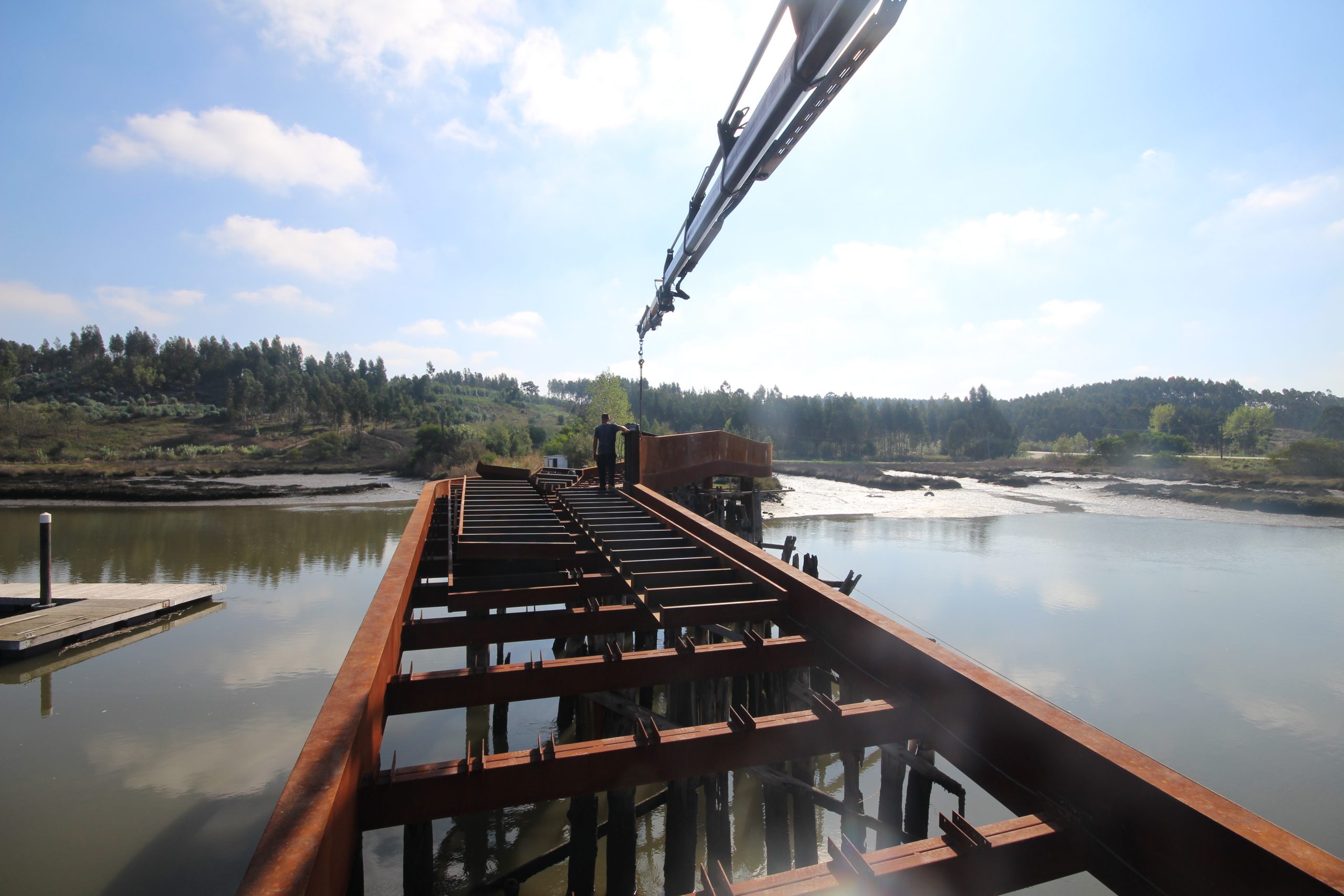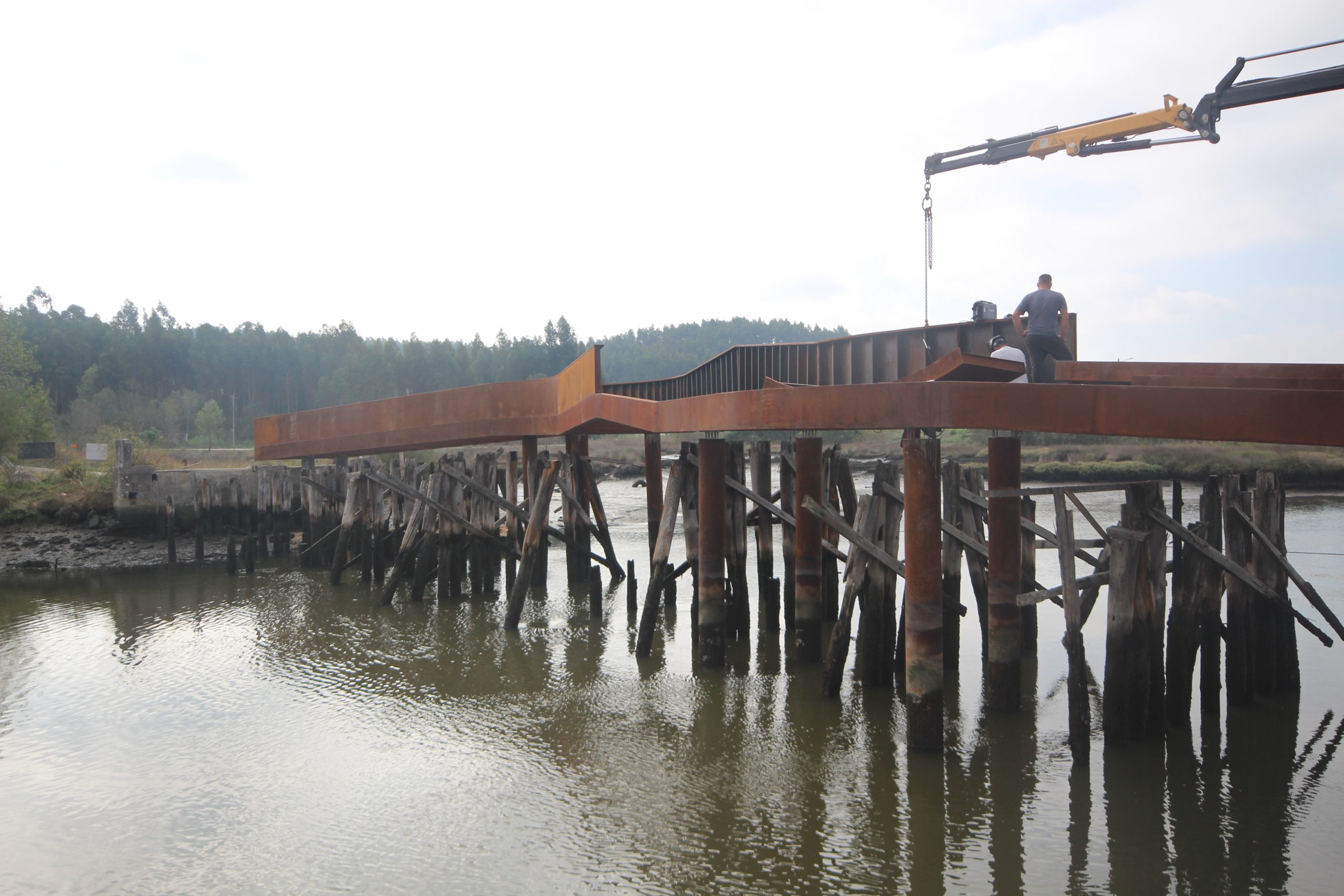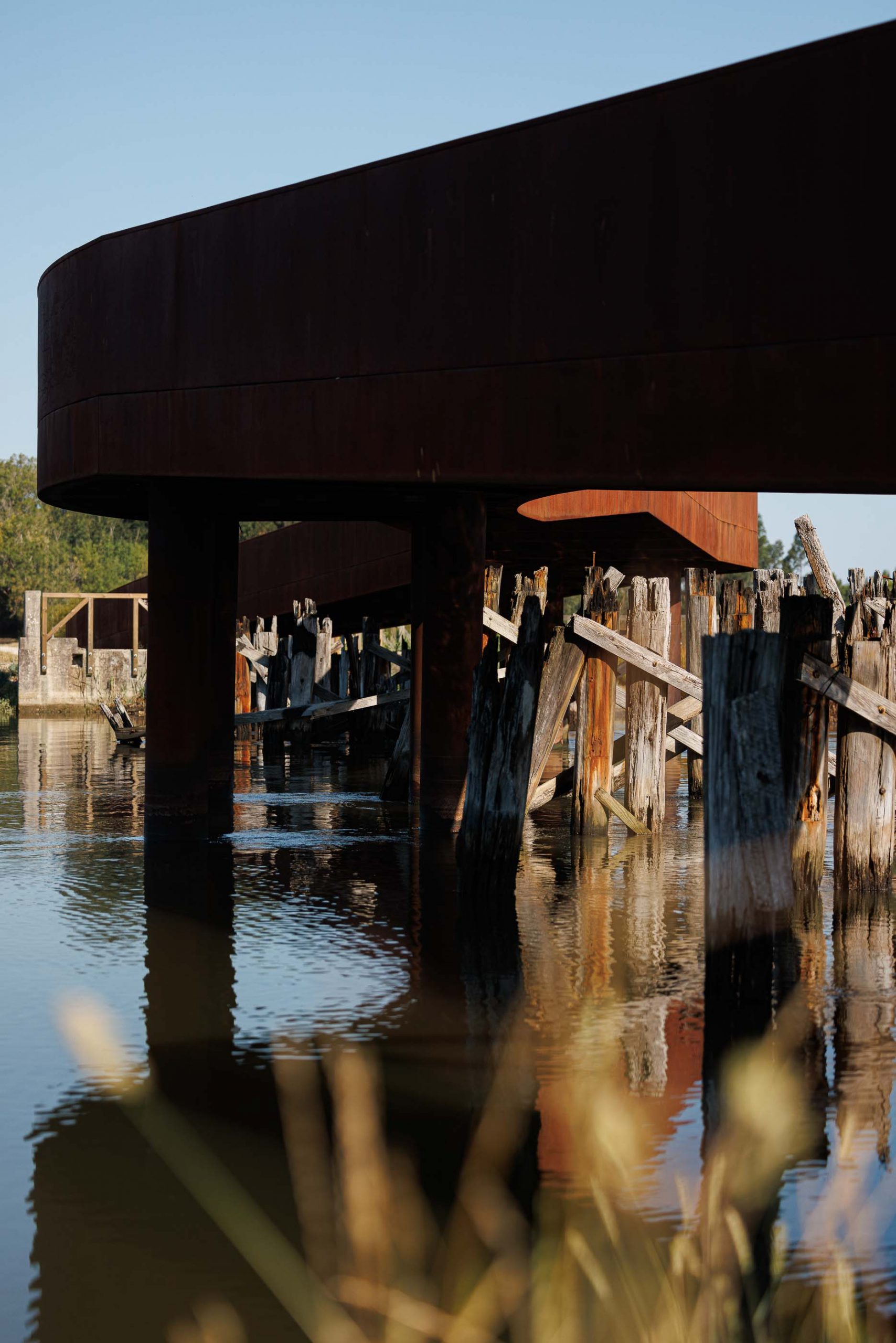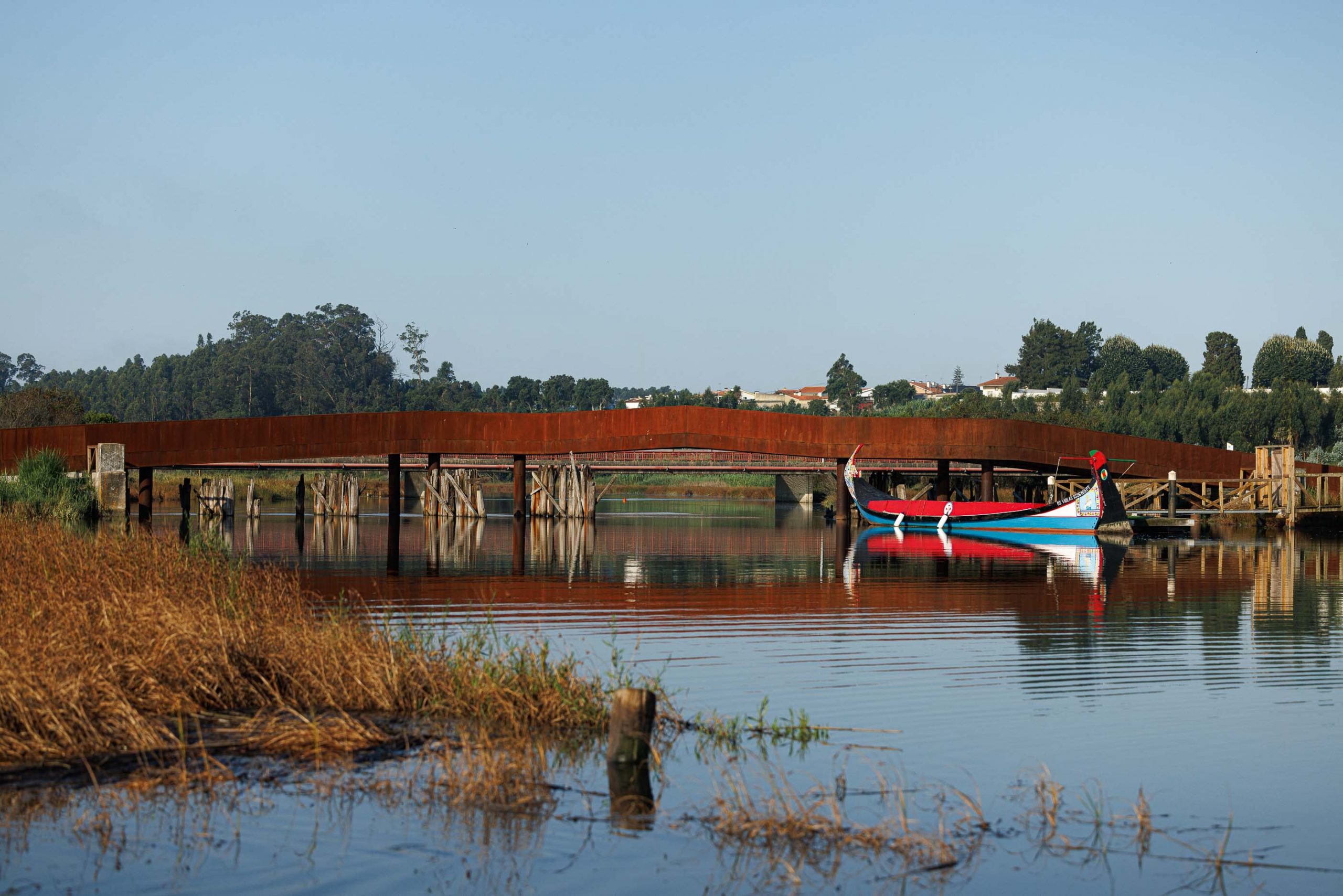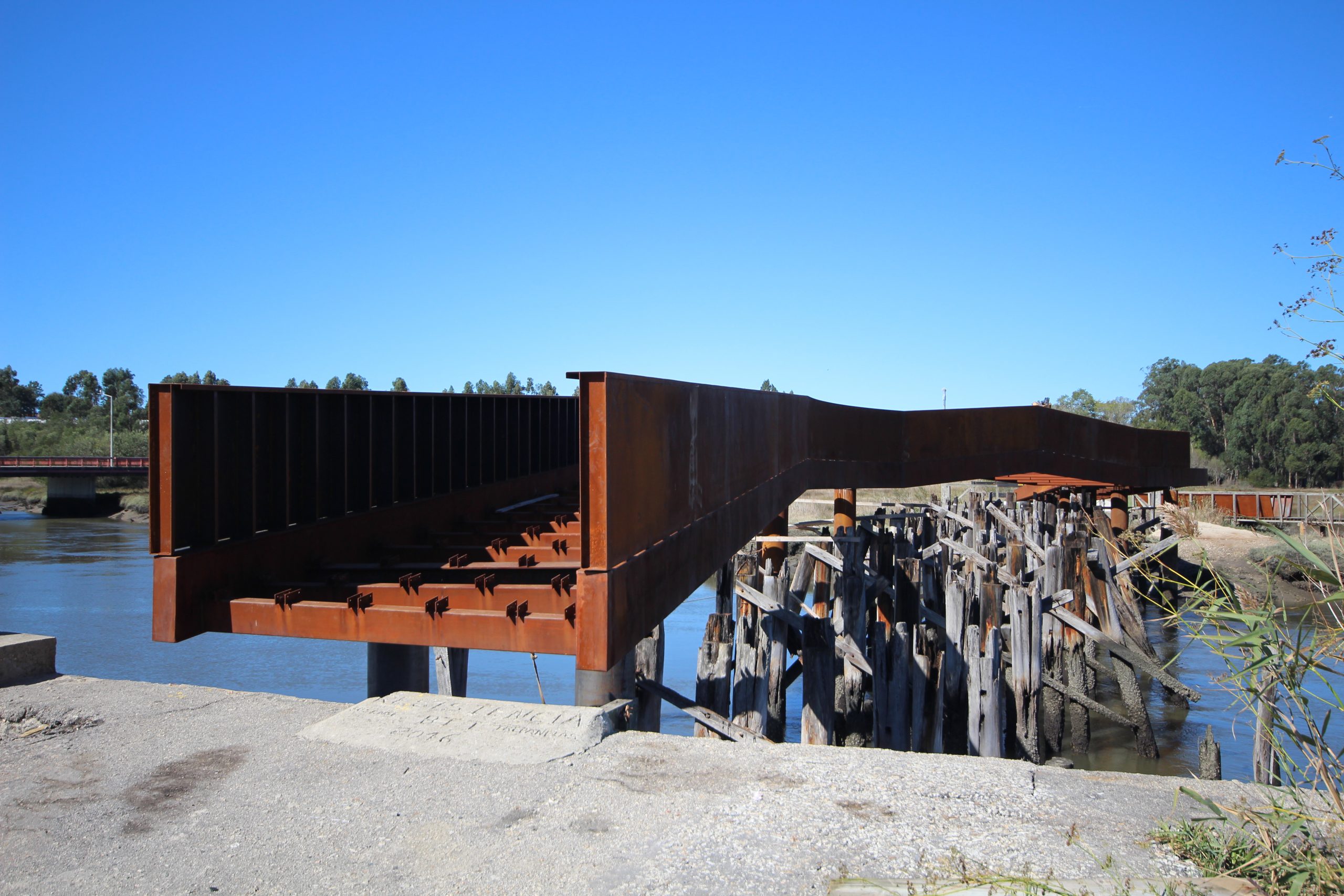El Ayuntamiento nos propuso el proyecto de un nuevo paso de peatones y ciclistas entre las orillas de Vagos y Sousa. El antiguo puente, construido el 27 de junio de 1855 y clausurado en 1978, se encuentra actualmente en ruinas y debe conservarse como parte integrante del paisaje y de la memoria histórica del lugar. Sin embargo, siendo conscientes de que las ruinas pueden acabar desapareciendo con el tiempo, el principal reto era diseñar un «puente museo» que valorizara la estructura existente, al tiempo que tuviera identidad propia y fuera capaz de perdurar y funcionar de forma autónoma en el futuro.