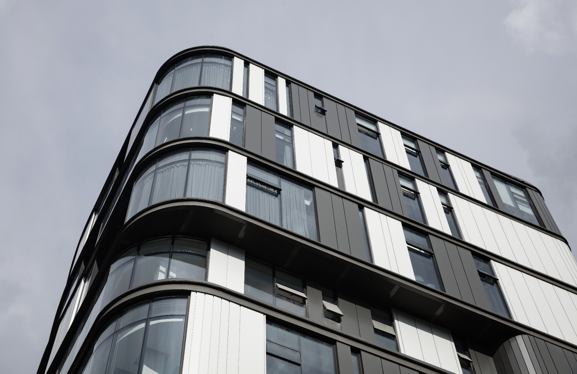 La piel del edificio es compleja tanto en su morfología como en su construcción, se optó por pixelar toda la envoltura y parametrizar los elementos; un valor trasparente para las zonas de vistas y un opaco para las zonas de servicios. Para los sólidos se usó steel framing y fachada ventilada con ACM, en los transparentes vidrio cámara trasparente, de esta manera el objeto se integró al contexto totalmente heterogéneo sin sacrificar su aspecto tecnológico. El material fue colocado de tal manera que se generen “estrías” y la idea de fragmentación se potencie al máximo y con una cromática rica en cambios y que se aprecia siempre inesperada debido al pixelado.
