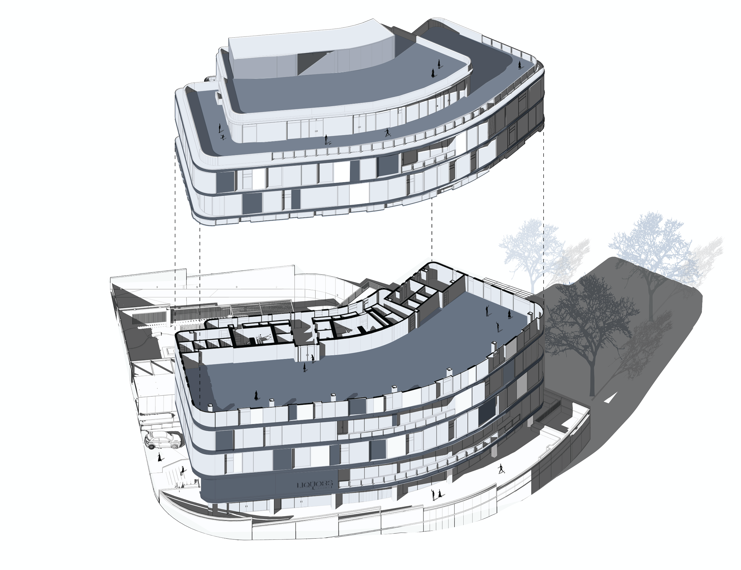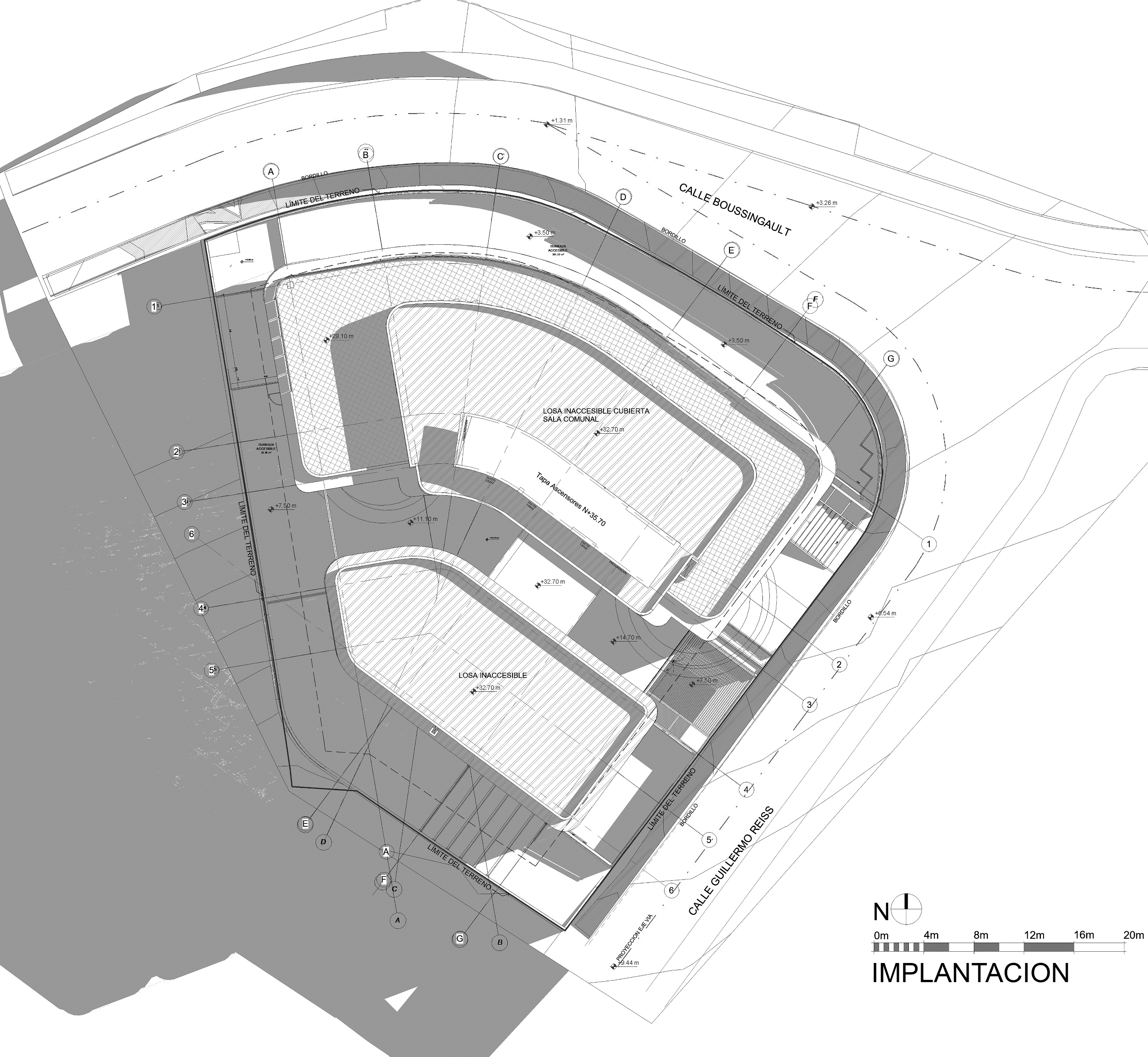 El desafío de implantar un edificio corporativo en una zona residencial en mayoría, un solar totalmente amorfo en su contorno y con 11 metros de desnivel implica estrategias geométricas, tecnológicas, estructurales y constructivas importantes con el fin de resolver los requerimientos de un cliente exigente.