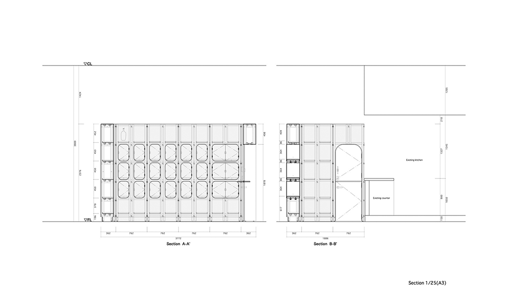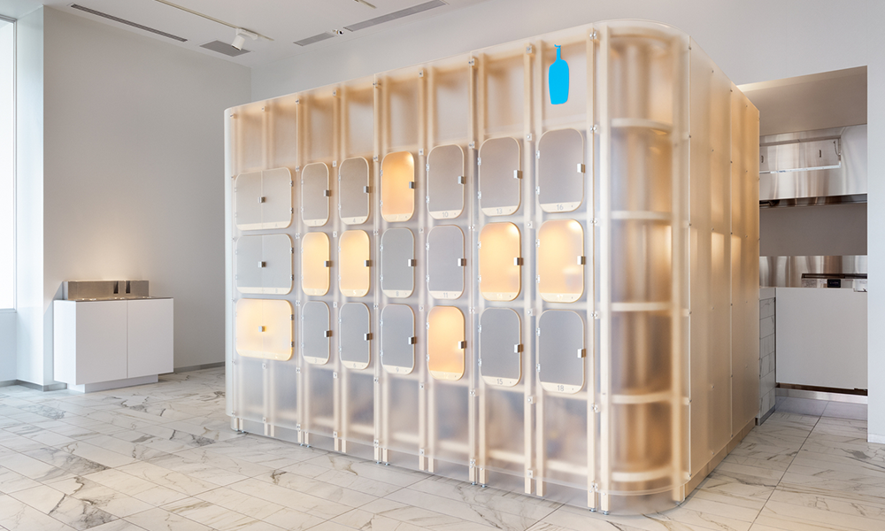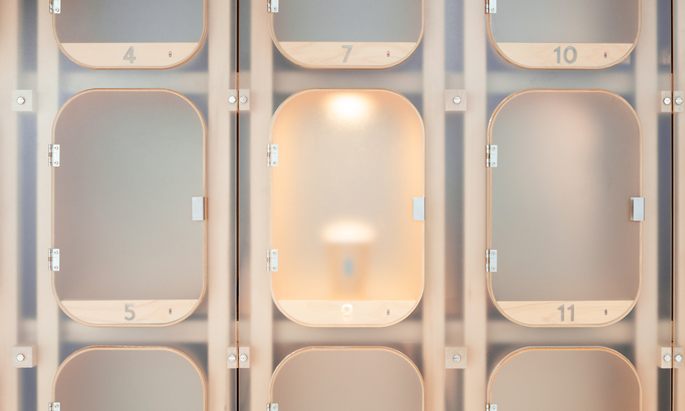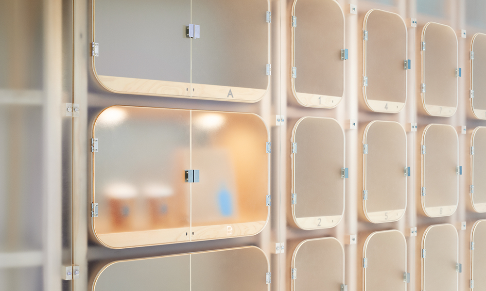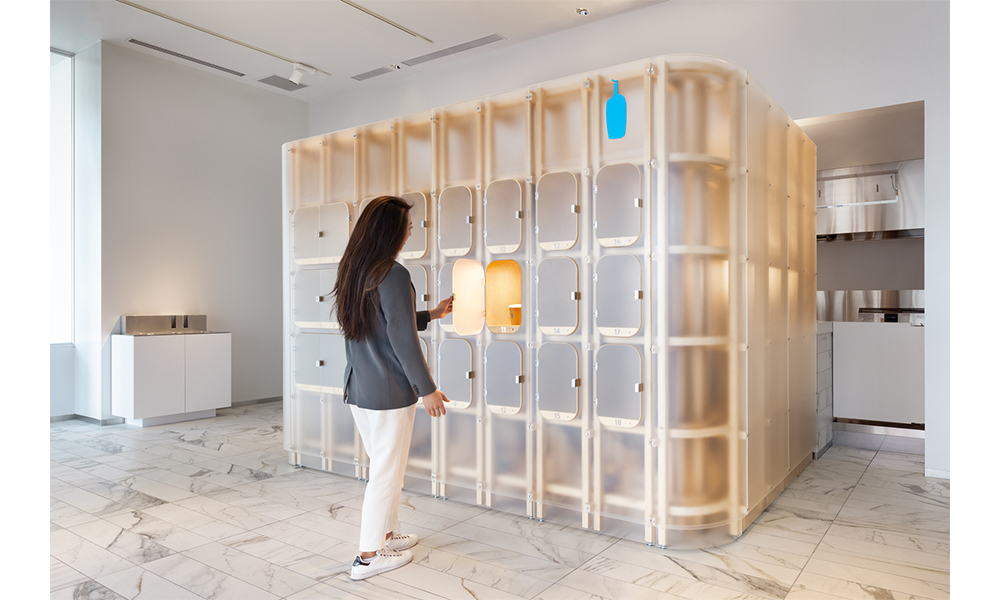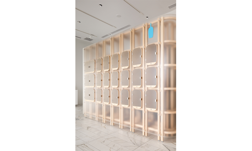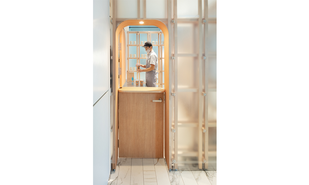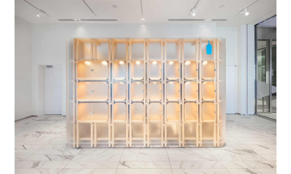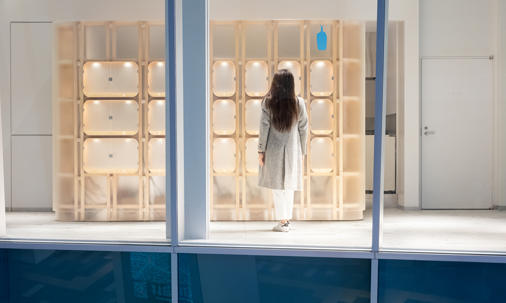Este proyecto se inició cuando James Freeman, el fundador de Blue Bottle Coffee, me hizo la oferta después de mucho tiempo. Este desarrollo se inició como respuesta a que la atención al cliente presencial se estaba volviendo cada vez más difícil debido a la pandemia del COVID-19, y se necesitaban medidas para la atención indirecta al cliente. El diseño se inspiró en la imagen de una colmena. Hasta hace poco era importante colocar siempre el mostrador frente a la entrada para dar la bienvenida a las personas, pero lamentablemente ya no es factible. Ahora, la clave está en cómo transmitir la calidez de forma indirecta. Decidimos usar básicamente madera para crear un mecanismo que brille suavemente en respuesta a la apertura y cierre de la puerta, y cubrimos la superficie con acrílico esmerilado para dejar que el brillo se filtrara suavemente. El «accesorio de venta estilo casillero» resultante ahora está disponible en la parte delantera de la tienda, donde puede ordenar y comprar bebidas desde una terminal de pedidos de bebidas dedicada, y es posible que deba esperar un poco. Pero pronto, podrá ordenar de forma remota con una aplicación móvil y comprar una deliciosa taza de café sin tiempo para esperar. Este accesorio se usará más ampliamente en combinación con métodos de venta tan fluidos.