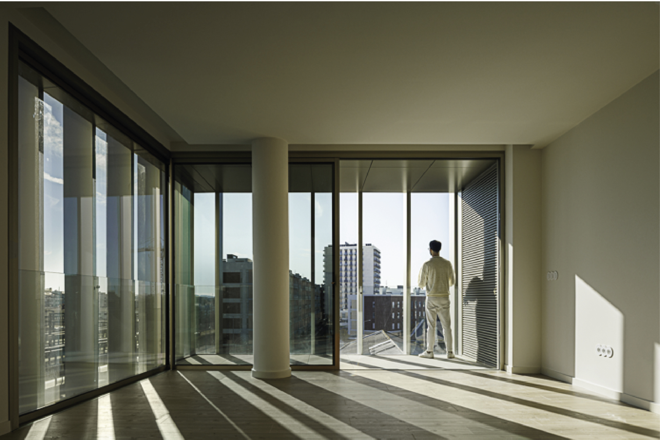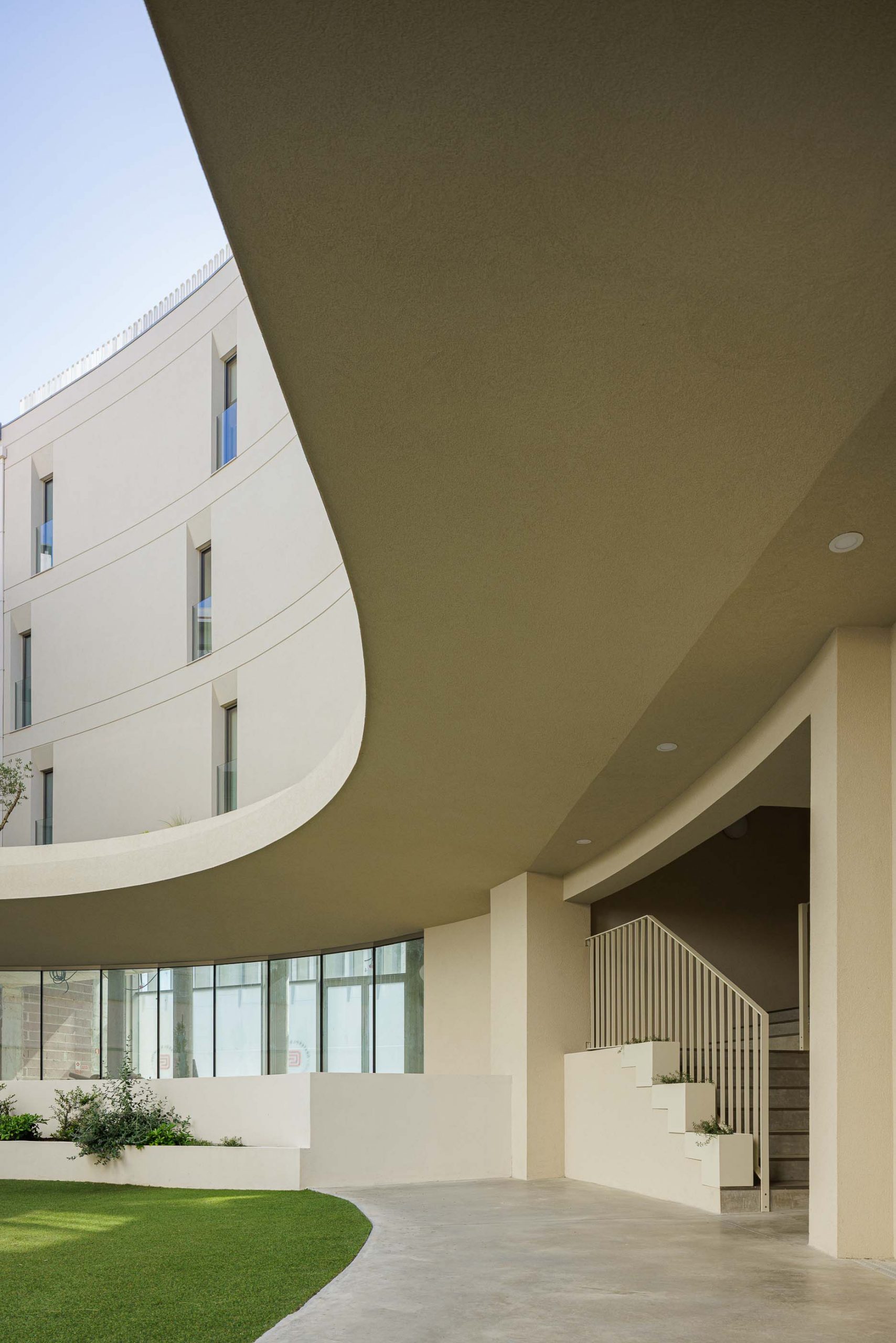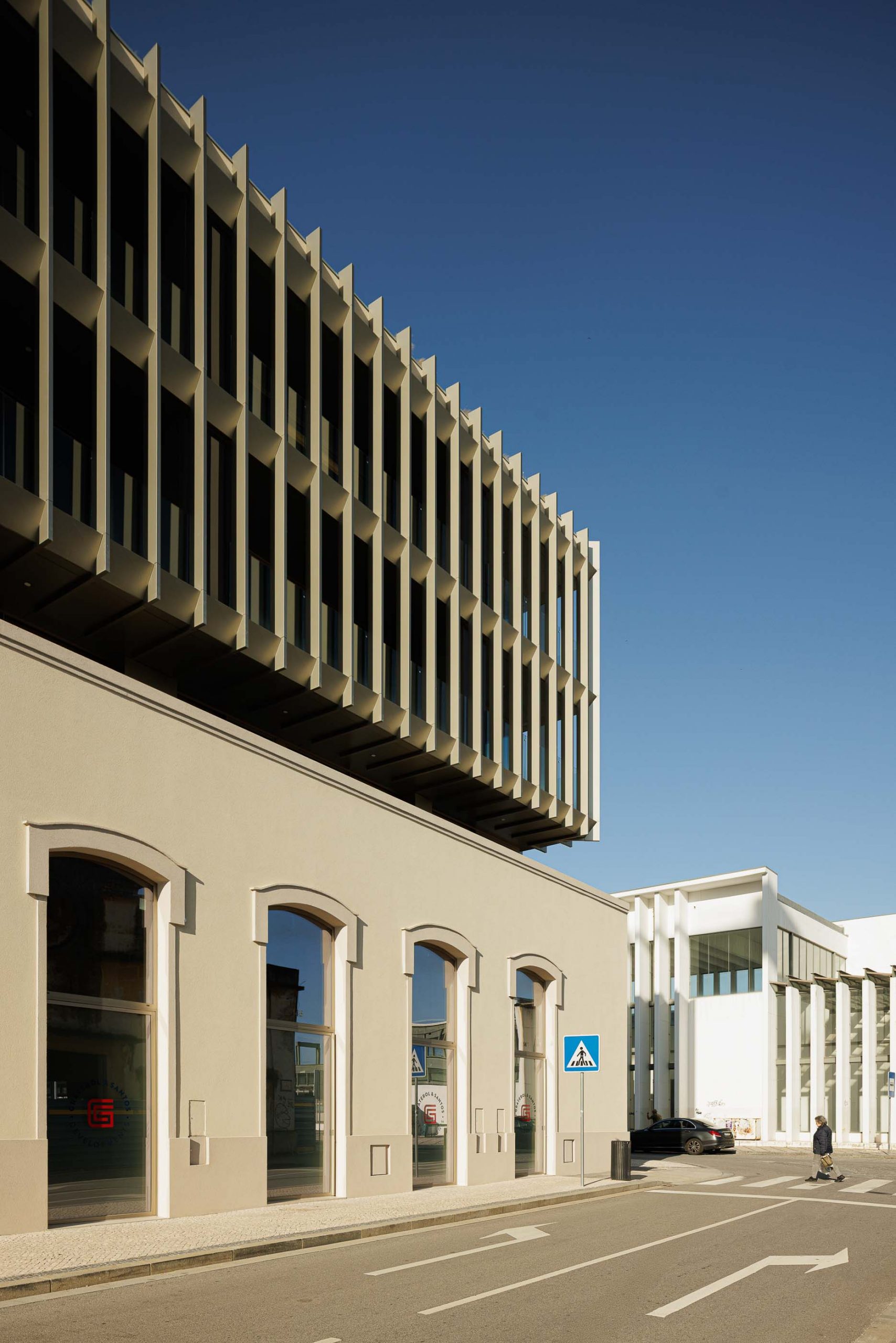 La nueva construcción se relaciona con la preexistente, siguiendo el alineamiento retraído de los pisos superiores del edificio vecino en la calle Dr. Arlindo Vicente. Este volumen se prolonga hasta el límite de la parcela en la calle Comandante Rocha e Cunha, liberando los dos últimos pisos, que se proyectan sobre la fachada preexistente, reforzando el alineamiento altimétrico de dicha calle. Si en la calle Dr. Arlindo Vicente la estrategia fue retraer el volumen nuevo para diferenciarlo claramente de la preexistencia, en el otro lado se quiso usar el vacío/negativo como elemento de transición entre los dos volúmenes distintos. Este espacio vacío/negativo actúa como terraza exterior para las unidades del primer piso, utilizando la preexistencia como baranda.