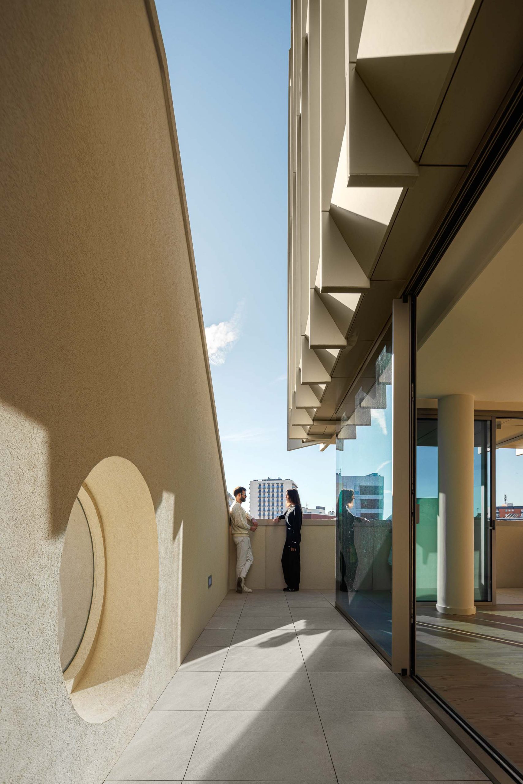 El último nivel (azotea) se configura como un espacio común, que incluye una zona técnica para paneles solares y un área de ocio y disfrute del paisaje urbano y las vistas sobre la ciudad.