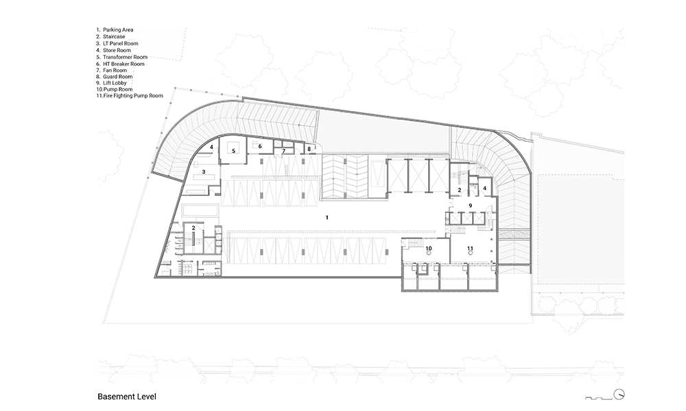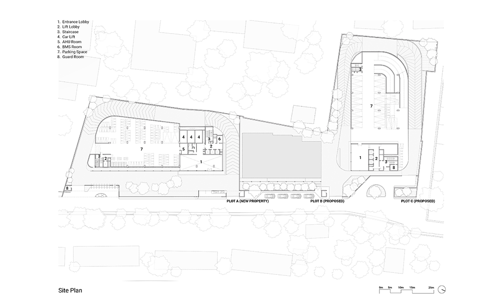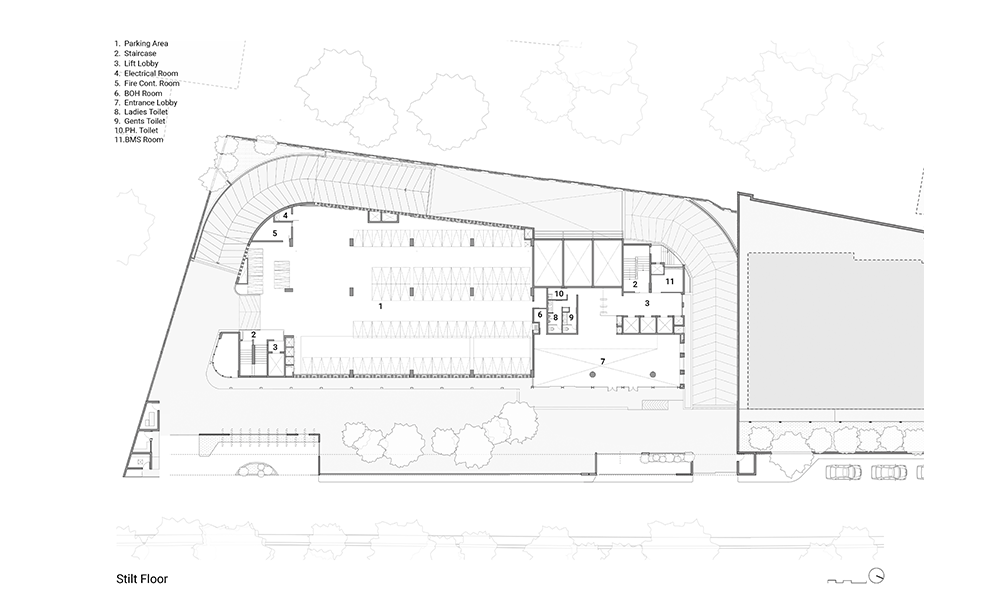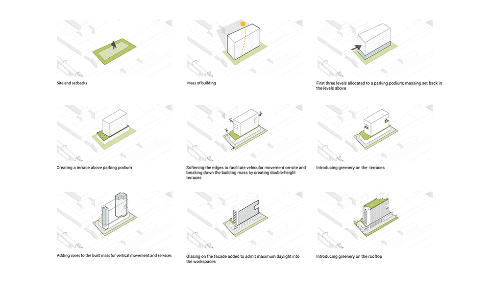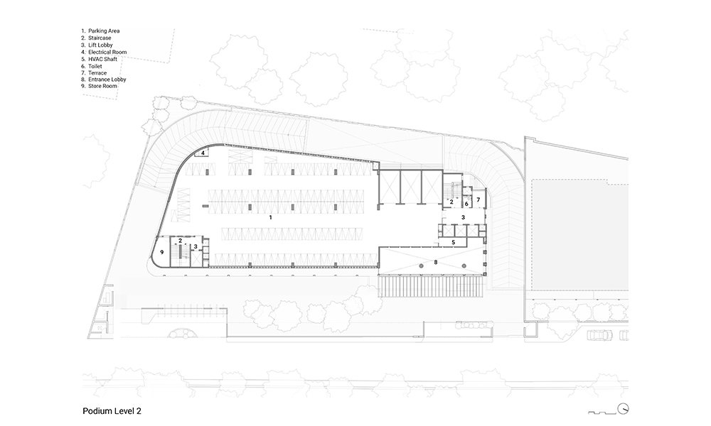 Dado que el desarrollo está cerca de la llanura aluvial de Yamuna, el alto nivel freático significaba que las condiciones del suelo en el área resultarían desfavorables para excavaciones profundas. Además, los análisis de impacto del tráfico requirieron la necesidad de un estacionamiento vehicular profundo de dos o tres sótanos, lo que planteó un desafío inusual para el equipo de diseño. Para dar cuenta del estacionamiento vehicular del Bloque A de ocho pisos que se construiría en el sitio, se ideó un podio de estacionamiento que simultáneamente abre volumen para la creación de un amplio vestíbulo de recepción de triple altura en la planta baja. La intervención resultante también optimiza las vistas, mientras que el vestíbulo de recepción ofrece a los ocupantes vistas de la exuberante vegetación que flanquea el edificio, el nivel de la terraza desde el primer piso en adelante ofrece vistas prácticamente sin obstáculos de la Casa de Adoración Baha’i y el horizonte más allá. Además, el podio se ha configurado de tal manera, a lo largo del noroeste del edificio, que su altura es aproximadamente la misma que la de la colonia ferroviaria adyacente, maximizando así las vistas a lo largo de esta parte del edificio también.