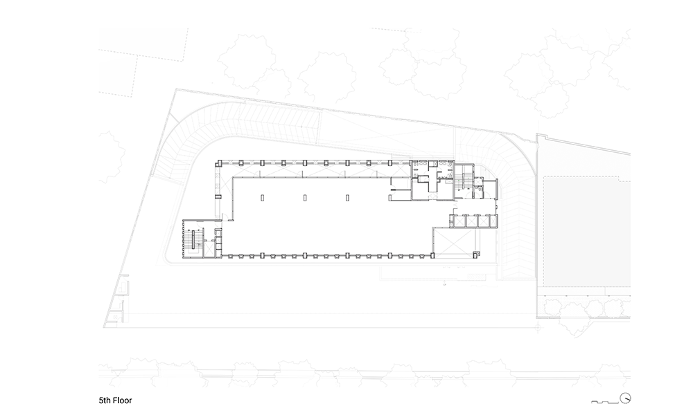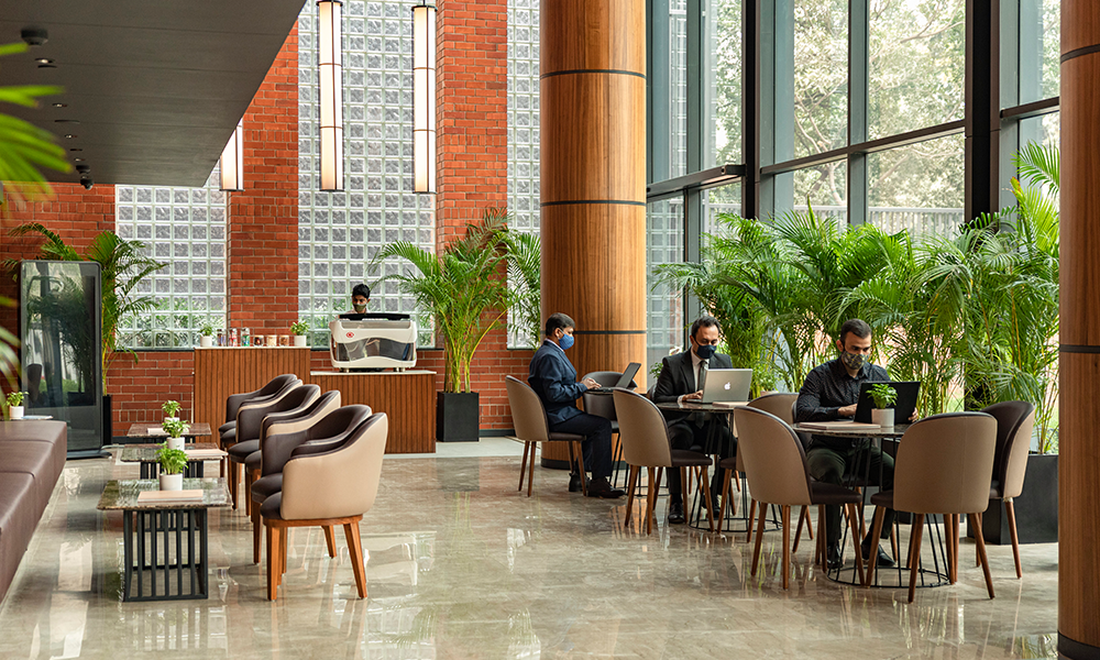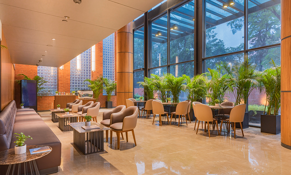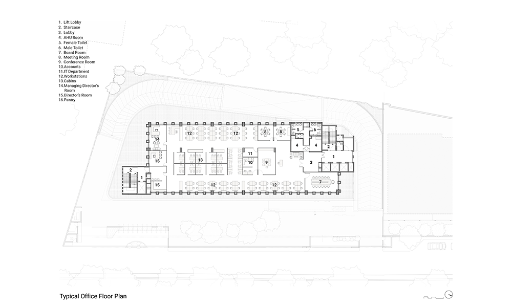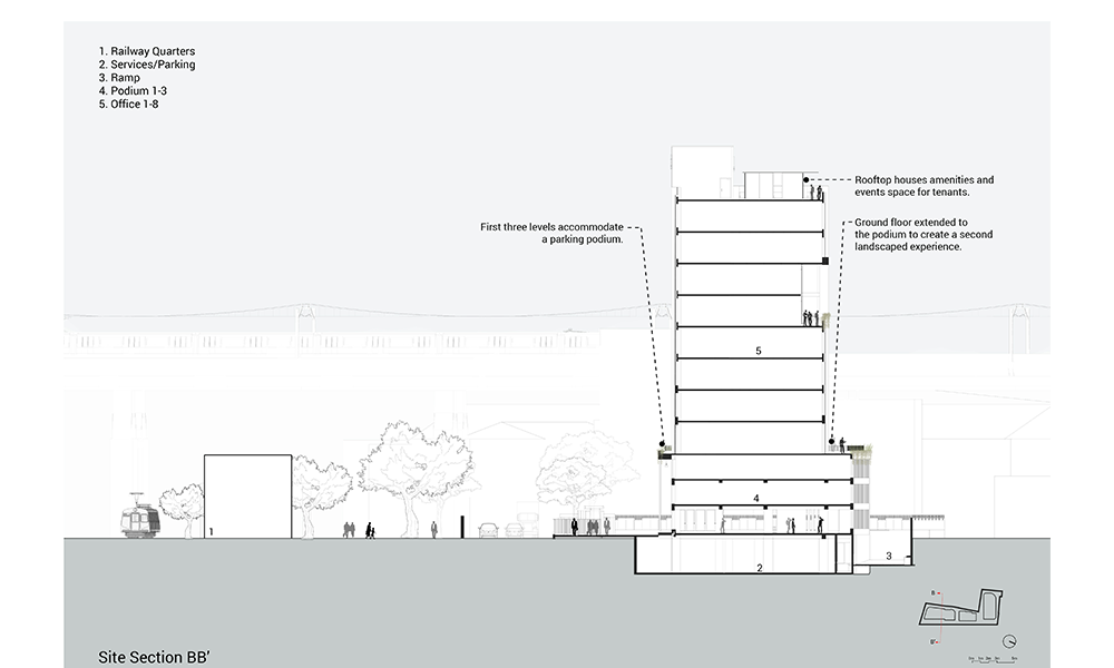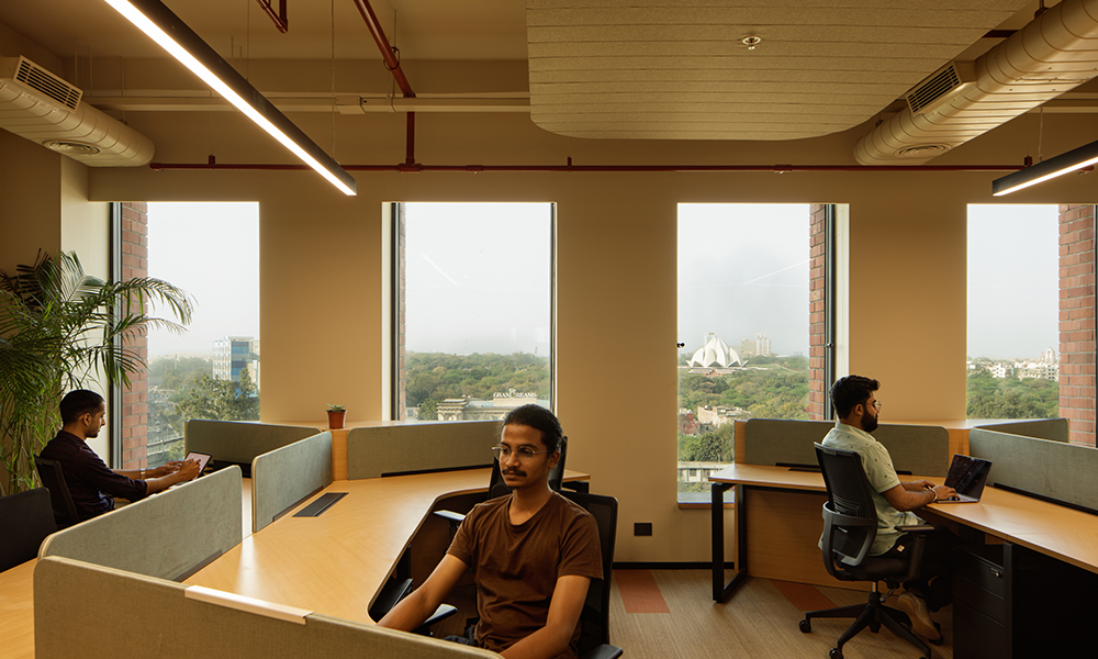 Dado que el desarrollo está cerca de la llanura aluvial de Yamuna, el alto nivel freático significaba que las condiciones del suelo en el área resultarían desfavorables para excavaciones profundas. Además, los análisis de impacto del tráfico requirieron la necesidad de un estacionamiento vehicular profundo de dos o tres sótanos, lo que planteó un desafío inusual para el equipo de diseño. Para dar cuenta del estacionamiento vehicular del Bloque A de ocho pisos que se construiría en el sitio, se ideó un podio de estacionamiento que simultáneamente abre volumen para la creación de un amplio vestíbulo de recepción de triple altura en la planta baja. La intervención resultante también optimiza las vistas, mientras que el vestíbulo de recepción ofrece a los ocupantes vistas de la exuberante vegetación que flanquea el edificio, el nivel de la terraza desde el primer piso en adelante ofrece vistas prácticamente sin obstáculos de la Casa de Adoración Baha’i y el horizonte más allá. Además, el podio se ha configurado de tal manera, a lo largo del noroeste del edificio, que su altura es aproximadamente la misma que la de la colonia ferroviaria adyacente, maximizando así las vistas a lo largo de esta parte del edificio también.