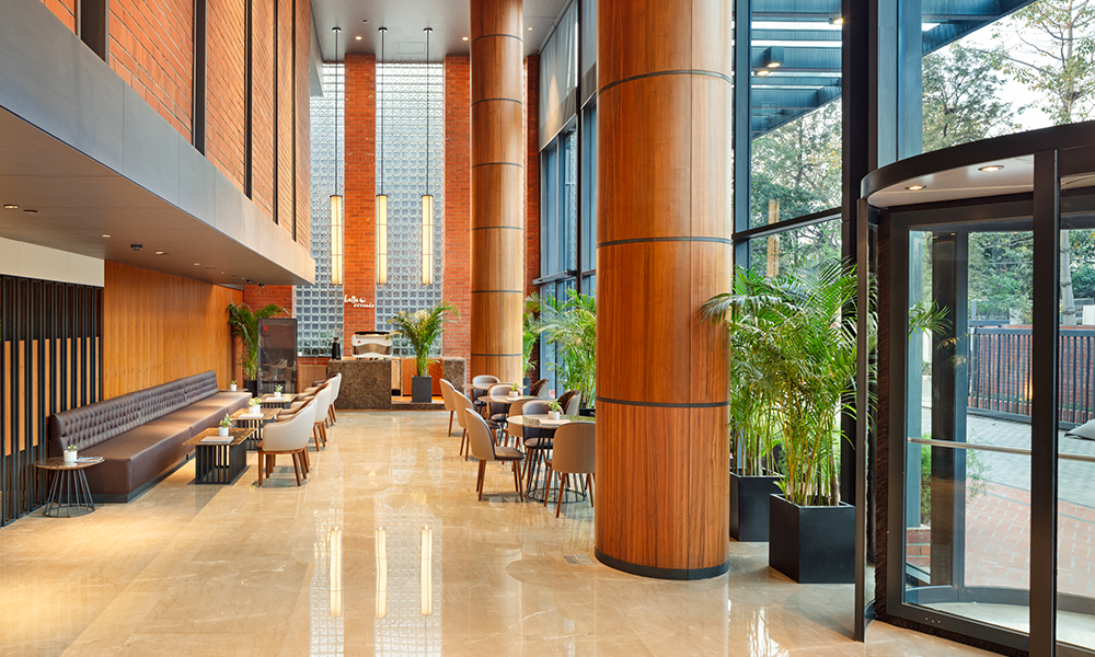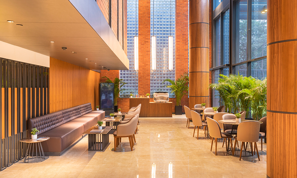 El esquema de diseño extiende la expresión del ladrillo visto a los interiores, inyectando espacios con un atractivo natural y «artesanal». Mientras que el ladrillo y los bloques de vidrio crean el enfoque retro chic de los interiores del vestíbulo de triple altura, los tonos neutros de piedra y enchapado impregnan las superficies con una elegancia discreta.