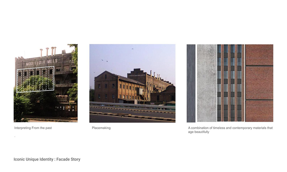 El sitio está junto a una calle bulliciosa, frente a un corredor de metro de este a oeste, y está a tiro de piedra de antiguos edificios industriales como Modi Flour Mills y Baha’i House of Worship, un hito icónico y atracción turística. Esto presentó una oportunidad para que el estudio determinara el vocabulario de diseño general del desarrollo.