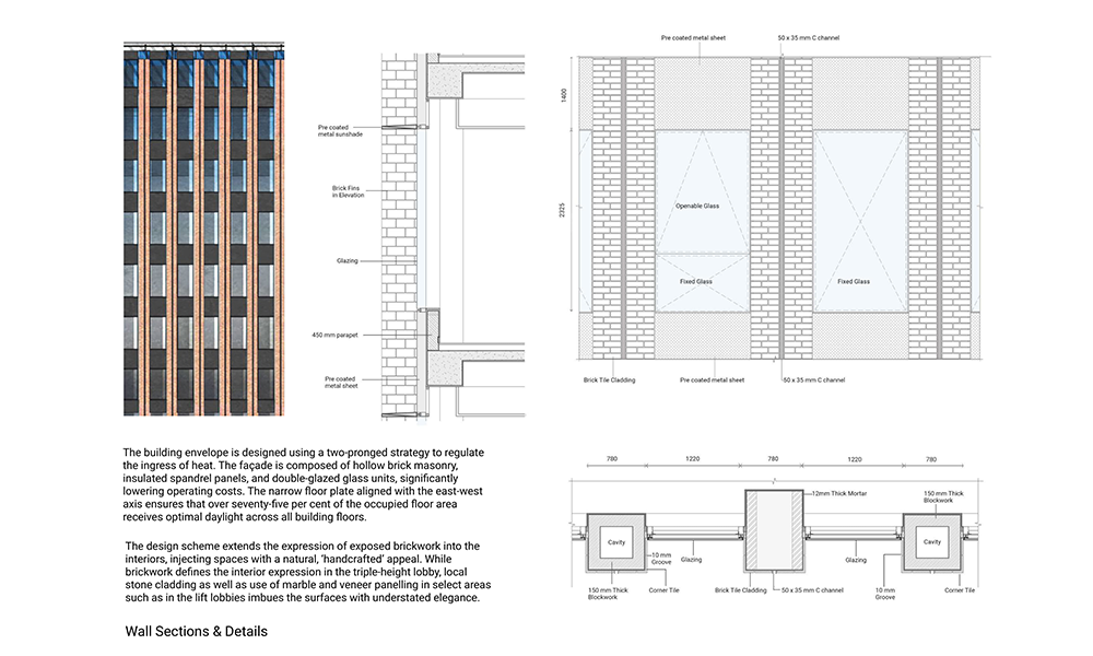 La envolvente del edificio está diseñada utilizando una estrategia doble para regular la entrada de calor. La fachada está compuesta por mampostería de ladrillo hueco, paneles de tímpanos aislados y unidades de vidrio de doble acristalamiento, lo que reduce significativamente los costos operativos. Las placas de piso angostas aseguran que más del setenta y cinco por ciento del área de piso ocupada reciba luz natural óptima en todos los pisos del edificio. Las áreas de derrame facilitan la circulación de aire fresco a los espacios ocupados en al menos un treinta por ciento por encima de las tasas mínimas requeridas por la Norma 62.1-2010 de la Sociedad Estadounidense de Ingenieros de Calefacción, Refrigeración y Aire Acondicionado (ASHRAE). Se instalarán hasta ochenta y dos tejas de alto índice de reflexión solar (SRI) en el techo para minimizar el impacto en el microclima y reducir la ganancia y pérdida de calor a través del volumen construido.