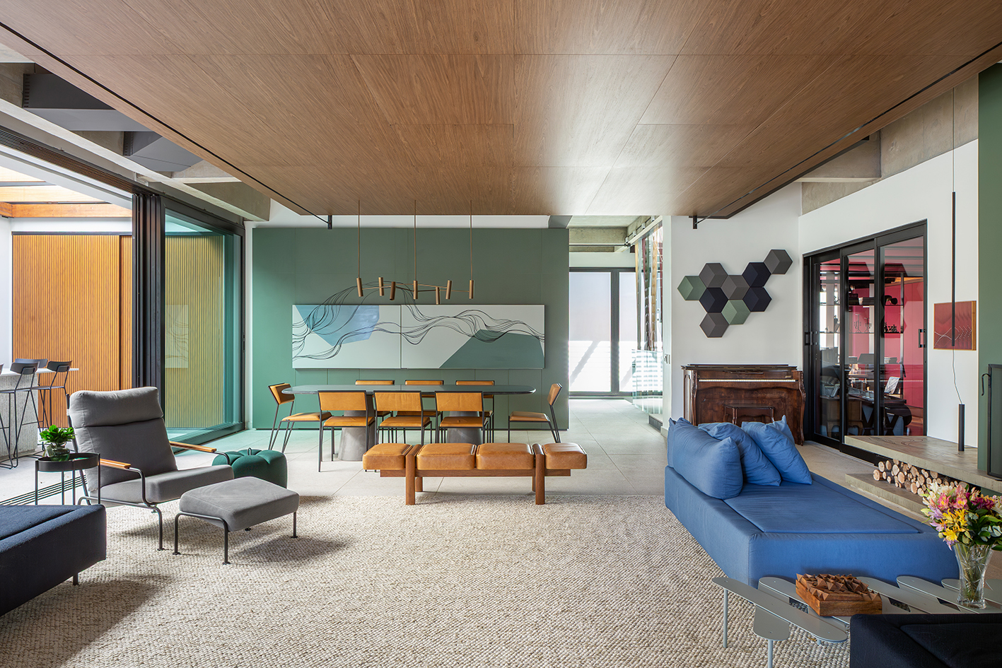 Diseñado para recibir invitados, su distribución es flexible y dinámica: sofás modulares con respaldos móviles permiten múltiples configuraciones, ya sea para cenas íntimas o fiestas animadas. Un columpio suspendido en el centro de la estancia aporta un ambiente luminoso y alegre. La cocina mantiene una sensación de intimidad, pero cuenta con una ventana retráctil que permite conectar o separar las zonas sociales, según la ocasión.