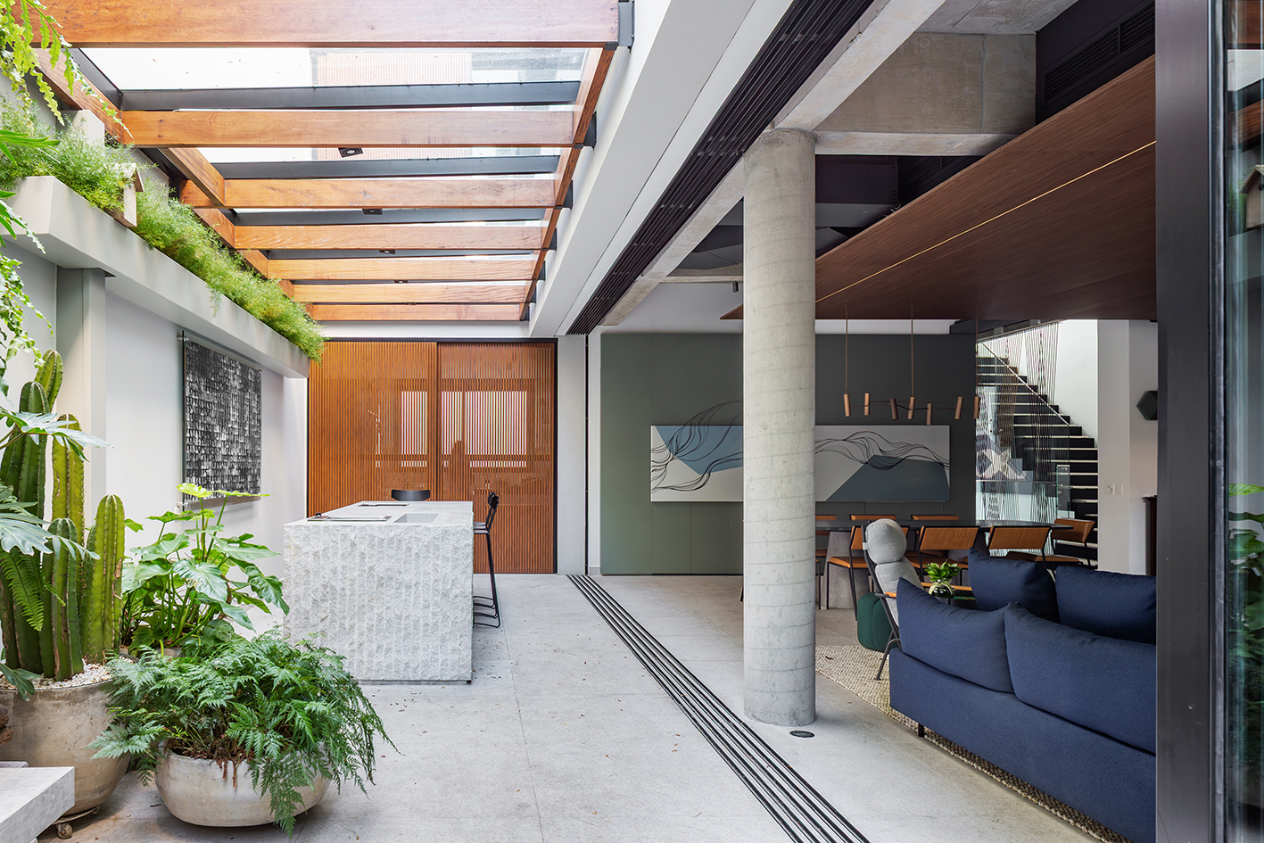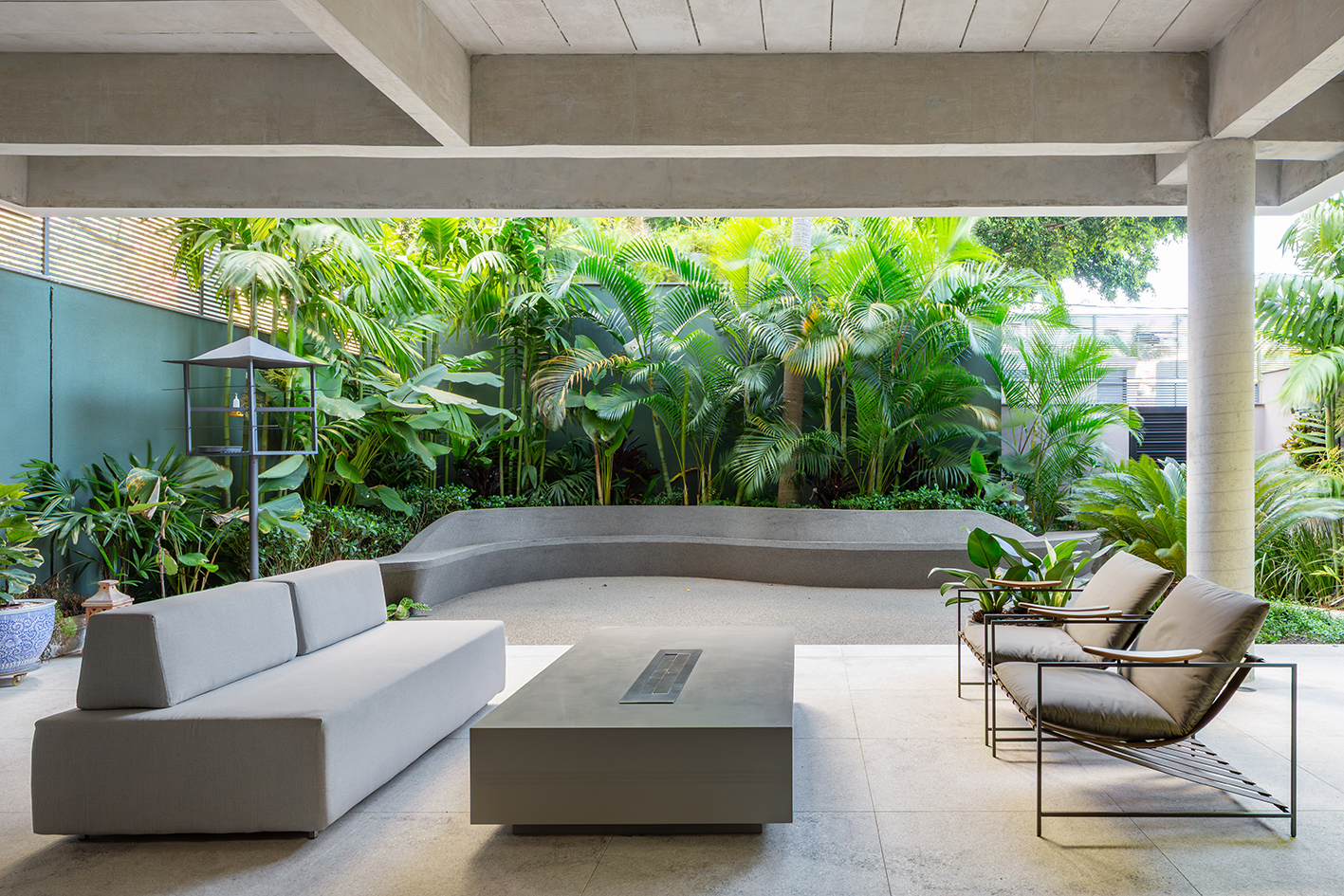 En el exterior, el paisajismo se compone de un banco hecho a medida, moldeado in situ con el mismo material que el suelo, lo que crea cohesión visual en toda la terraza. Una robusta encimera de piedra ancla la zona de cocina festiva, perfecta para comidas al aire libre, cócteles y reuniones informales.
